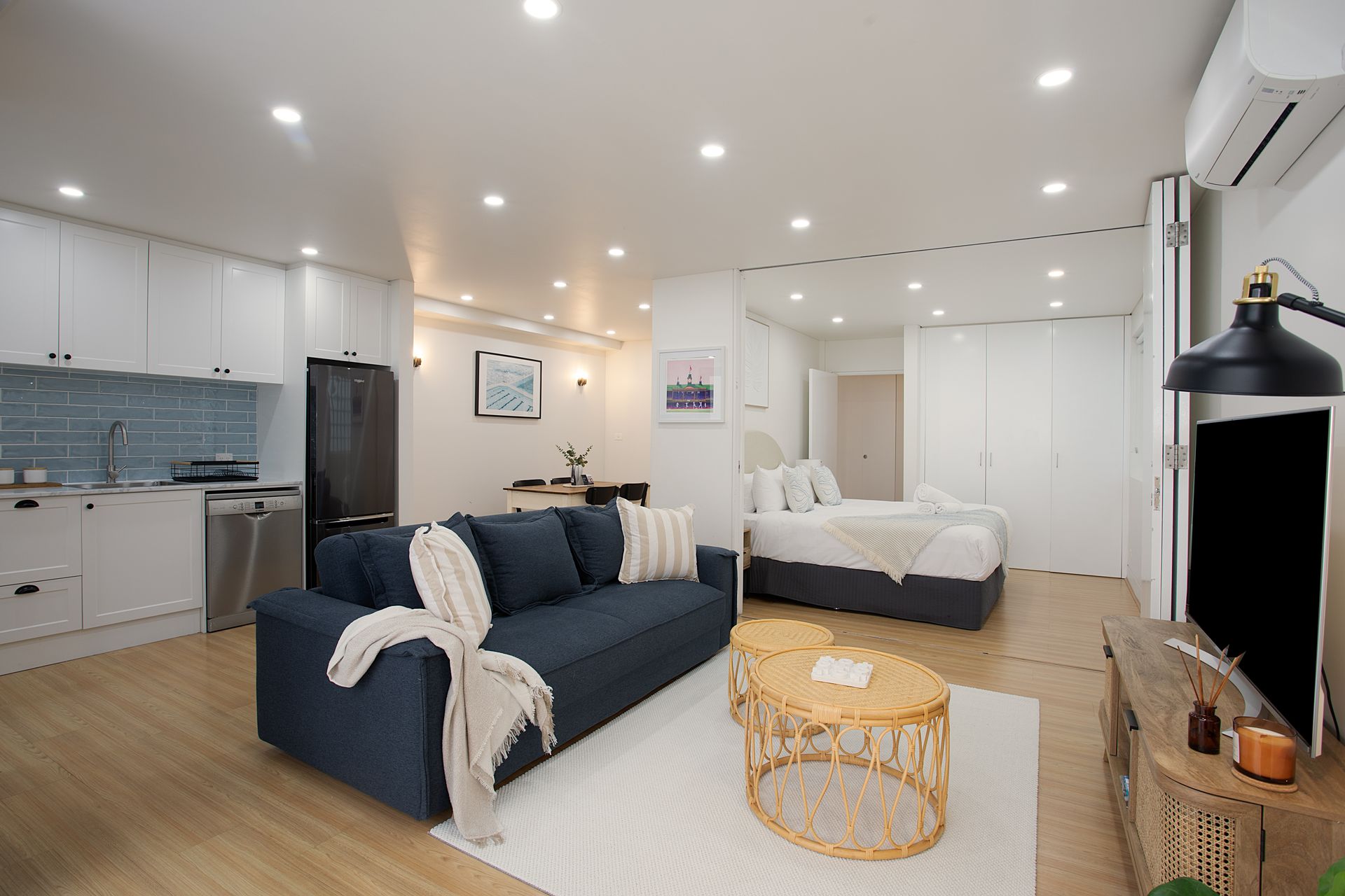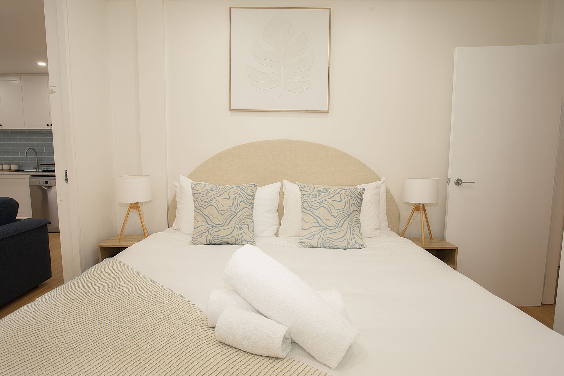 The bedroom sits within the open plan, defined by a curved upholstered headboard and abundant storage. A king bed fits comfortably, with built-in wardrobes keeping daily life organised. Morning light reaches this corner naturally, making it easy to start the day without harsh alarms. In the living area, a queen fold-out sofa provides flexible sleeping space for guests, maintaining the apartment's adaptable character.