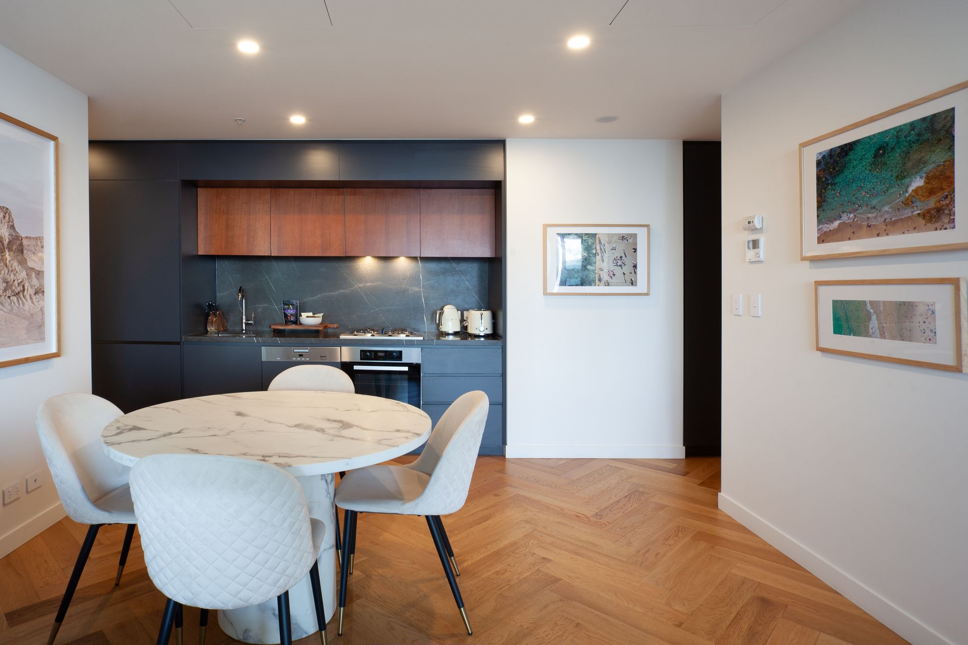 The full facilities kitchen (Miele appliances) with marble benches offers everything needed for meal preparation at your fingertips. Or forgo cooking and take a quick trip downstairs to the ideally situated ground floor restaurant for convenient on-site dining.