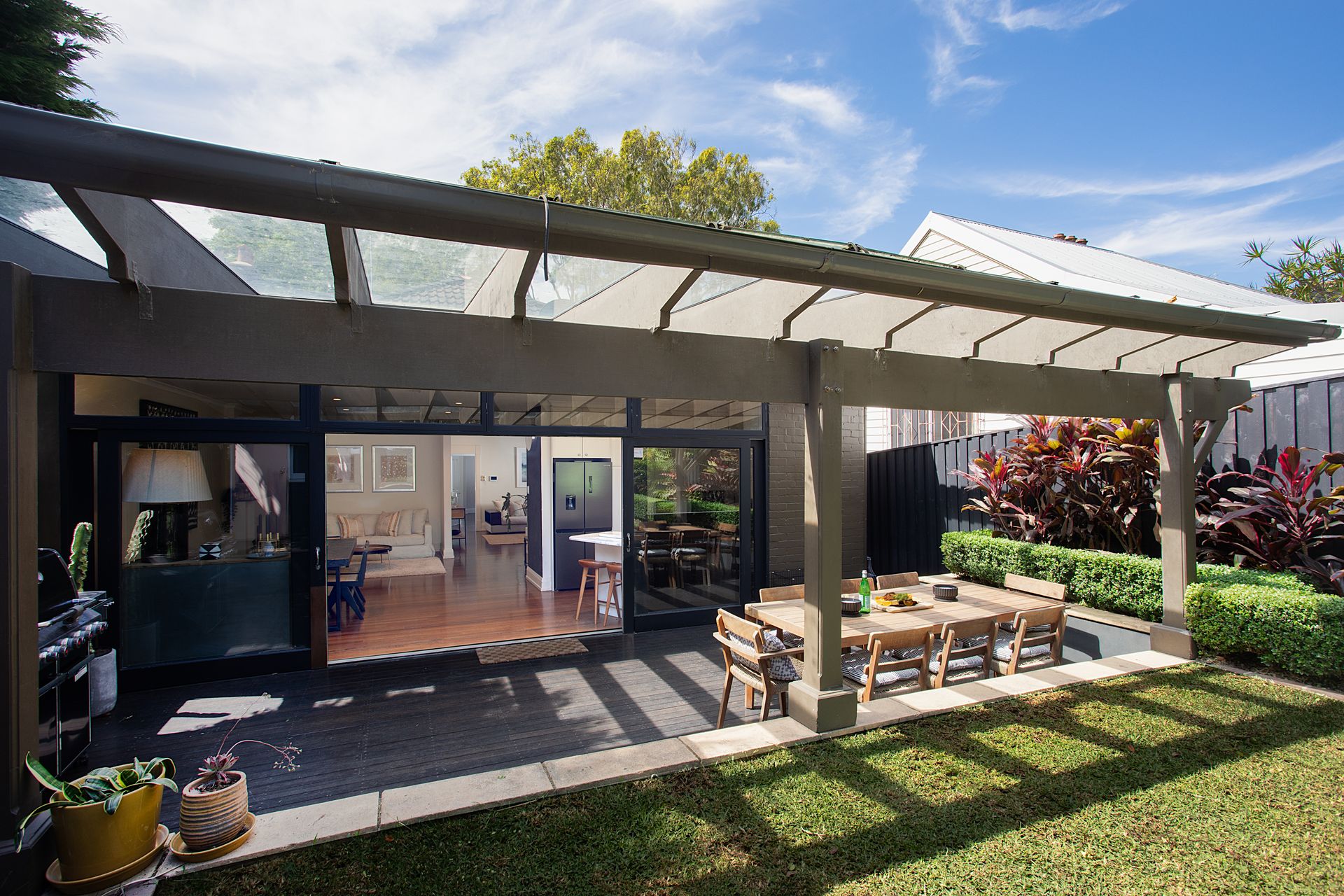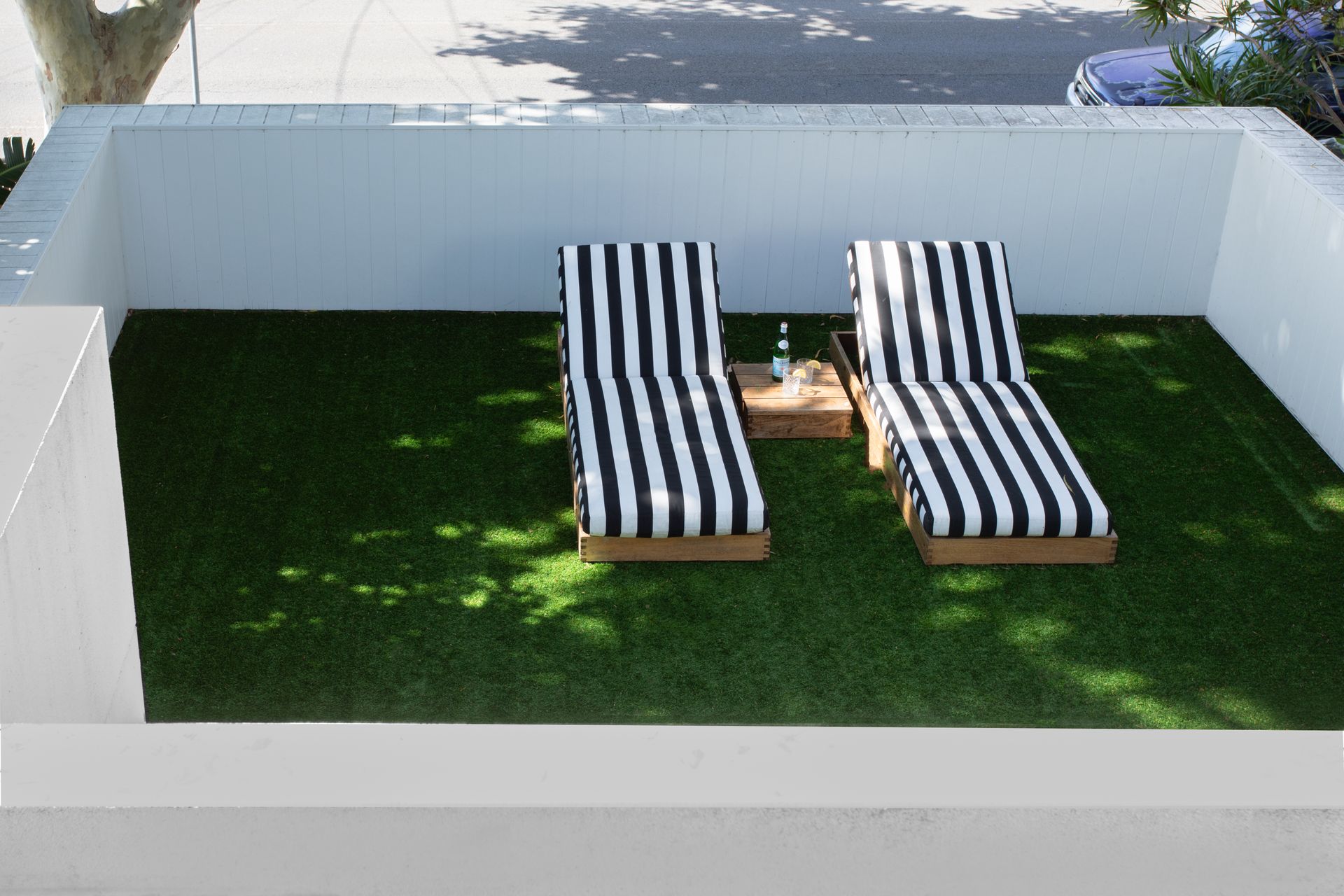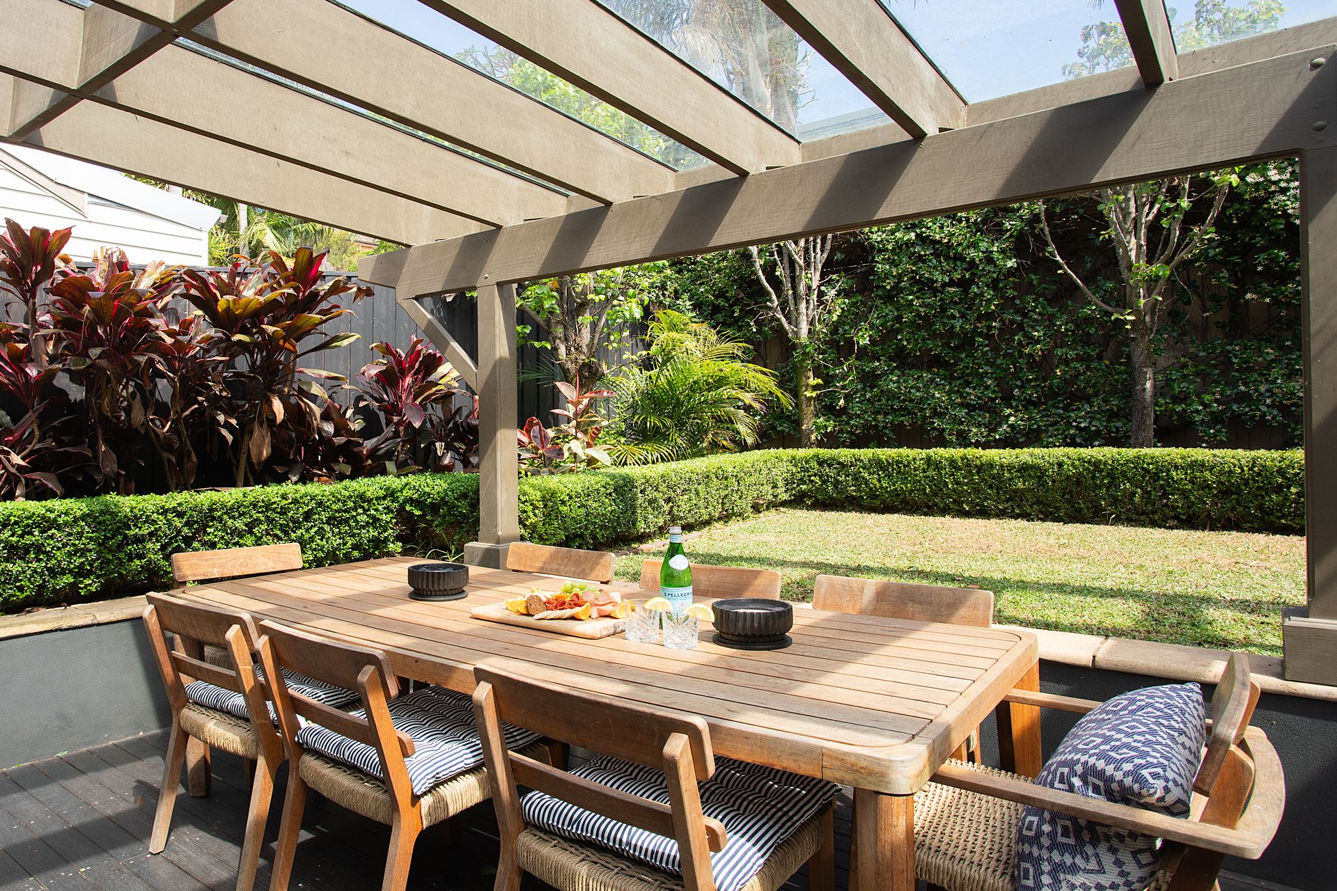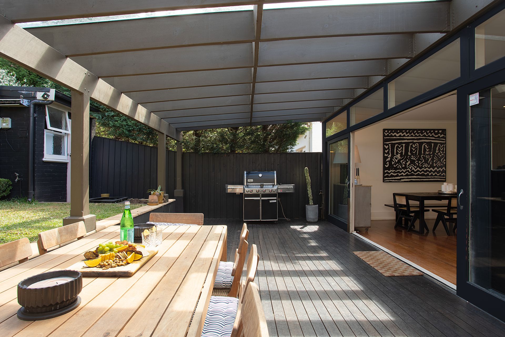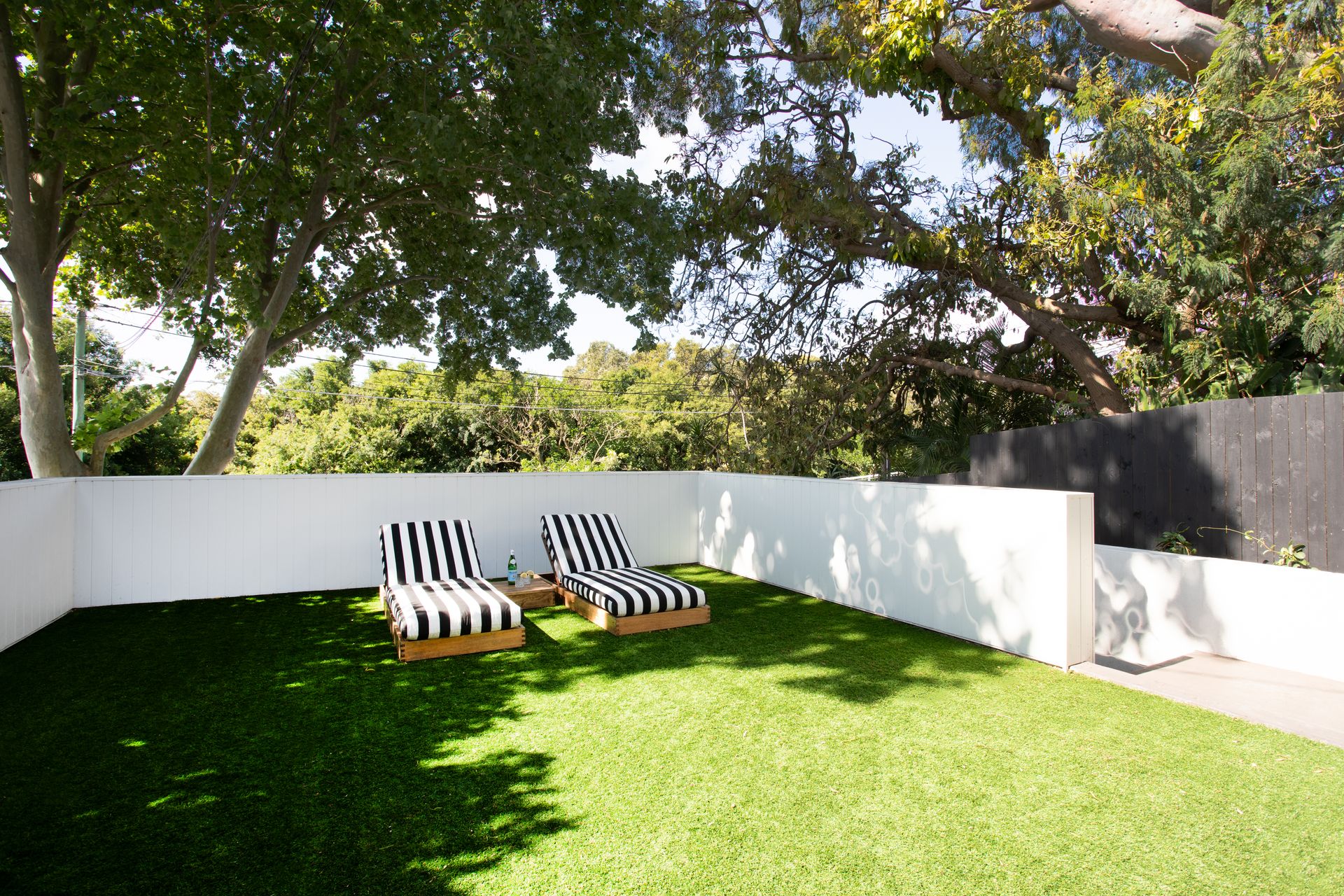 The backyard garden creates a private oasis for outdoor living. A covered entertaining area with BBQ facilities provides the perfect setting for alfresco meals, while the surrounding garden offers space to unwind. On the rooftop, artificial turf creates a lush green carpet underfoot. The space invites picnic lunches under dappled tree shade, morning yoga as the neighbourhood wakes, or alfresco dining in the evenings.