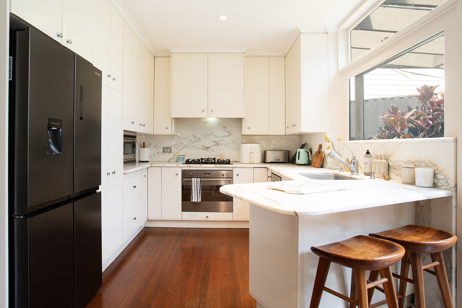 The first floor kitchen combines classic charm with modern function with quality appliances including gas oven, microwave, dishwasher and toaster handling everything from quick breakfasts to dinner parties. The adjacent dining area opens to outdoor entertaining spaces, where meals extend naturally to the backyard and BBQ area beneath open skies. Cook and gather with ease in this light filled heart of the home.