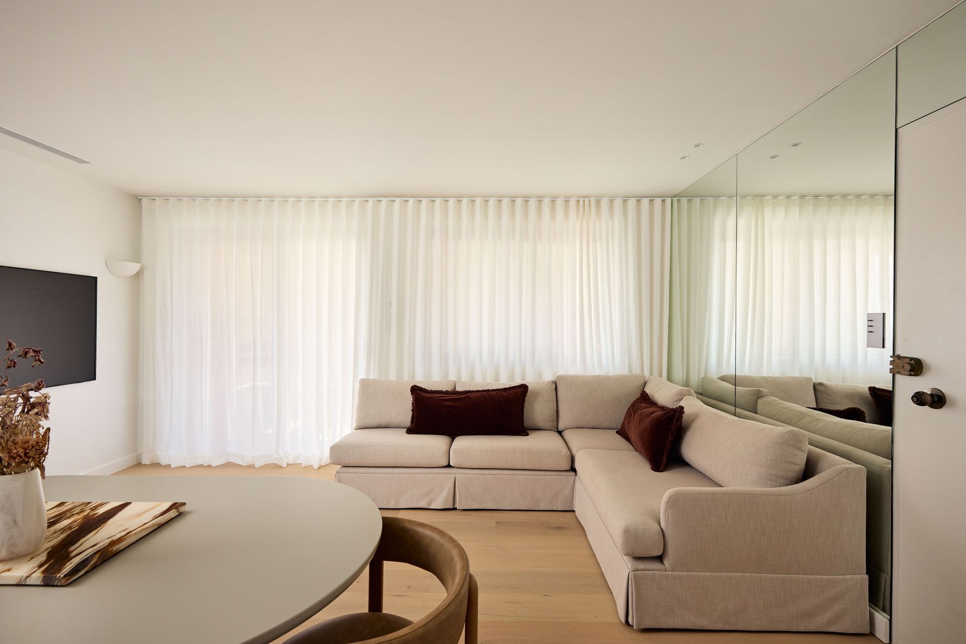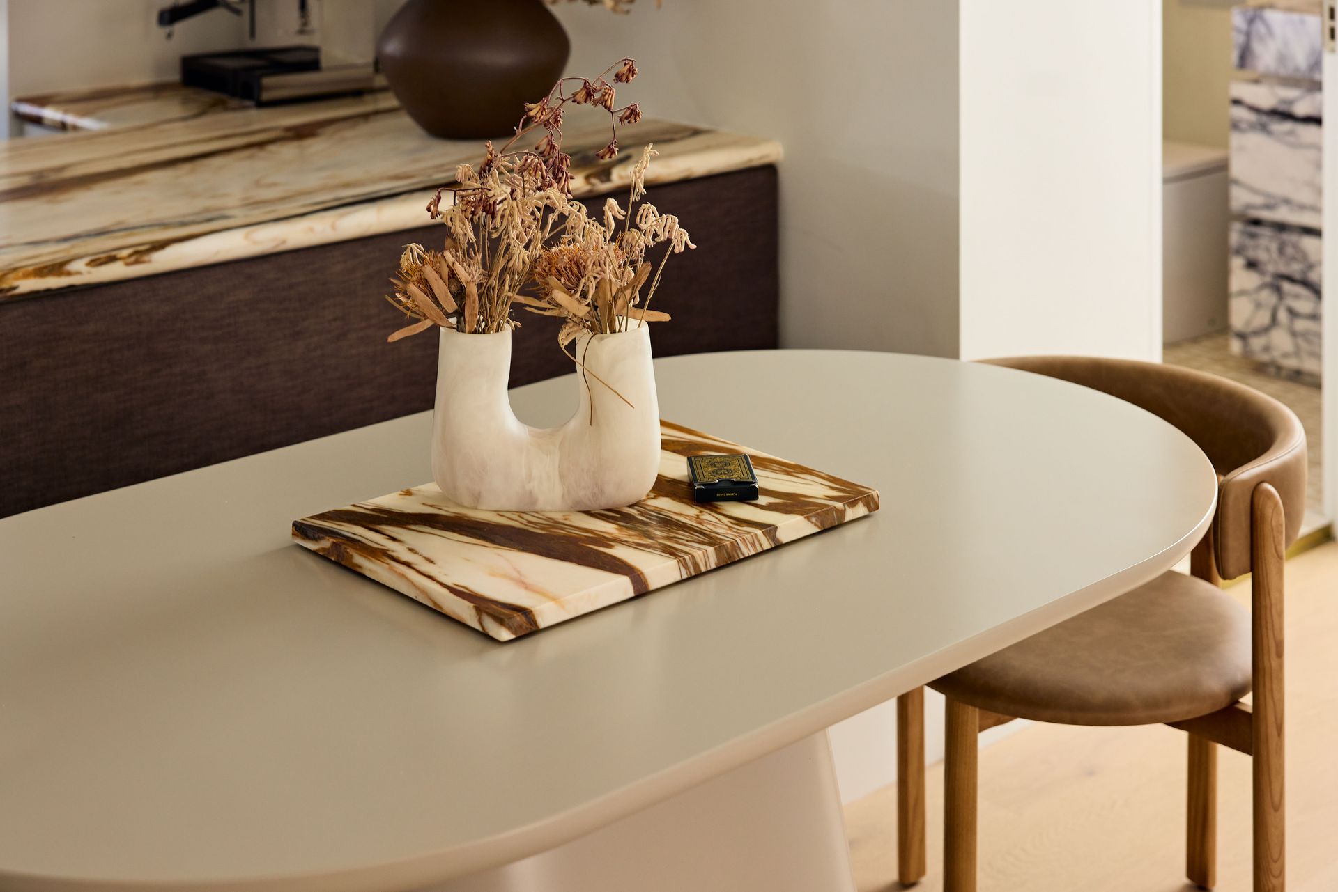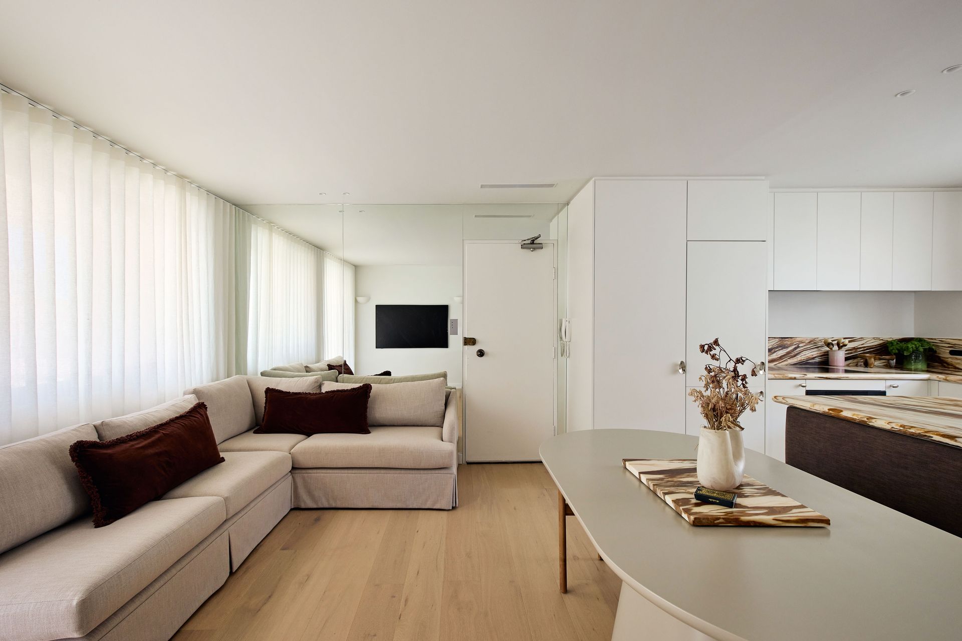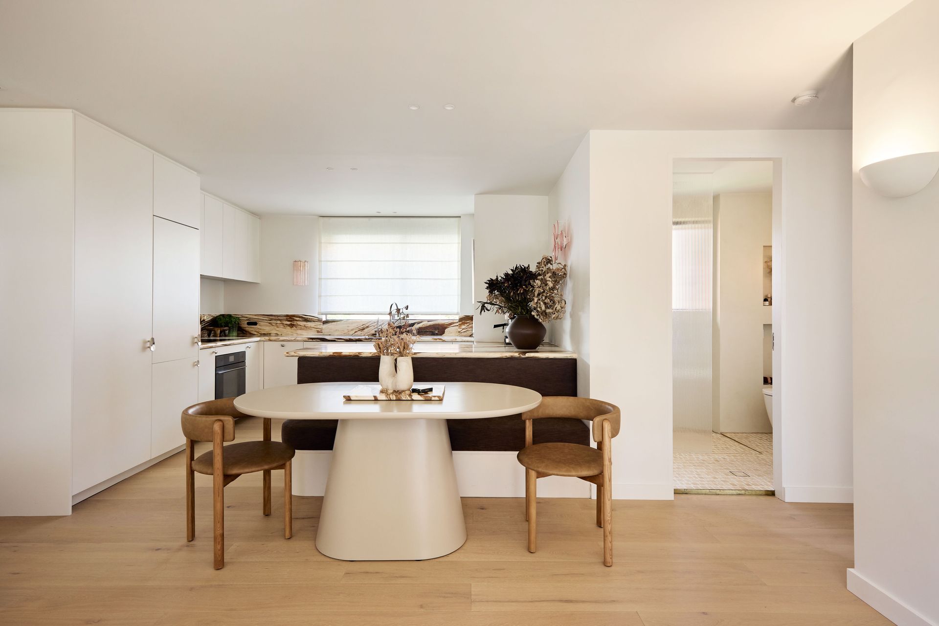 Designed by SMAC Studio with a level of detail and material quality that feels closer to a boutique hotel than a typical rental, sheer floor-to-ceiling curtains frame sweeping views of Bondi Beach from both the living room and bedroom, while a private balcony draws in the ocean breeze. The interiors are anchored by a marble kitchen island, custom joinery, Astra Walker tapware, polished nickel hardware, and heated travertine floors; every element thoughtfully selected and refined.. The open-plan living and dining area flows naturally toward the kitchen, where a Leica espresso machine sits on the marble benchtop alongside a fully equipped kitchen ready for everything from a quick breakfast to an evening in. A bespoke oval dining table with banquette seating and timber chairs creates an intimate space to gather. The dedicated study, furnished with a beautiful burl wood desk and leather chair, is the ideal work-from-home setup. The bedroom is generous and quiet, fitted with a quality queen bed and ample storage, while the bathroom is a considered space featuring a hand-carved marble stone basin, gold-framed mirror, and warm ambient lighting. The apartment also includes in-unit laundry, one secure undercover car space, and ducted air conditioning throughout, every practical need conveniently covered.