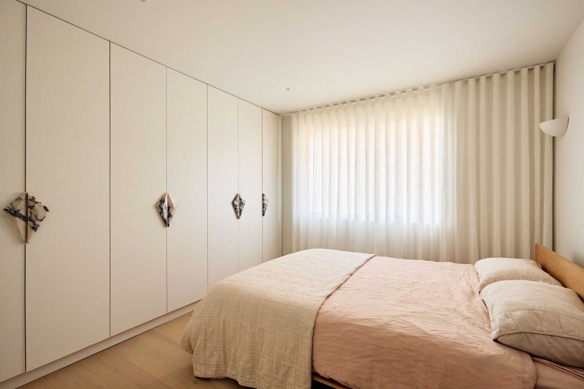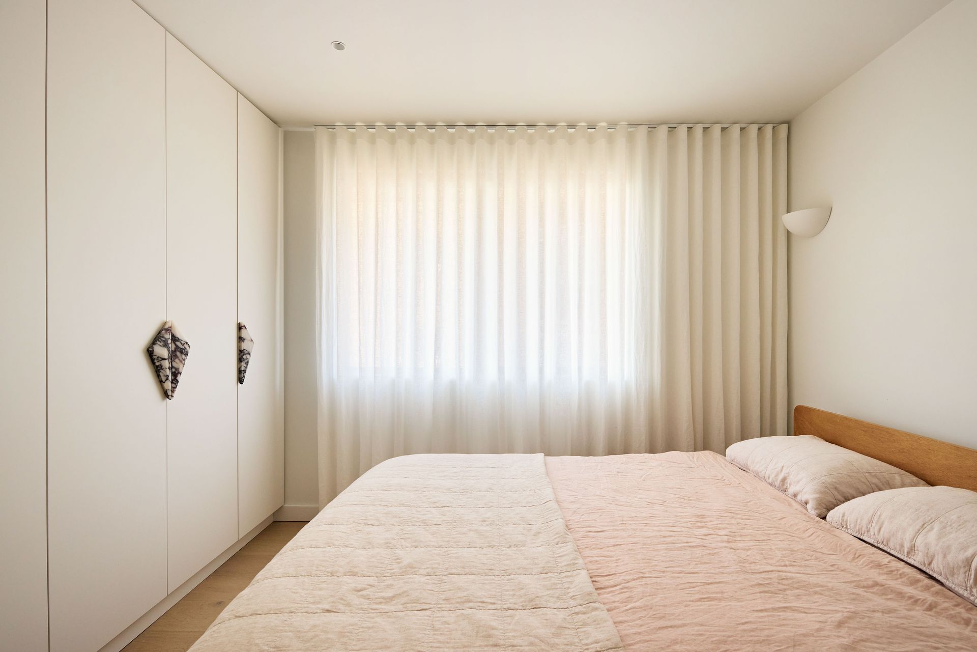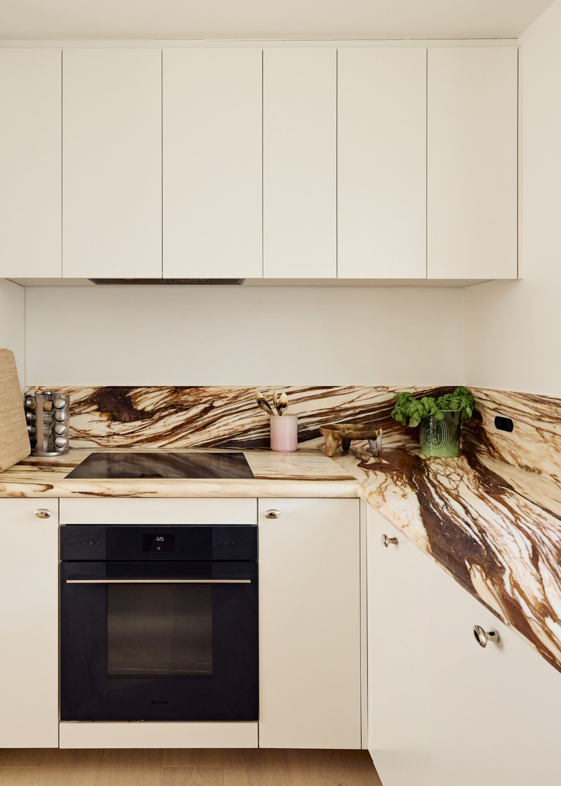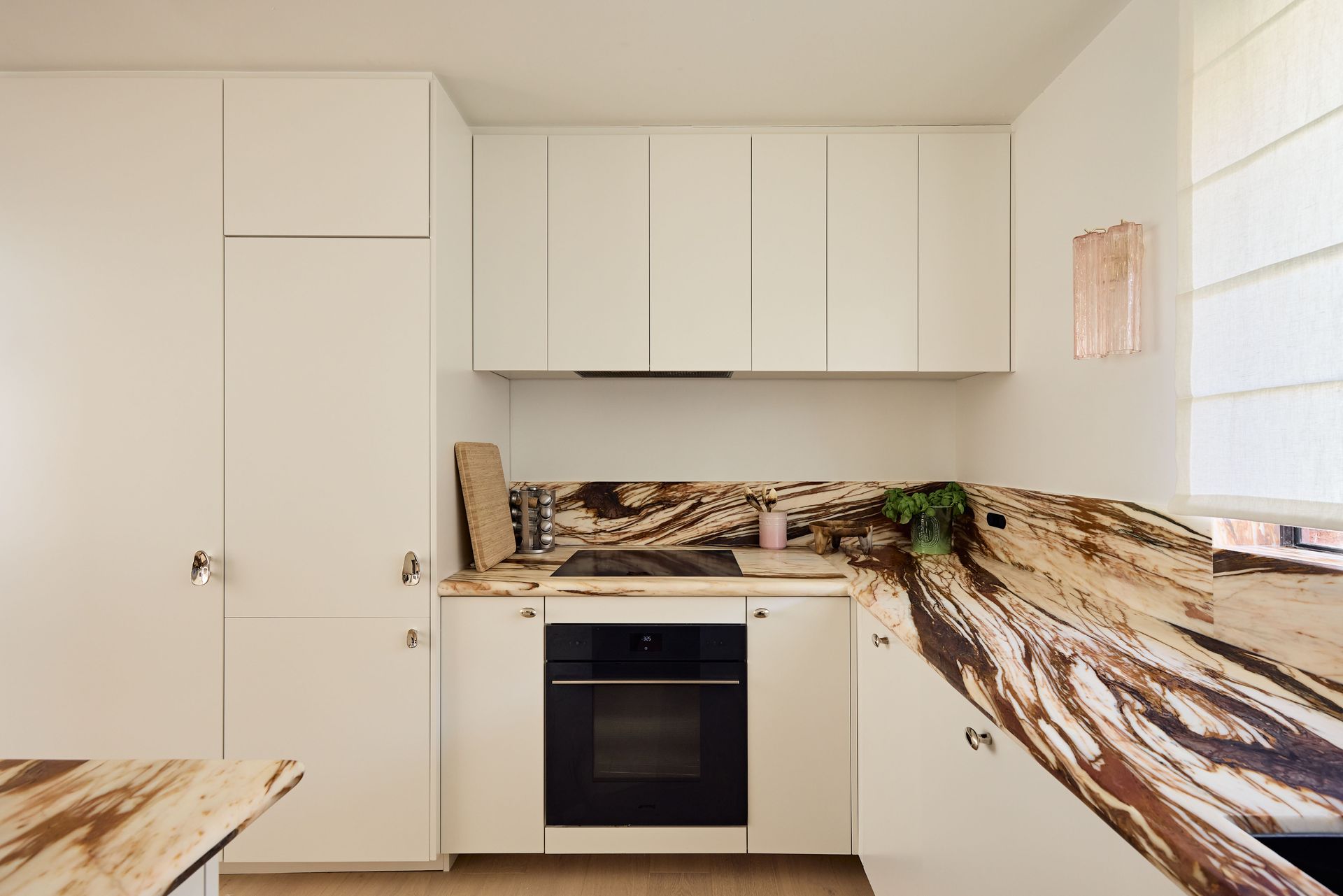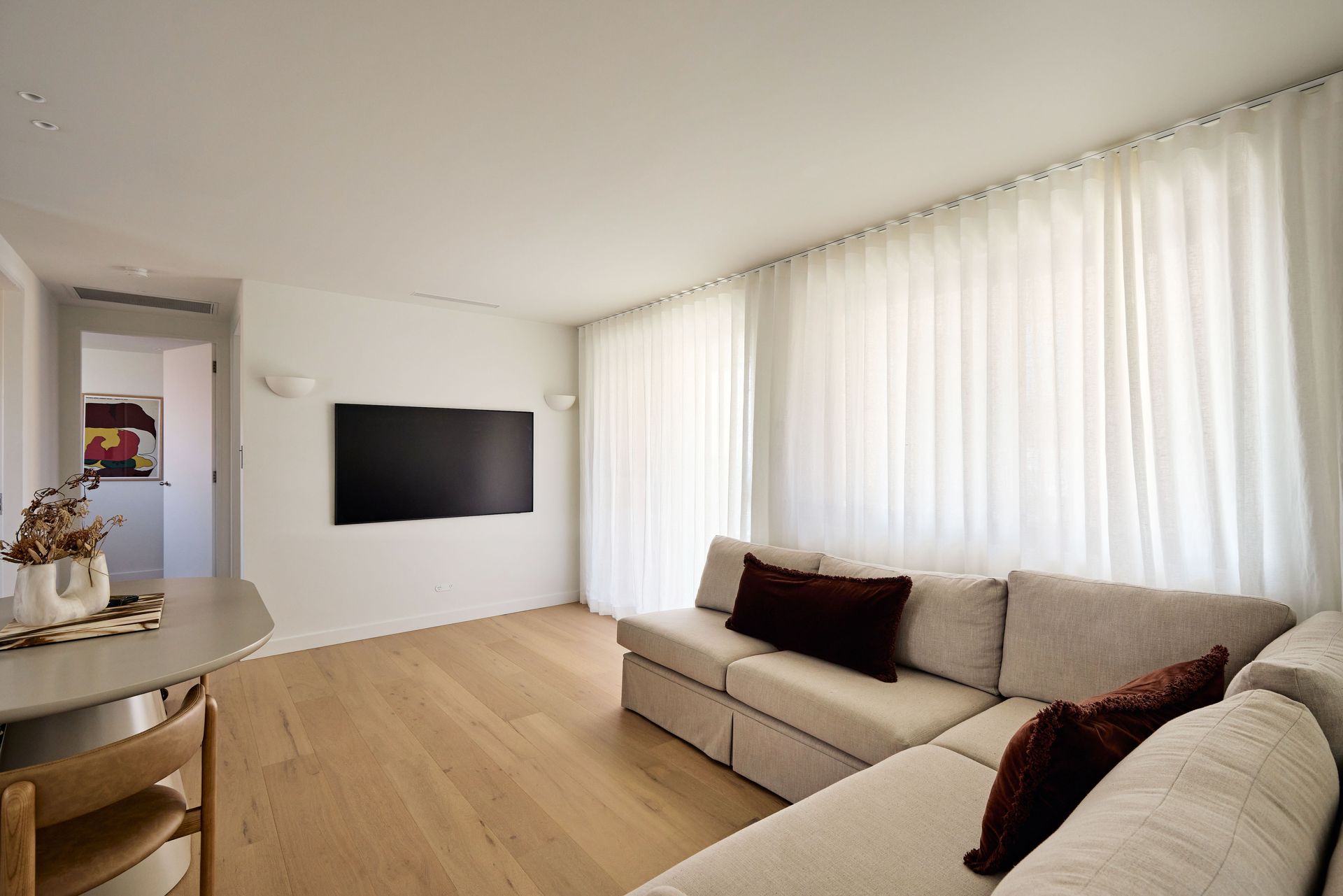 Designed by SMAC Studio with a level of detail and material quality that feels closer to a boutique hotel than a typical rental, sheer floor-to-ceiling curtains frame sweeping views of Bondi Beach from both the living room and bedroom, while a private balcony draws in the ocean breeze. The interiors are anchored by a marble kitchen island, custom joinery, Astra Walker tapware, polished nickel hardware, and heated travertine floors; every element thoughtfully selected and refined.. The open-plan living and dining area flows naturally toward the kitchen, where a Leica espresso machine sits on the marble benchtop alongside a fully equipped kitchen ready for everything from a quick breakfast to an evening in. A bespoke oval dining table with banquette seating and timber chairs creates an intimate space to gather. The dedicated study, furnished with a beautiful burl wood desk and leather chair, is the ideal work-from-home setup. The bedroom is generous and quiet, fitted with a quality queen bed and ample storage, while the bathroom is a considered space featuring a hand-carved marble stone basin, gold-framed mirror, and warm ambient lighting. The apartment also includes in-unit laundry, one secure undercover car space, and ducted air conditioning throughout, every practical need conveniently covered.