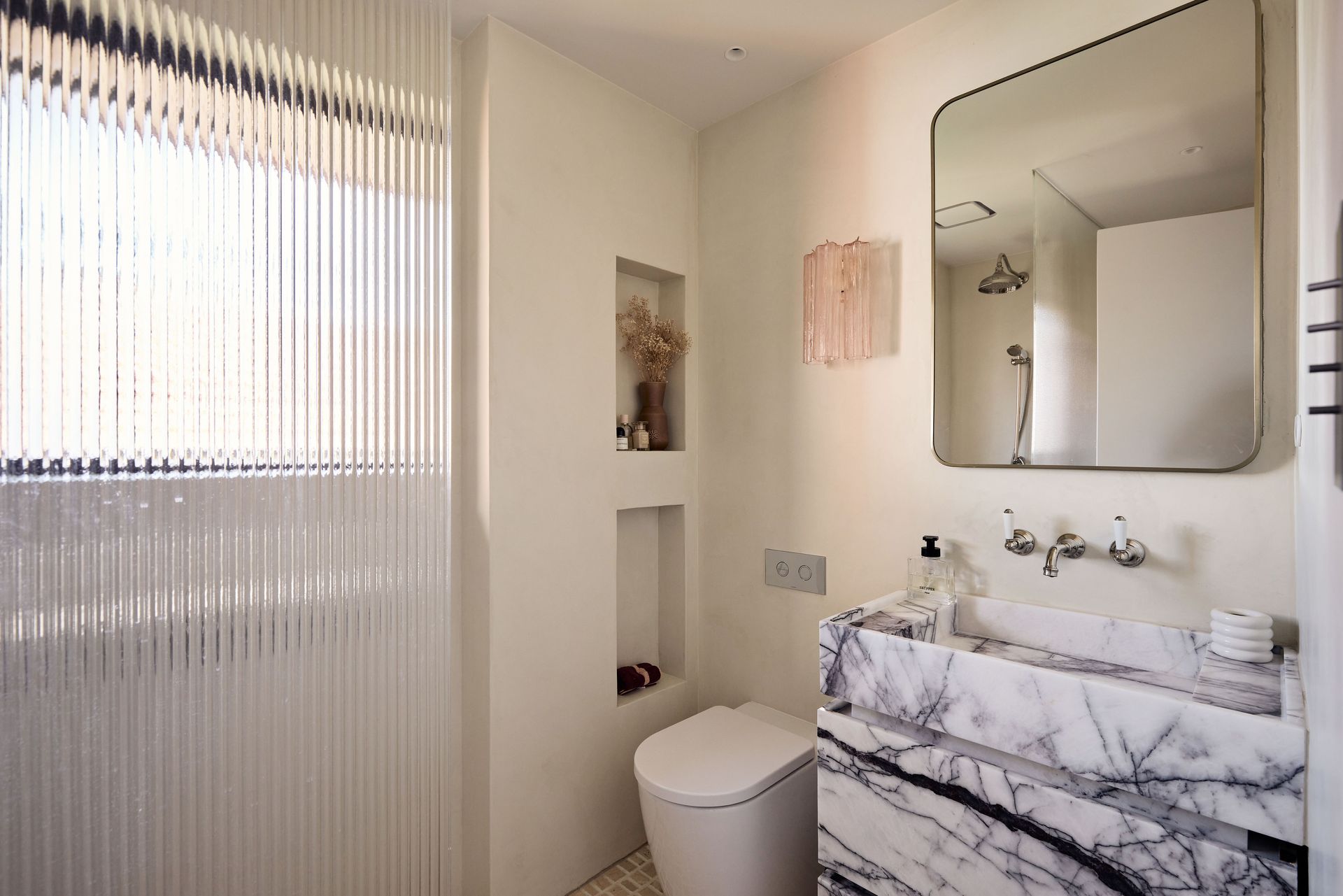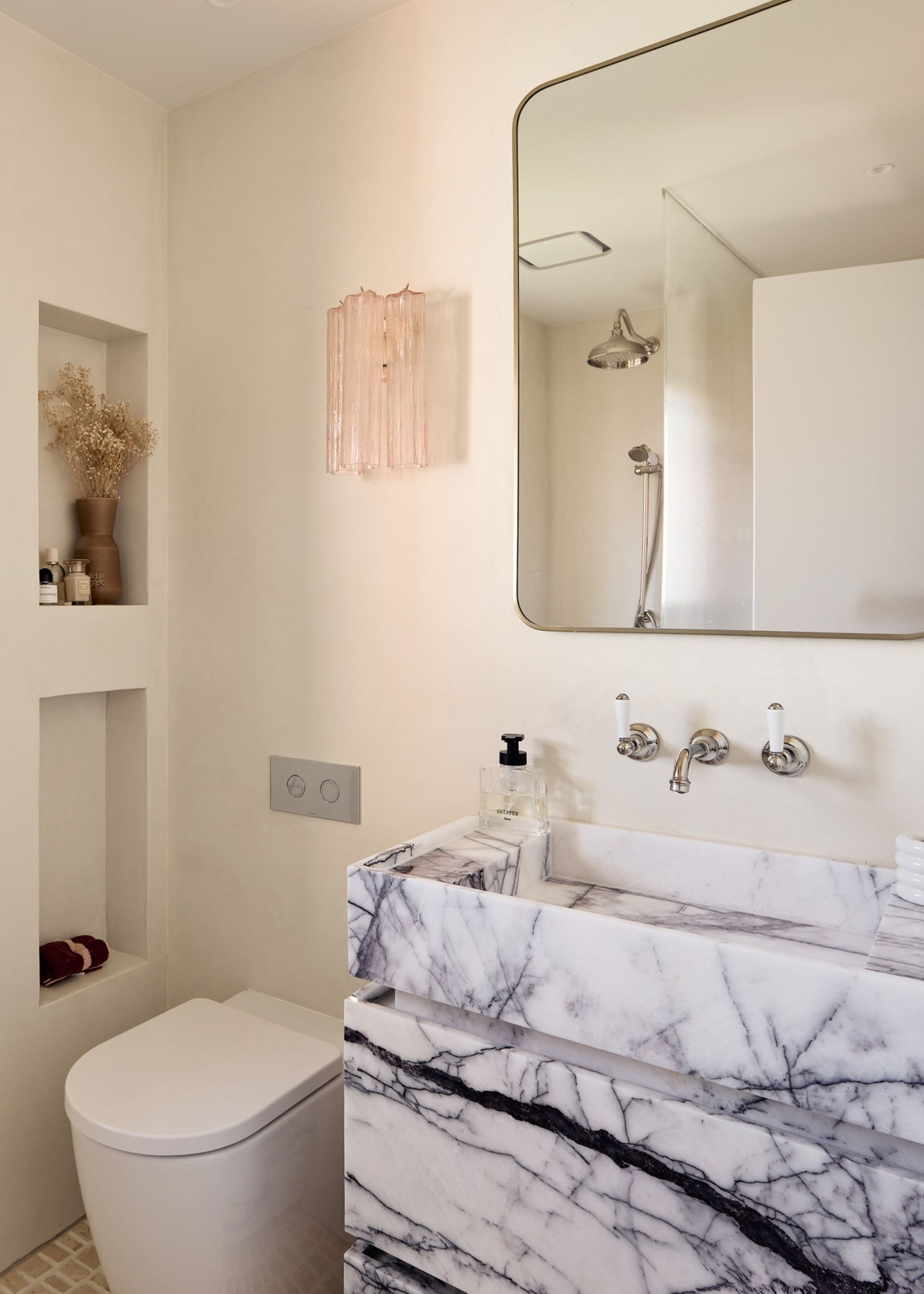 - Marble stone bathroom with gold-framed mirror and ambient lighting