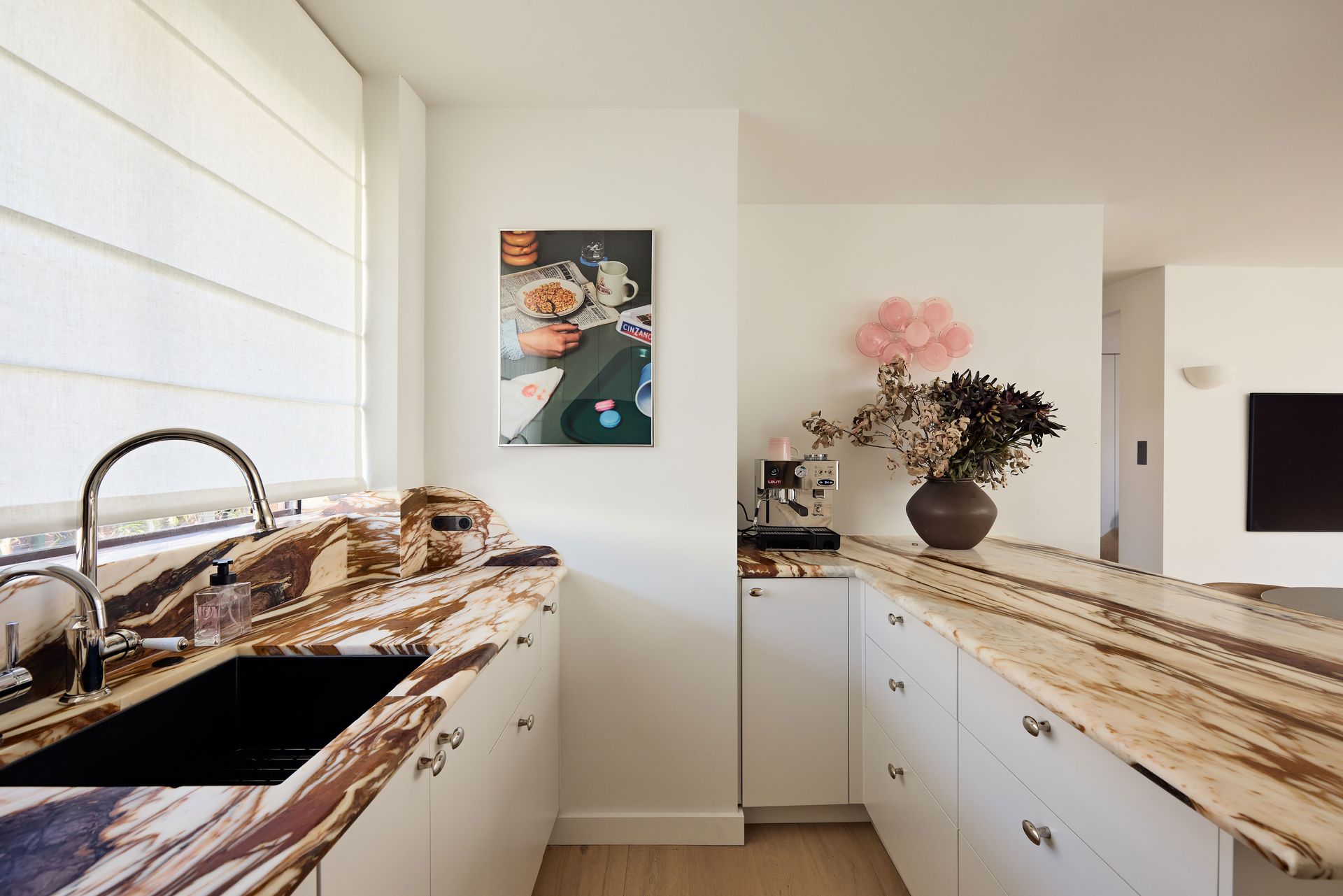 - Marble kitchen benchtops, custom joinery, heated travertine floors