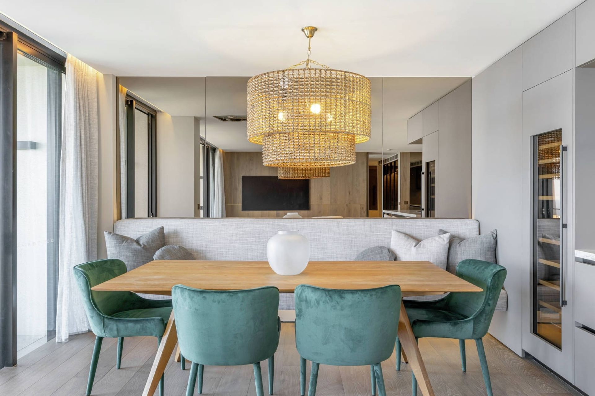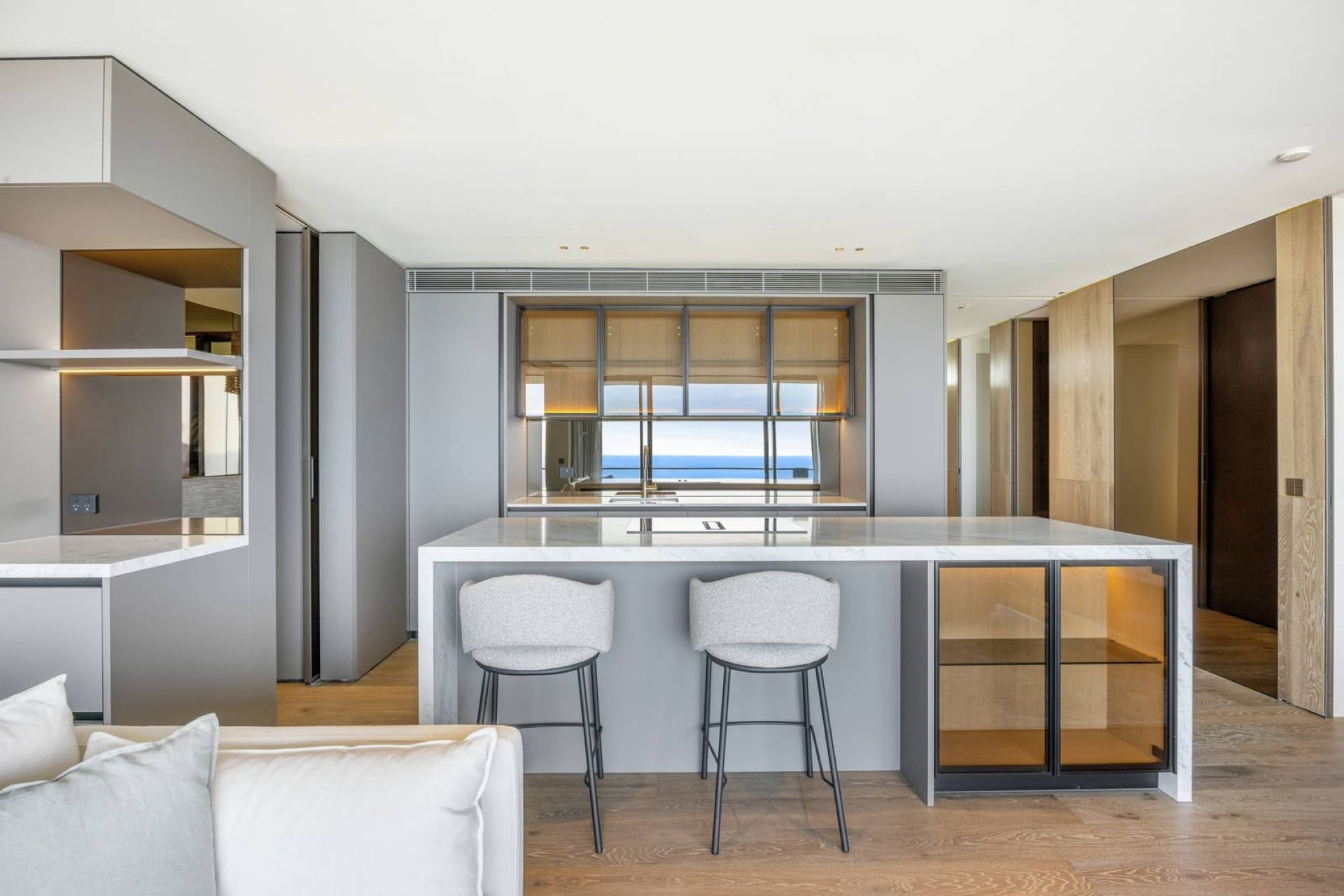 The kitchen merges form with function through clean lines and premium appliances. An integrated Liebherr wine storage cabinet sits alongside dedicated coffee and cocktail bar, ready for entertaining or quiet evenings. Dining unfolds against ocean views that shift from dawn light to sunset glow. Whether hosting dinner parties or casual breakfasts, the sea remains your constant companion.