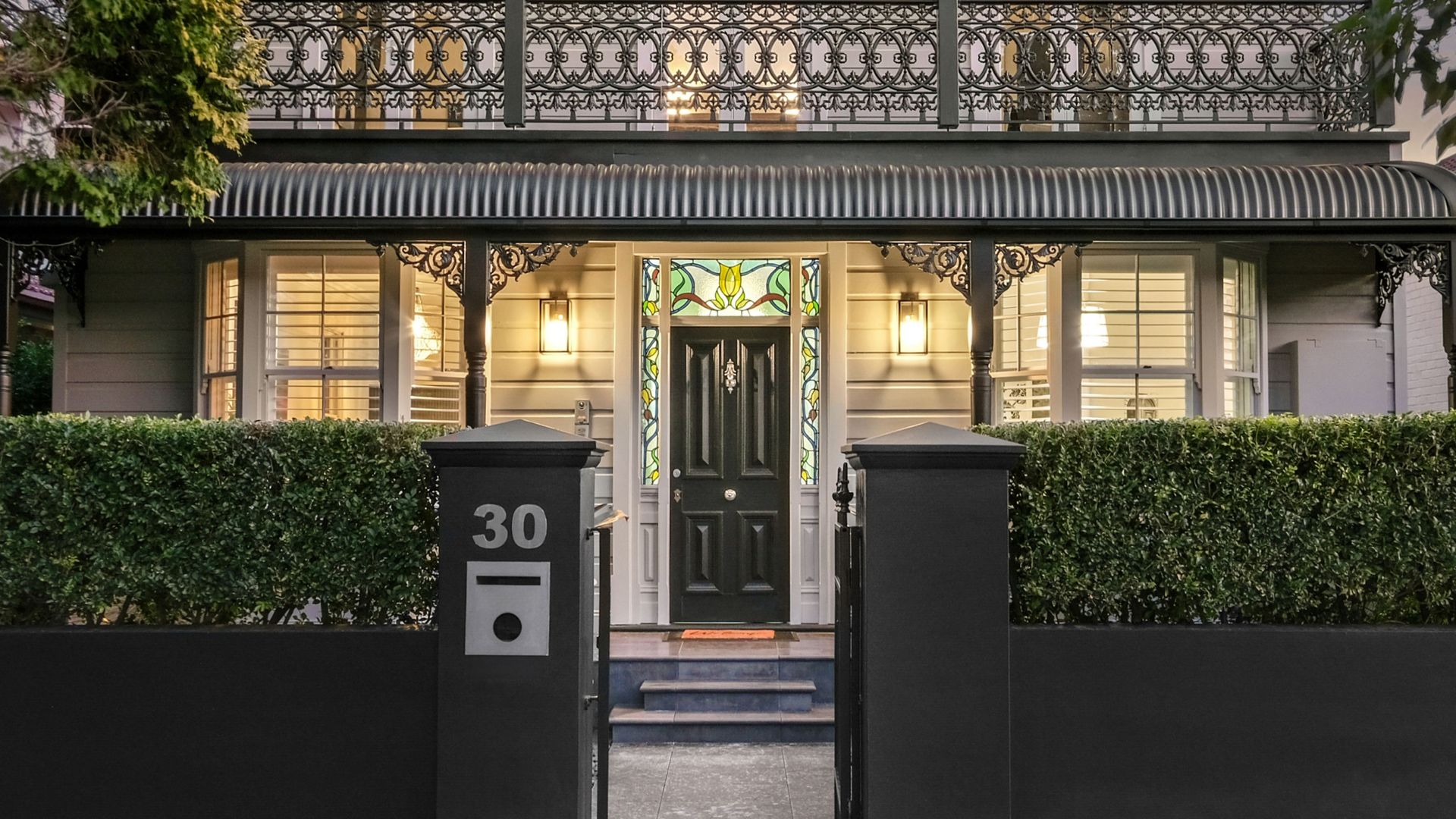 The living area is rich with character, ornate plaster cornices, a decorative fireplace, dark hardwood floors and a striking chandelier overhead anchoring the space with old-world elegance. The kitchen is a sleek modern contrast: dark ribbed cabinetry, a marble-effect splashback, induction cooktop and a French-door fridge bring clean, contemporary energy to a room full of heritage soul. The master bedroom is dressed in crisp white linen with an ornate iron bed frame, plantation shutters and a pendant light, while the second bedroom brings a burst of personality, a vivid fox mural dominates the feature wall, complemented by playful modular shelving and a double and single bed, making it a striking and comfortable space for any guest. The bathroom is a spa-like retreat: double stone basins set beneath a textured feature wall, a freestanding bath and separate shower complete the picture.