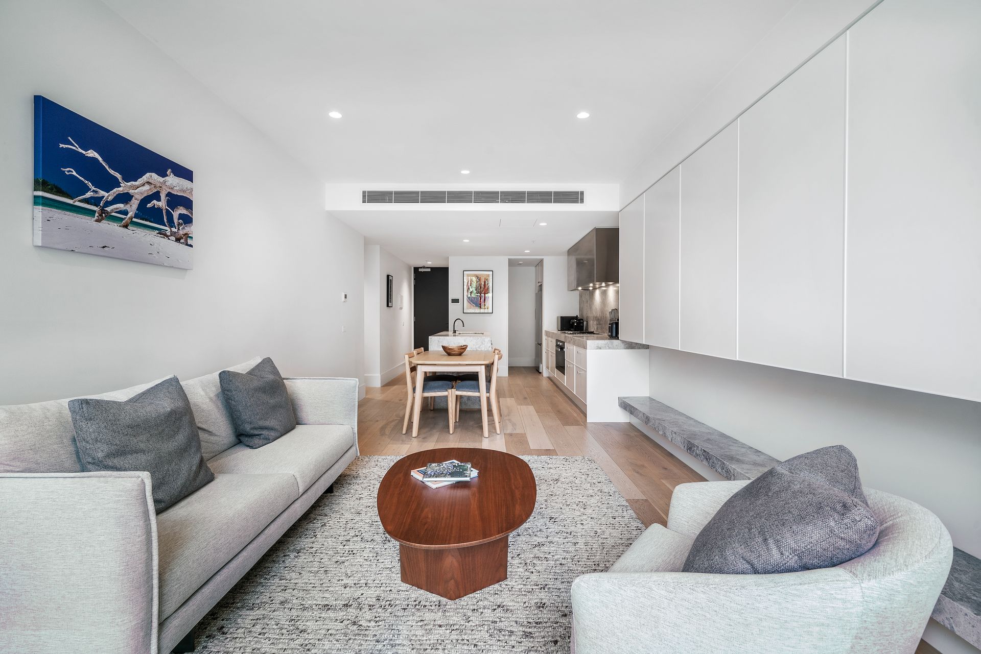 Step inside and experience an open plan living and dining area where wide plank timber floors, crisp white walls and abundant natural light create an easy, uncluttered calm. The kitchen runs alongside, finished in honed stone benchtops on both sides, with a gas cooktop, professional range hood, stainless steel oven, dishwasher and generous cabinetry. The eye travels straight through the dining area to the floor-to-ceiling glass sliding door, which opens to a large private courtyard, the home's natural gathering place. Walled for complete privacy and planted with bamboo and tropical greenery along the perimeter, the courtyard holds a full outdoor dining table that seats six, a plush lounge setting for long afternoons, and a Weber BBQ ready for any occasion. The master bedroom is a serene retreat with a queen bed, built in robes and a private ensuite finished in full height stone tile, featuring a rain shower, matte black fixtures, freestanding soaking bath and a floating stone vanity with illuminated mirrored cabinet. The second bedroom offers a versatile double bed that converts to a sofa configuration, with built -in robes and ducted air conditioning overhead. A full main bathroom in matching stone tile serves this bedroom and guests, while ducted heating and cooling runs throughout the entire apartment. An internal laundry with washer and dryer and two secure car spaces complete a home that has genuinely thought of everything.
