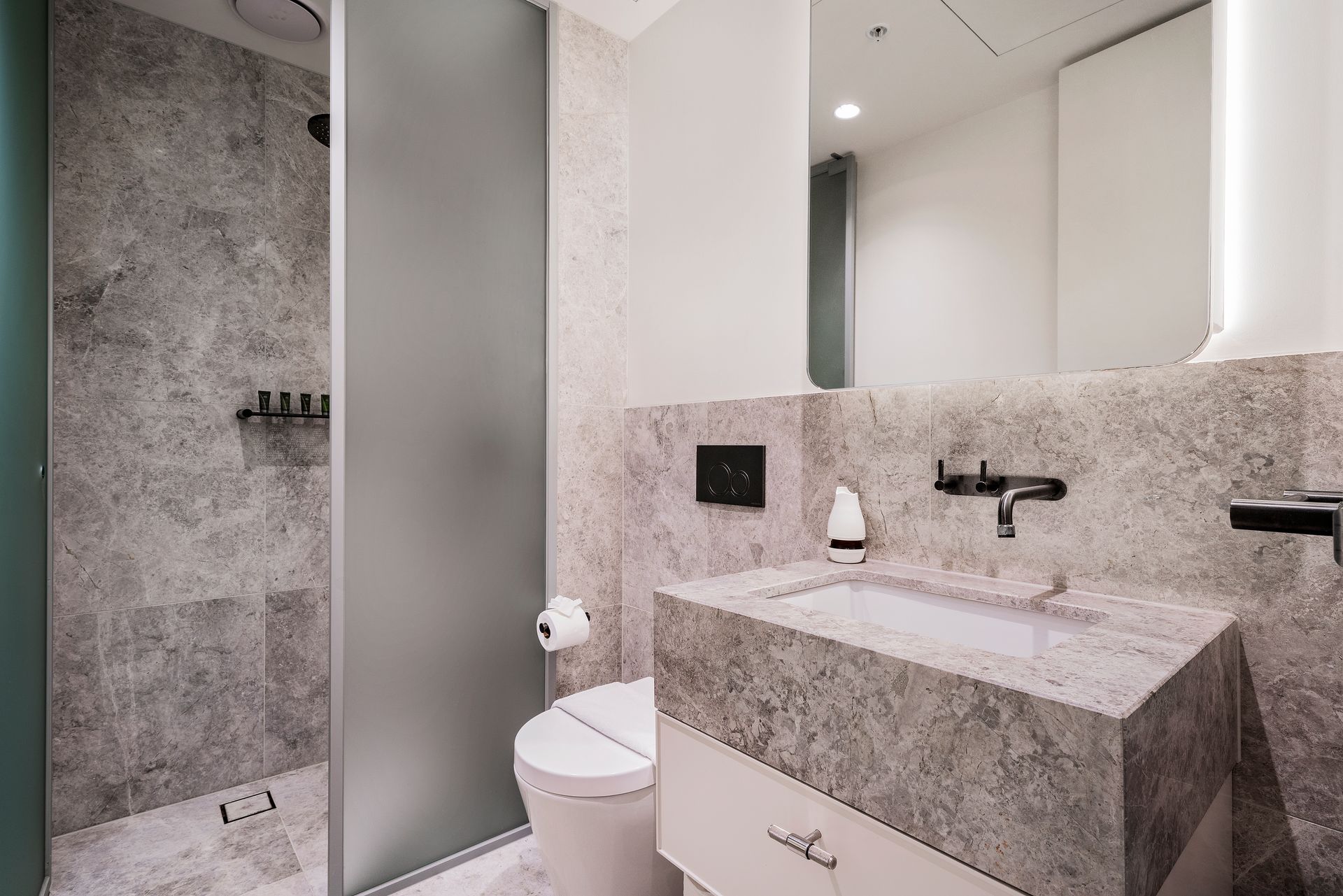 - Full main bathroom finished in full-height stone tile with quality chrome fixtures