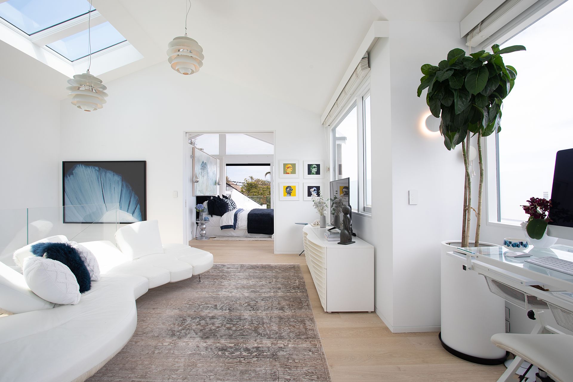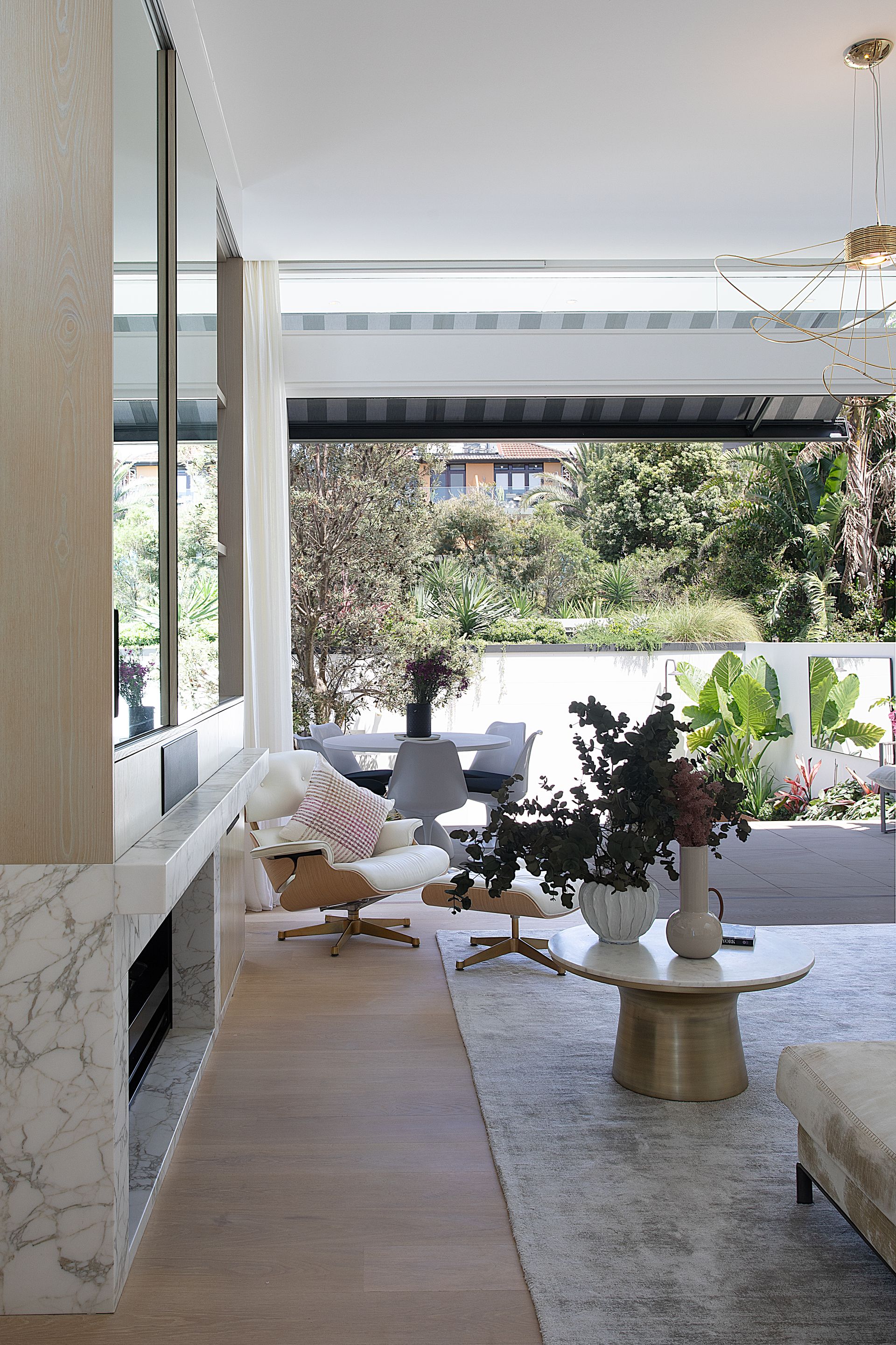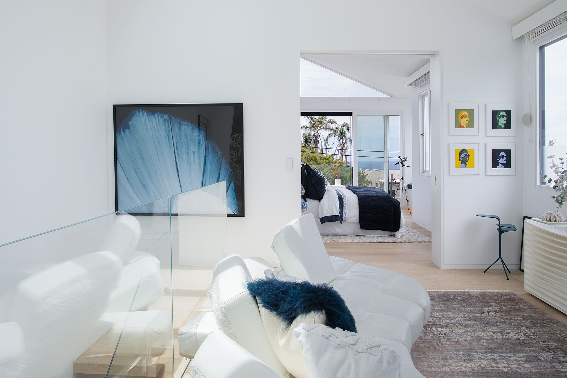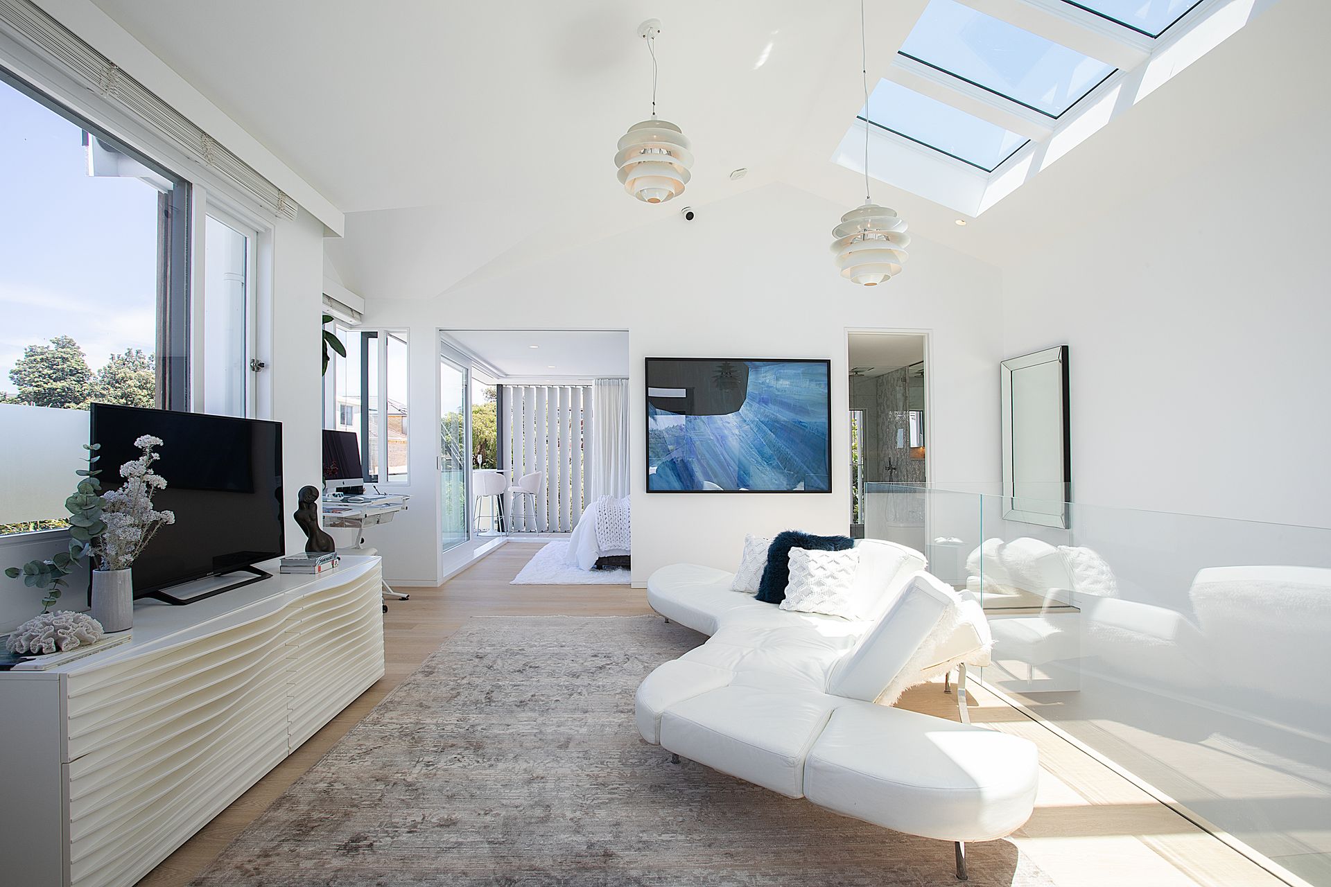 The ground floor unfolds as a continuous living canvas, where light floods through vast windows and dances across solid marble surfaces throughout the day. A Heatmaster gas fireplace anchors the main living space, framed by bespoke architectural lighting that creates warmth long into the evening. The open plan design flows effortlessly to a sandstone terrace and landscaped garden, blurring the line between inside and out. Upstairs, a second living retreat offers soundproofed privacy, complete with television and integrated office space, perfect for those seeking quiet corners away from the main gathering areas. Custom daybeds nestle into alcoves throughout, inviting you to pause and absorb those ever-changing ocean views.