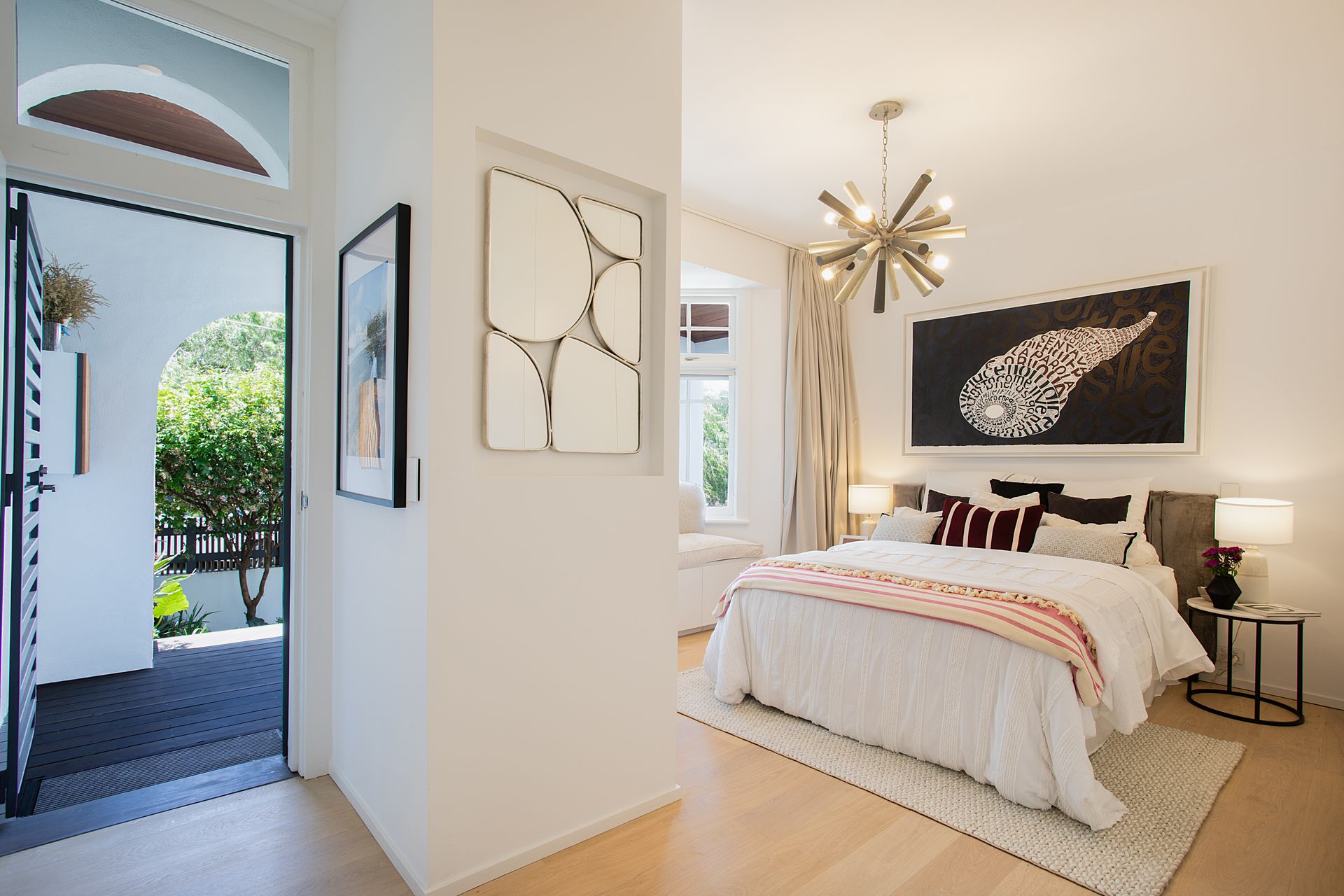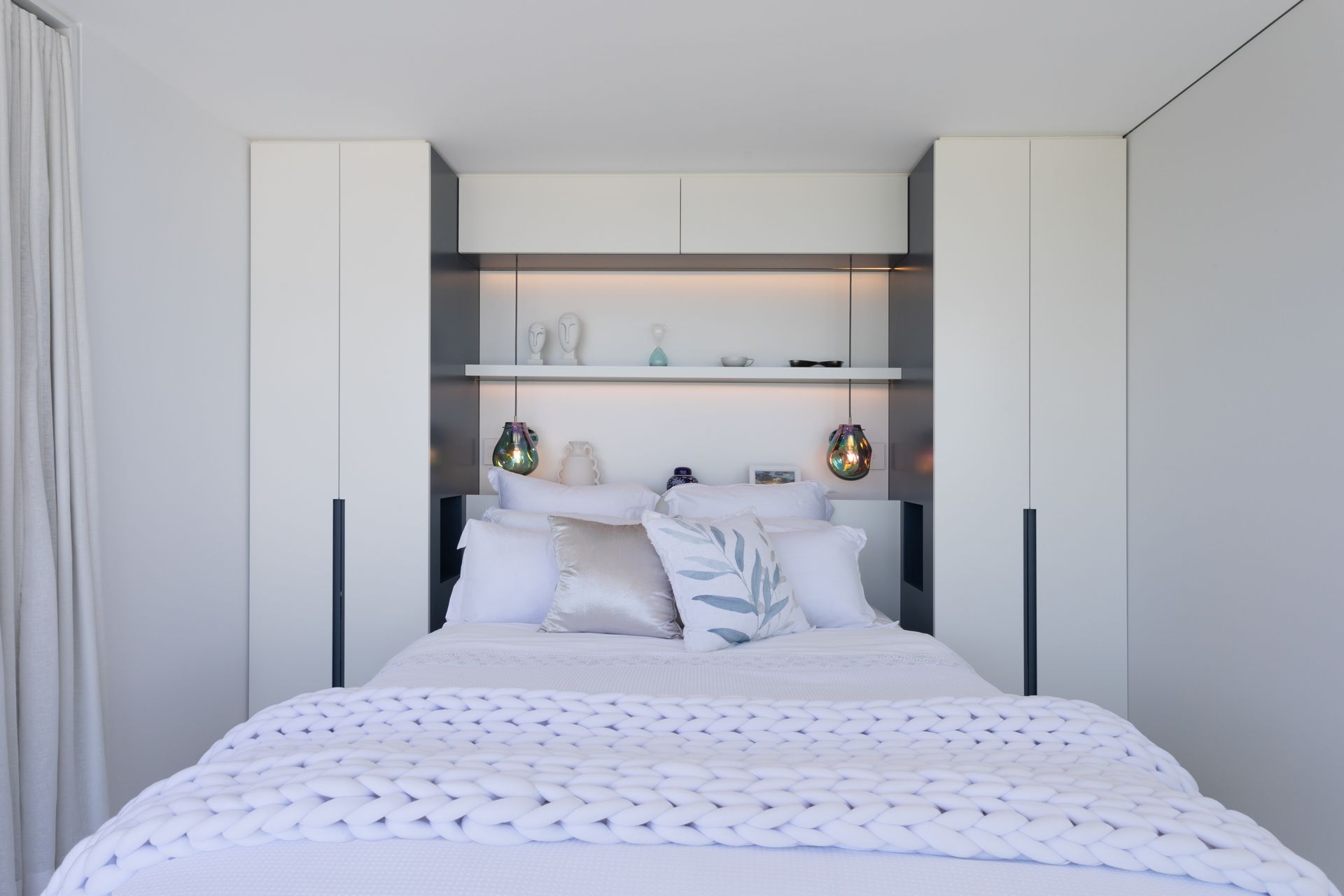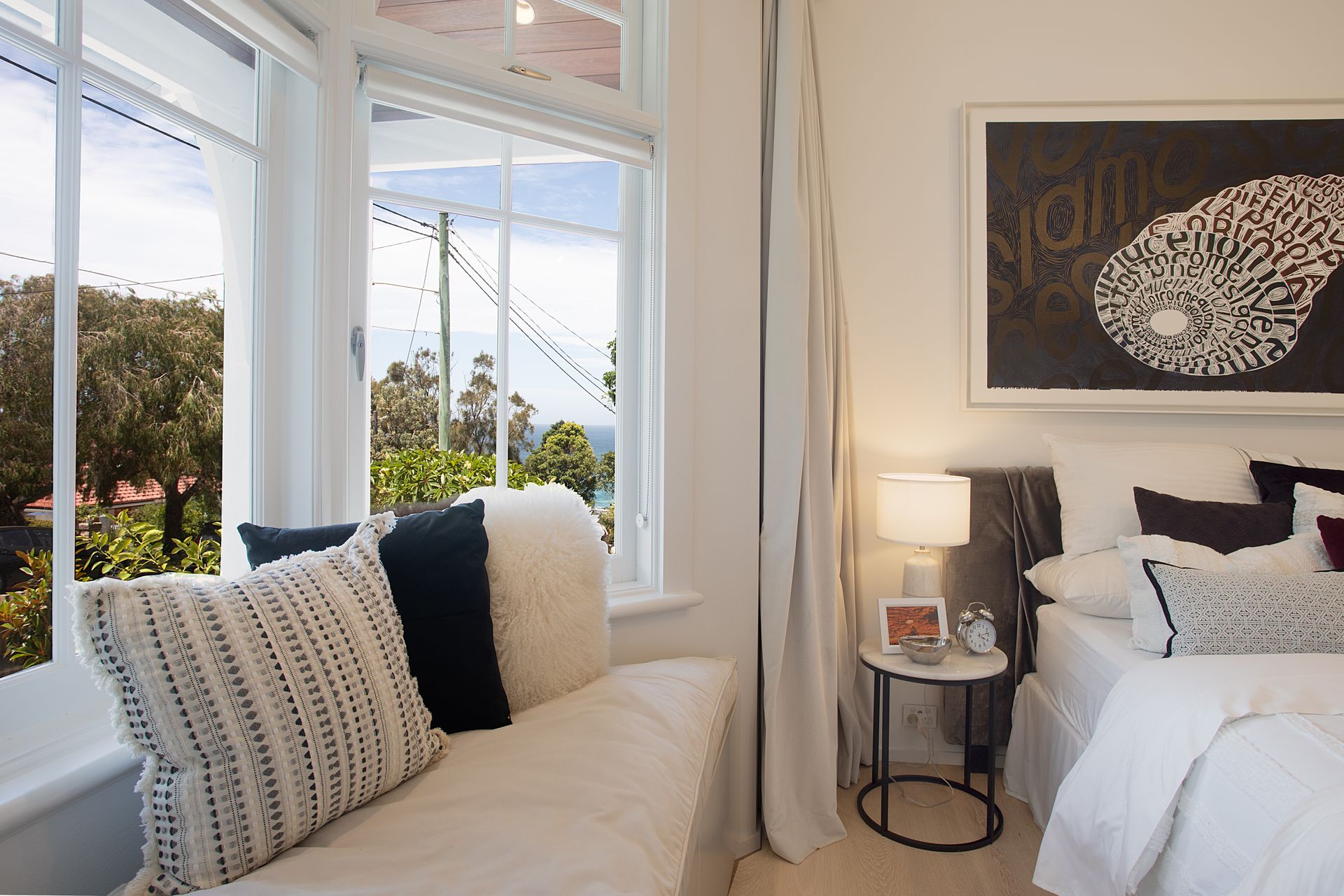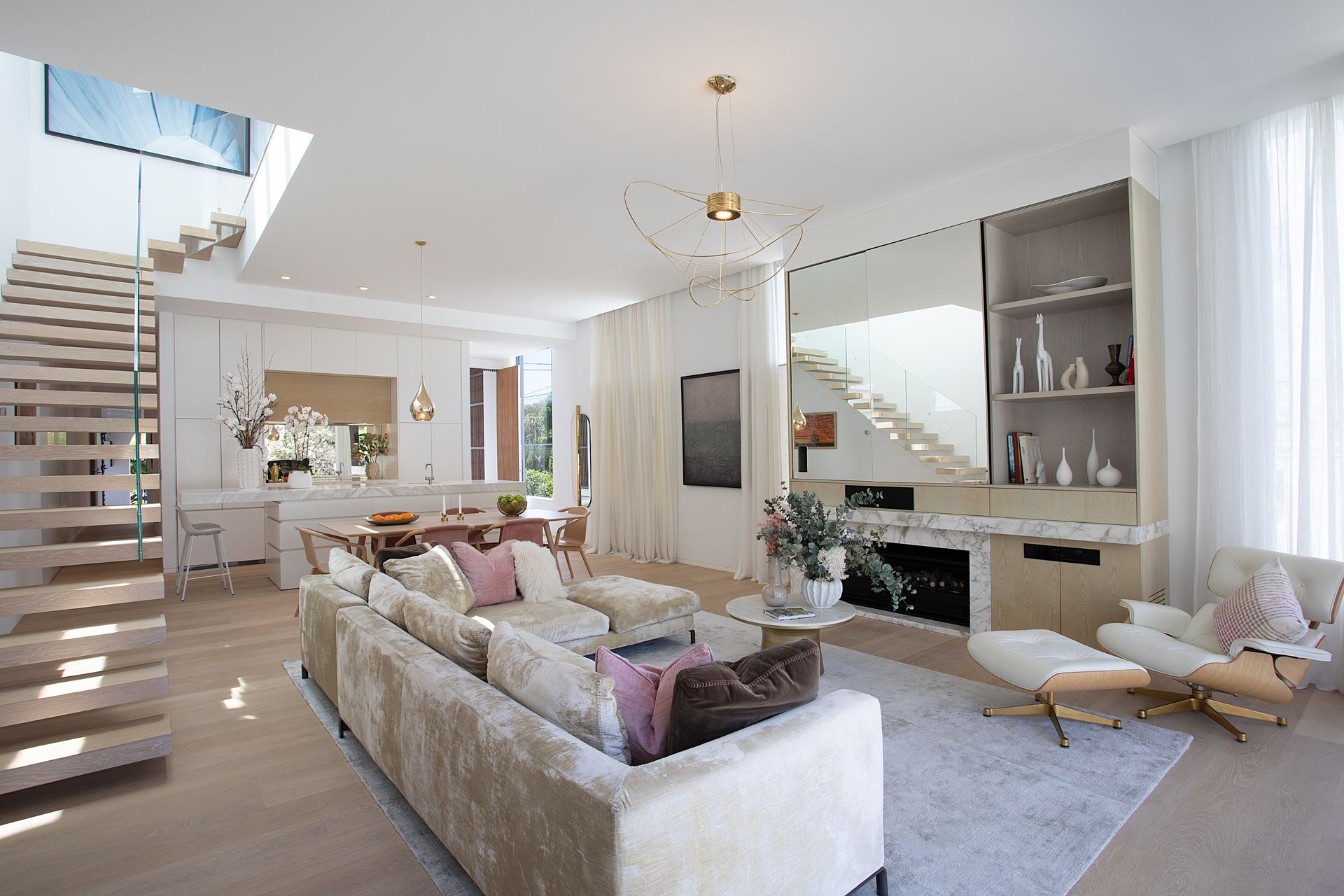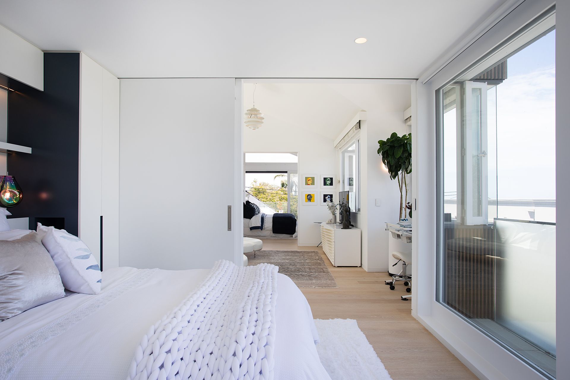 The ground floor unfolds as a continuous living canvas, where light floods through vast windows and dances across solid marble surfaces throughout the day. A Heatmaster gas fireplace anchors the main living space, framed by bespoke architectural lighting that creates warmth long into the evening. The open plan design flows effortlessly to a sandstone terrace and landscaped garden, blurring the line between inside and out. Upstairs, a second living retreat offers soundproofed privacy, complete with television and integrated office space, perfect for those seeking quiet corners away from the main gathering areas. Custom daybeds nestle into alcoves throughout, inviting you to pause and absorb those ever-changing ocean views.