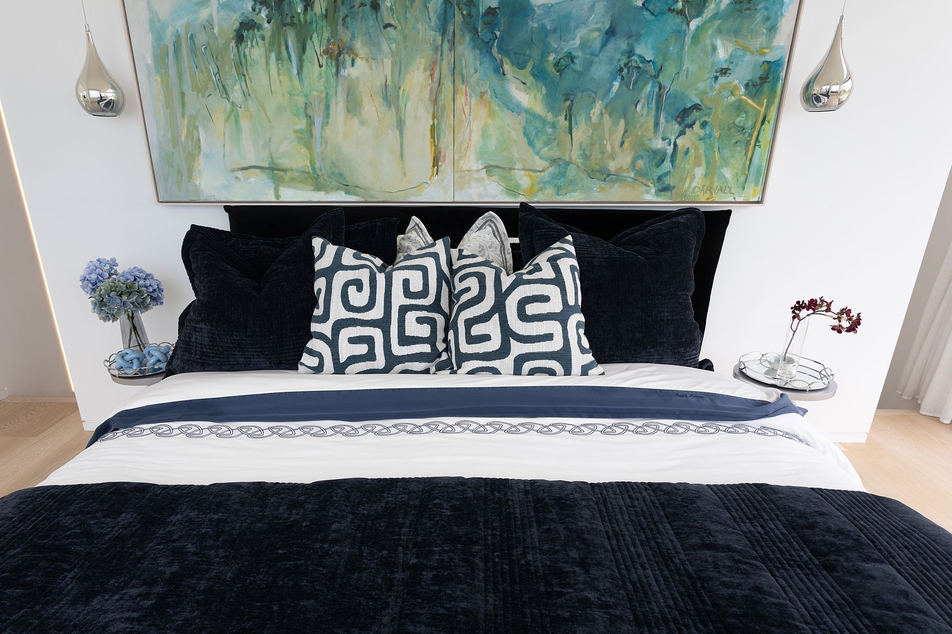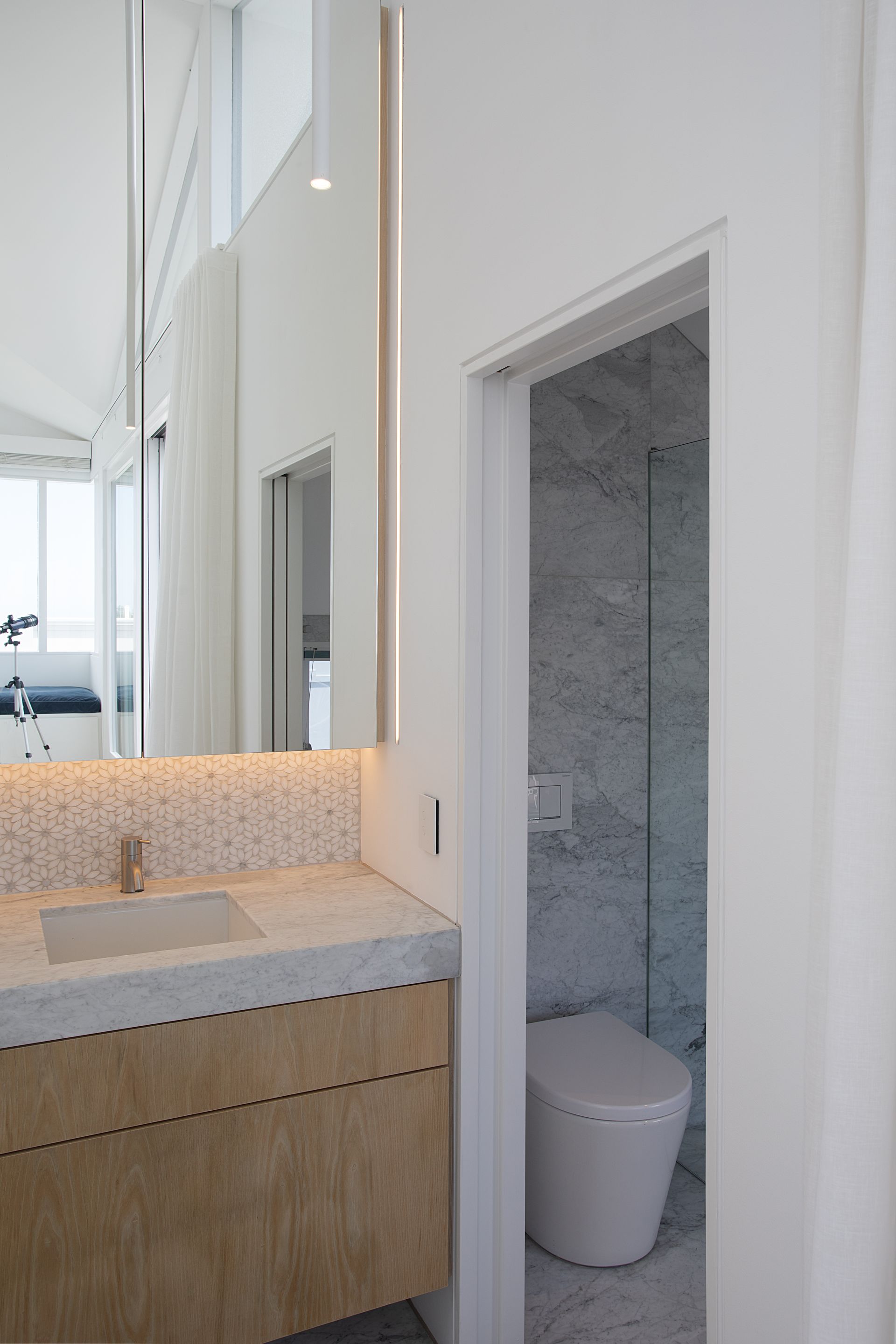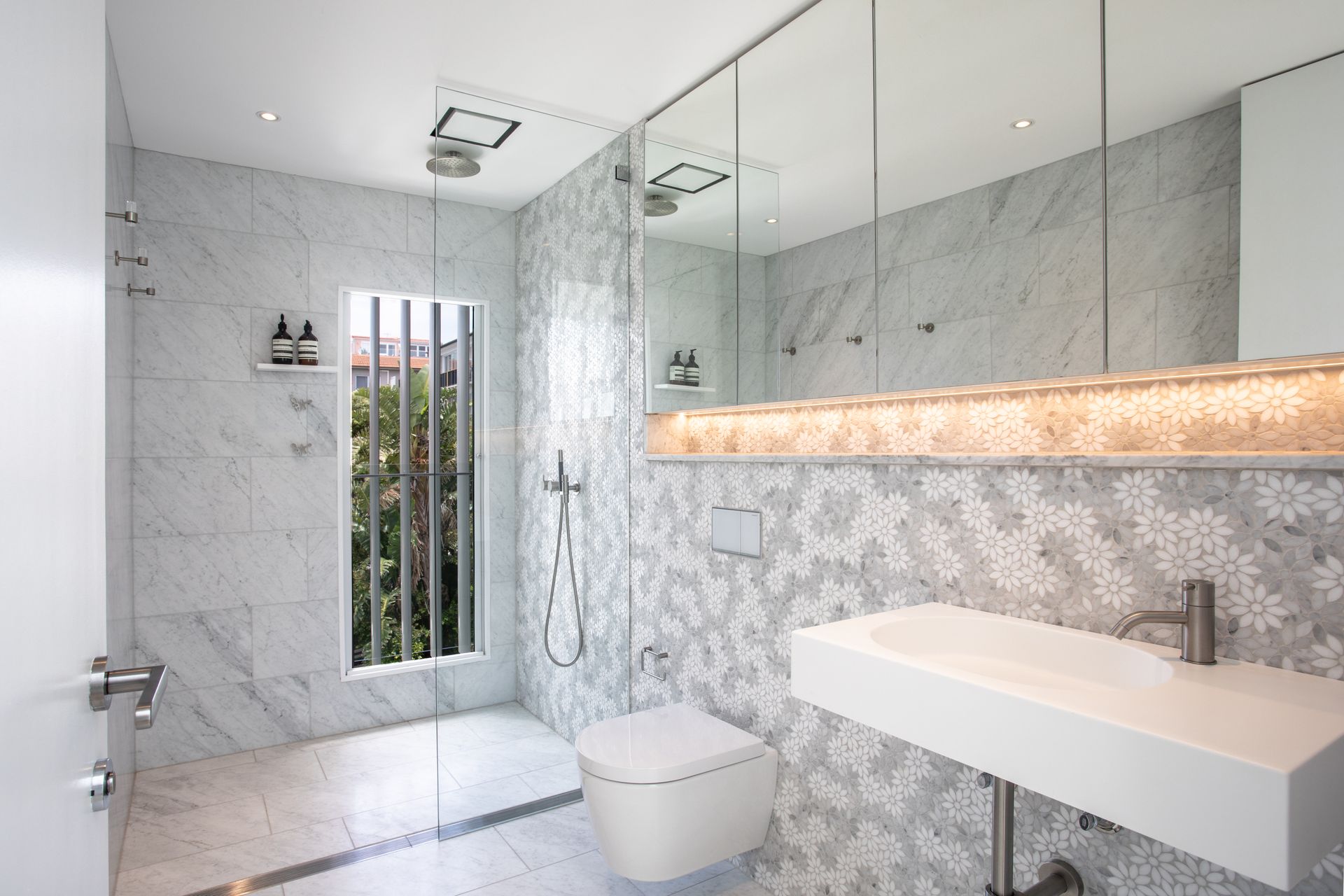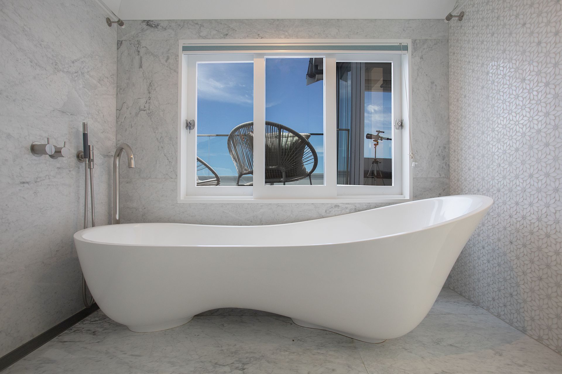 Four bedrooms provide private sanctuaries, the master suite commands the upper level, opening directly onto a private rooftop terrace where the Pacific stretches to the horizon. An ocean-facing ensuite with heated marble walls adjoins a temperature-controlled dressing room, creating a spa-like retreat within the home. An additional upper level bedroom claims its own marble ensuite bathrooms with heated floors and walls, while two ground floor queen bedrooms offer flexible space for family or guests. Wake to natural light pouring through expansive windows, the sound of waves your only alarm.