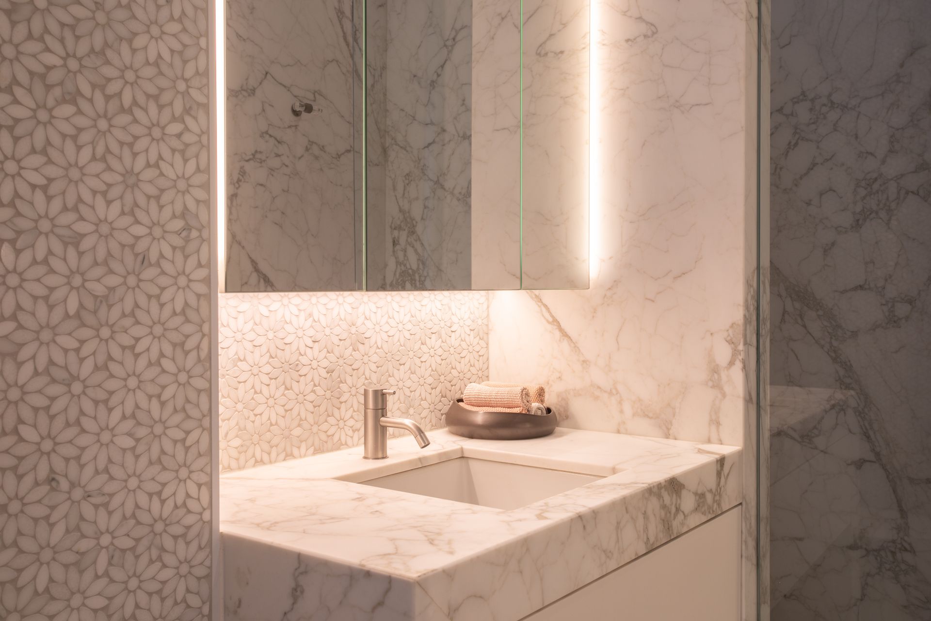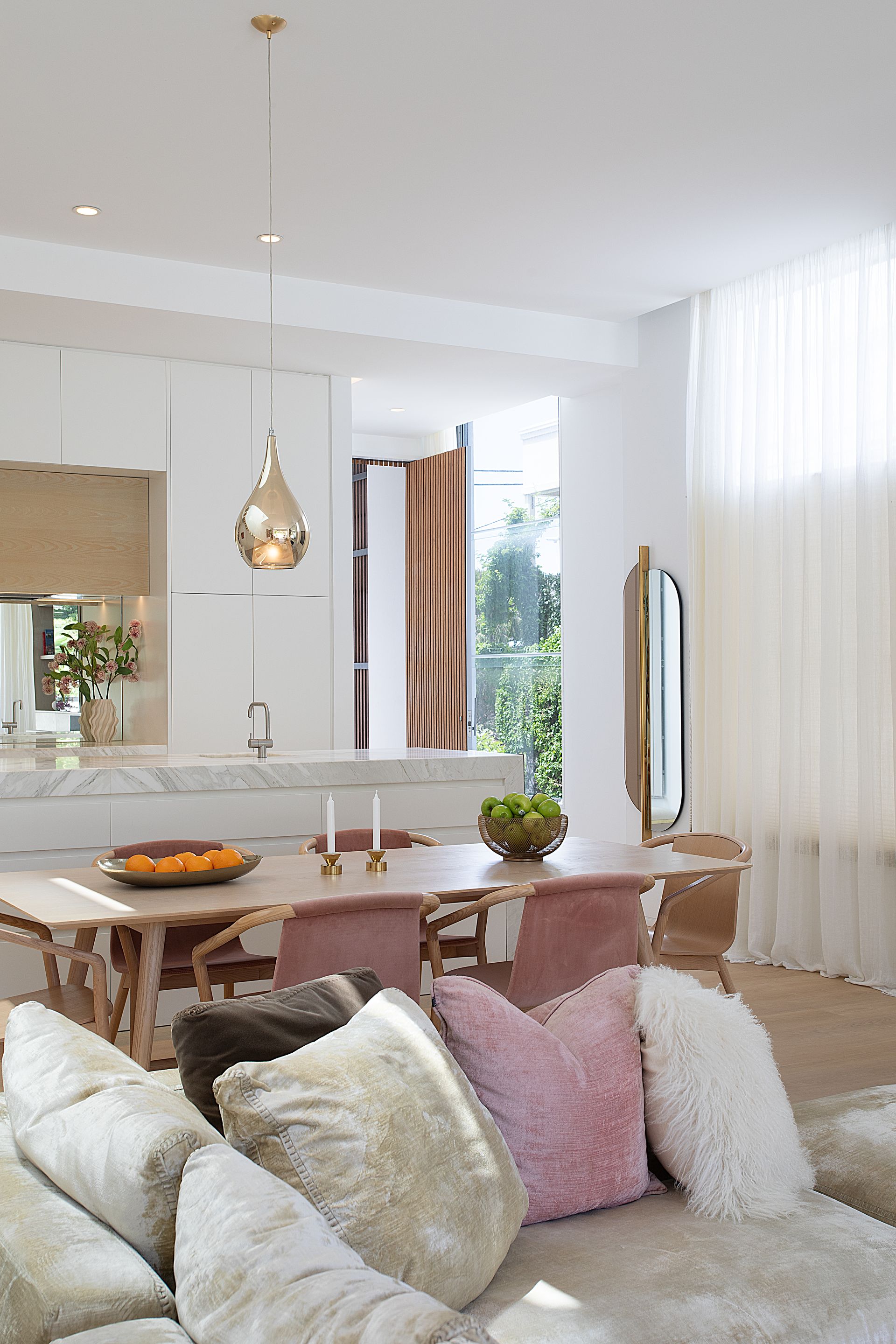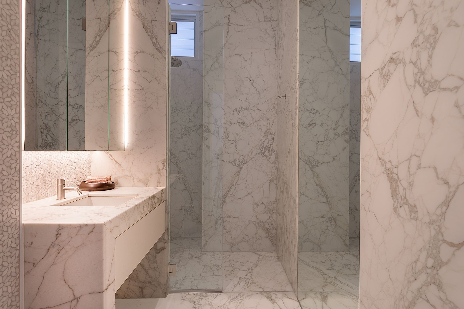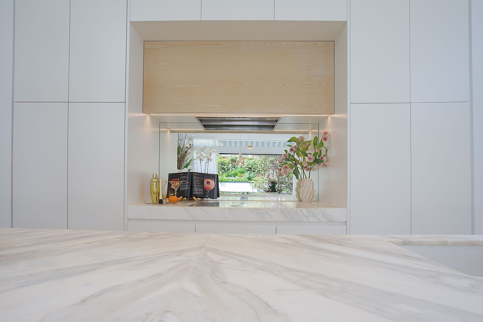 The kitchen stands as a sculptural centrepiece, entirely clad in Calacatta marble including a dramatic four-metre island that anchors the space. Premium Miele appliances handle everything from quick breakfasts to elaborate dinner gatherings, while the induction cooktop and integrated wine wall cater to serious home cooks. A dedicated coffee and cocktail bar features a Zip HydroTap, ready for espresso mornings or evening aperitifs.