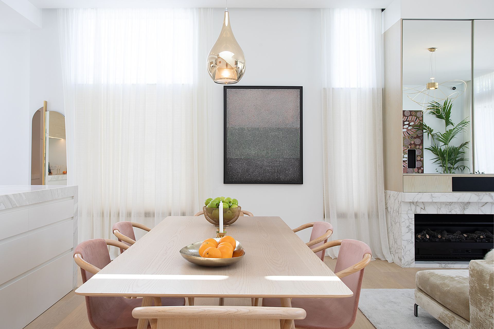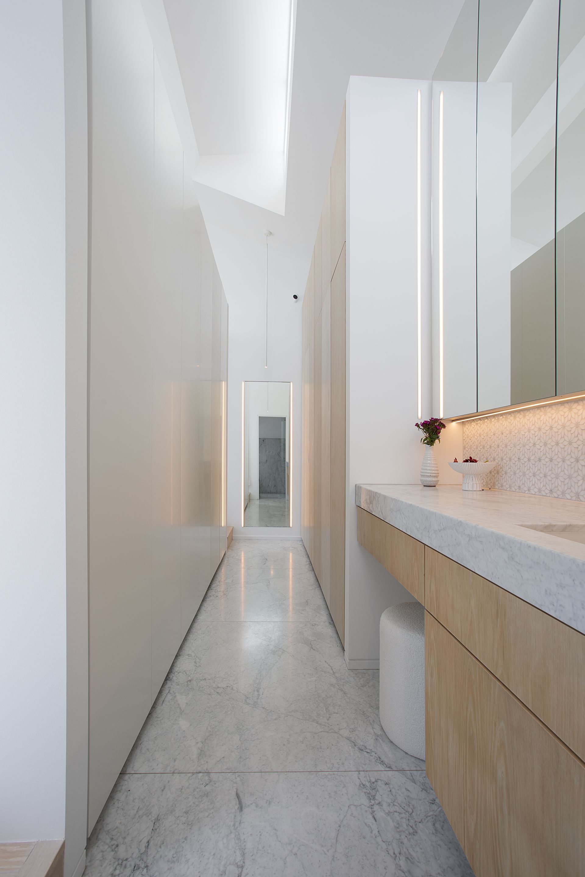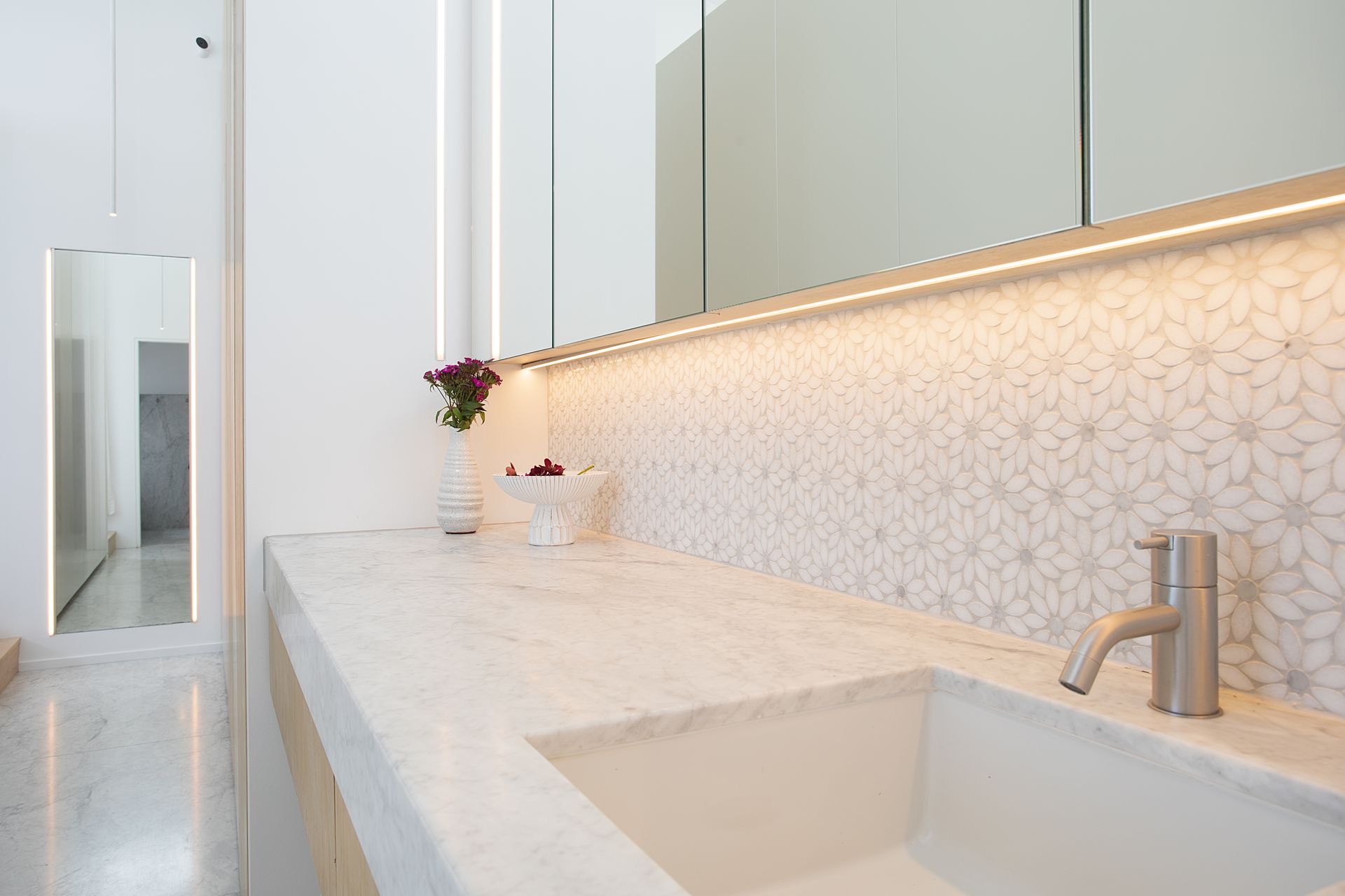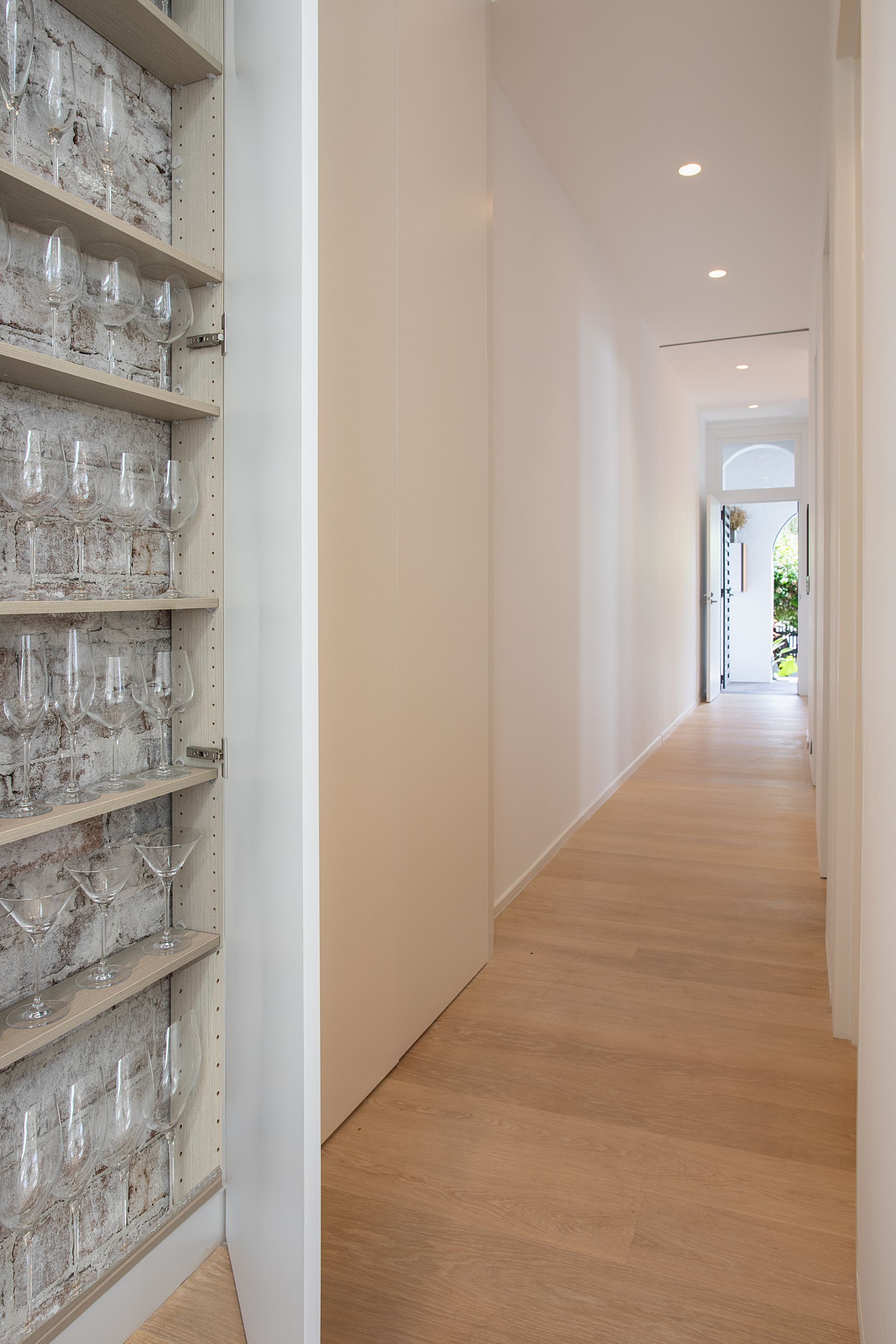 The kitchen stands as a sculptural centrepiece, entirely clad in Calacatta marble including a dramatic four-metre island that anchors the space. Premium Miele appliances handle everything from quick breakfasts to elaborate dinner gatherings, while the induction cooktop and integrated wine wall cater to serious home cooks. A dedicated coffee and cocktail bar features a Zip HydroTap, ready for espresso mornings or evening aperitifs.