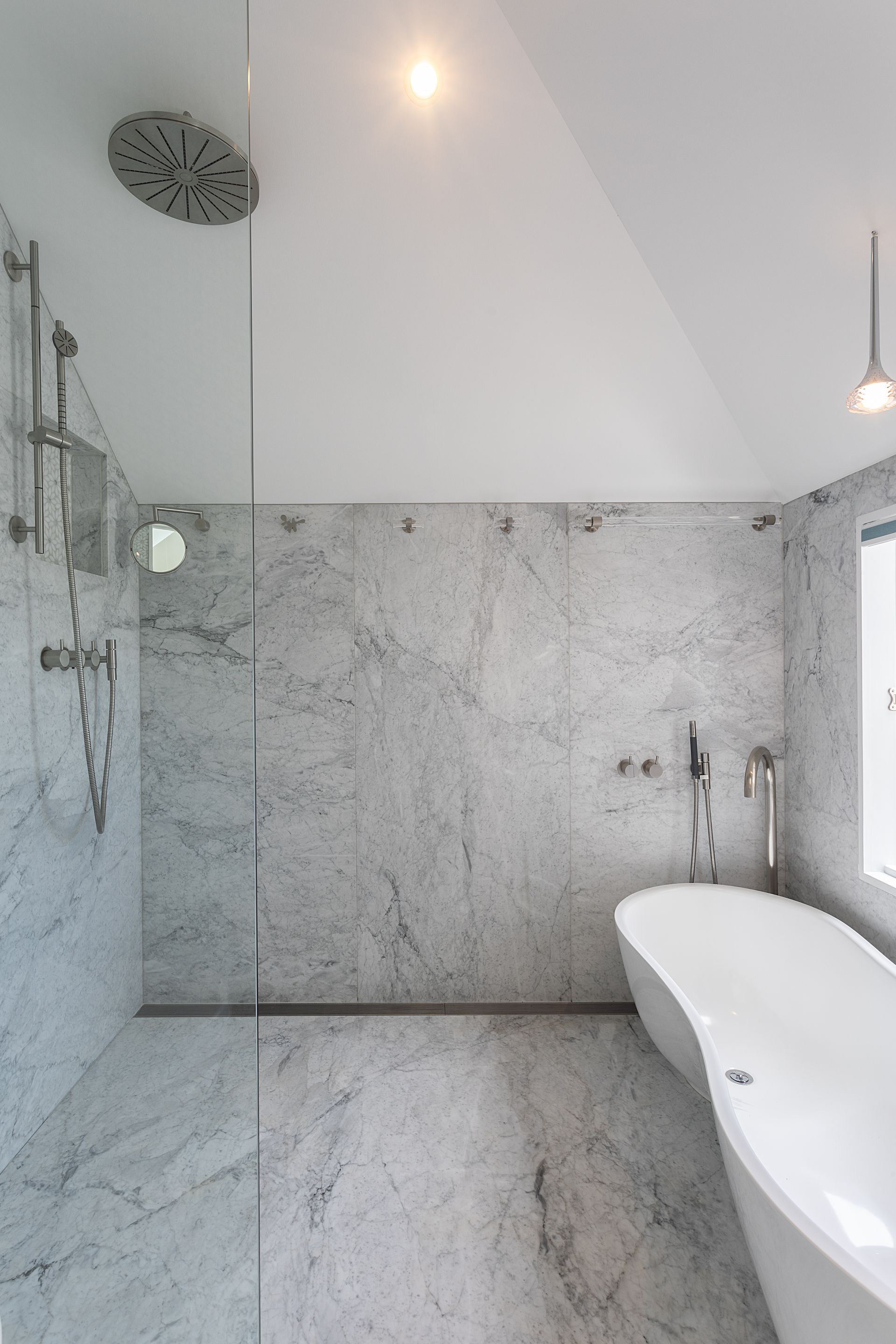 Three full bathrooms showcase solid marble slabs with heated floors and walls, combining Italian and Scandinavian design principles. The master ensuite frames ocean views while you bathe. A ground floor bathroom features a shower with heated walls, while all spaces maintain the home's commitment to both luxury and warmth. An internal washing machine and dryer handle everyday needs discreetly, tucked away from the main living spaces yet easily accessible when required. Double garage parking provides secure off street spaces for two vehicles.