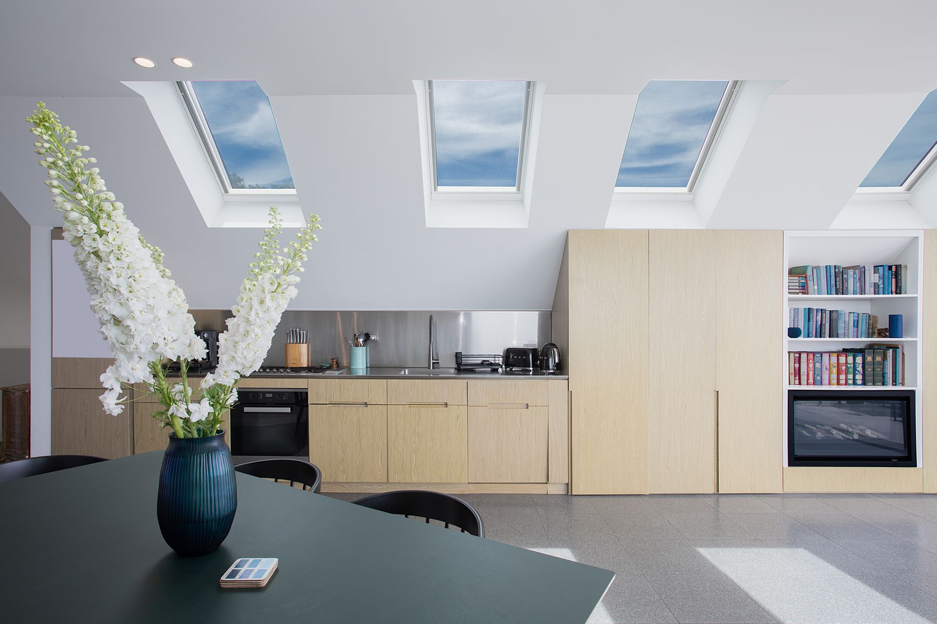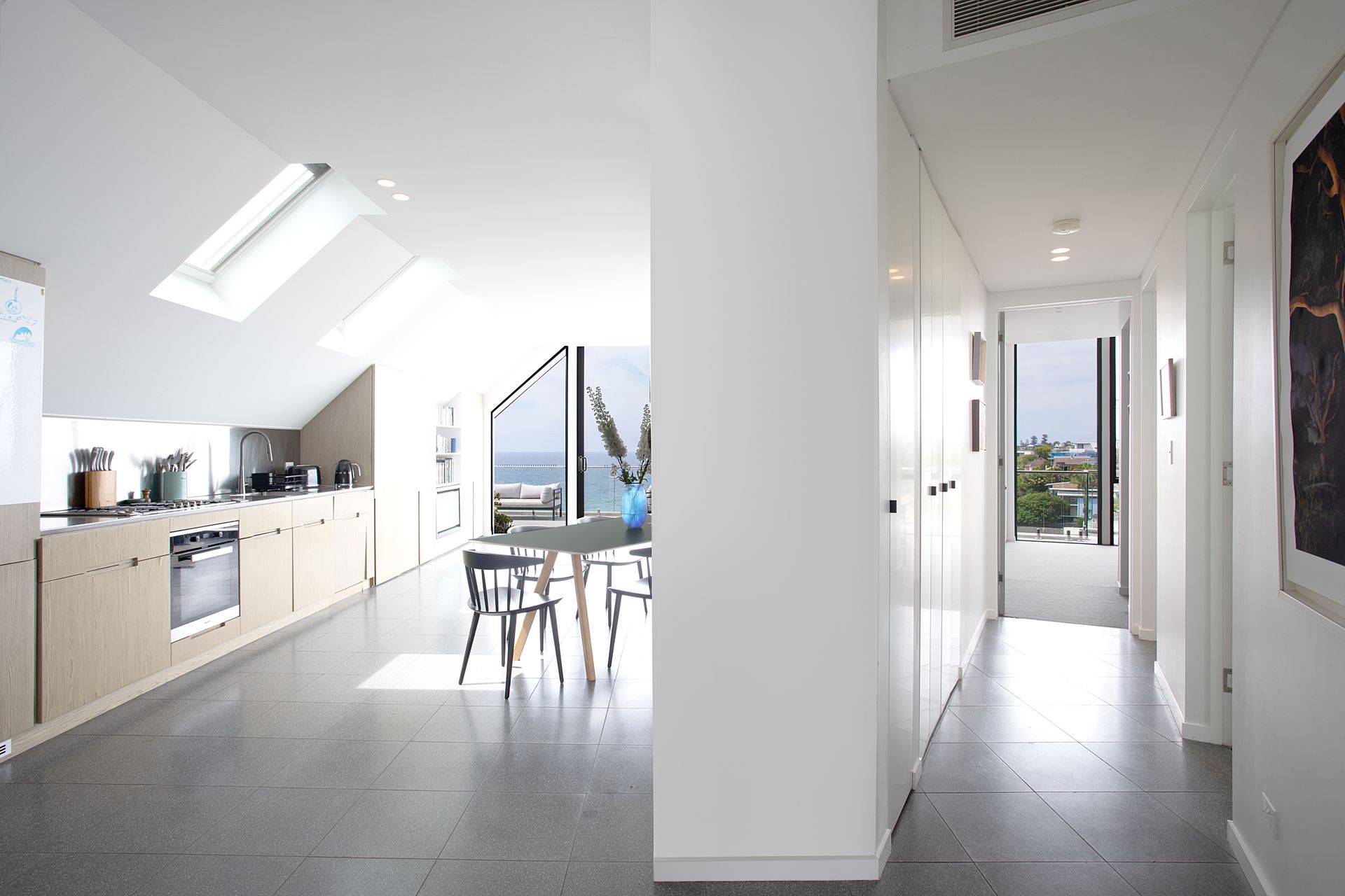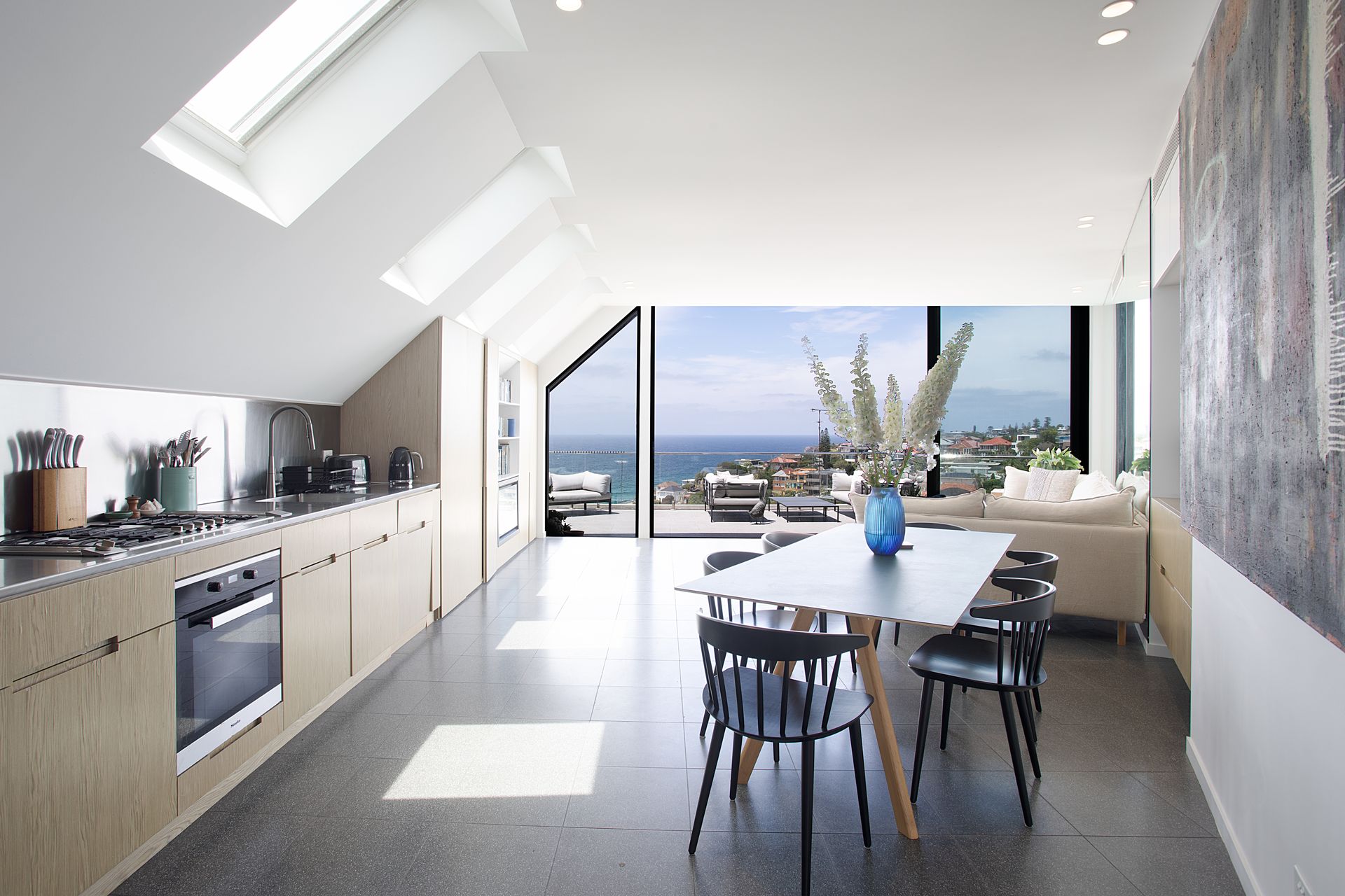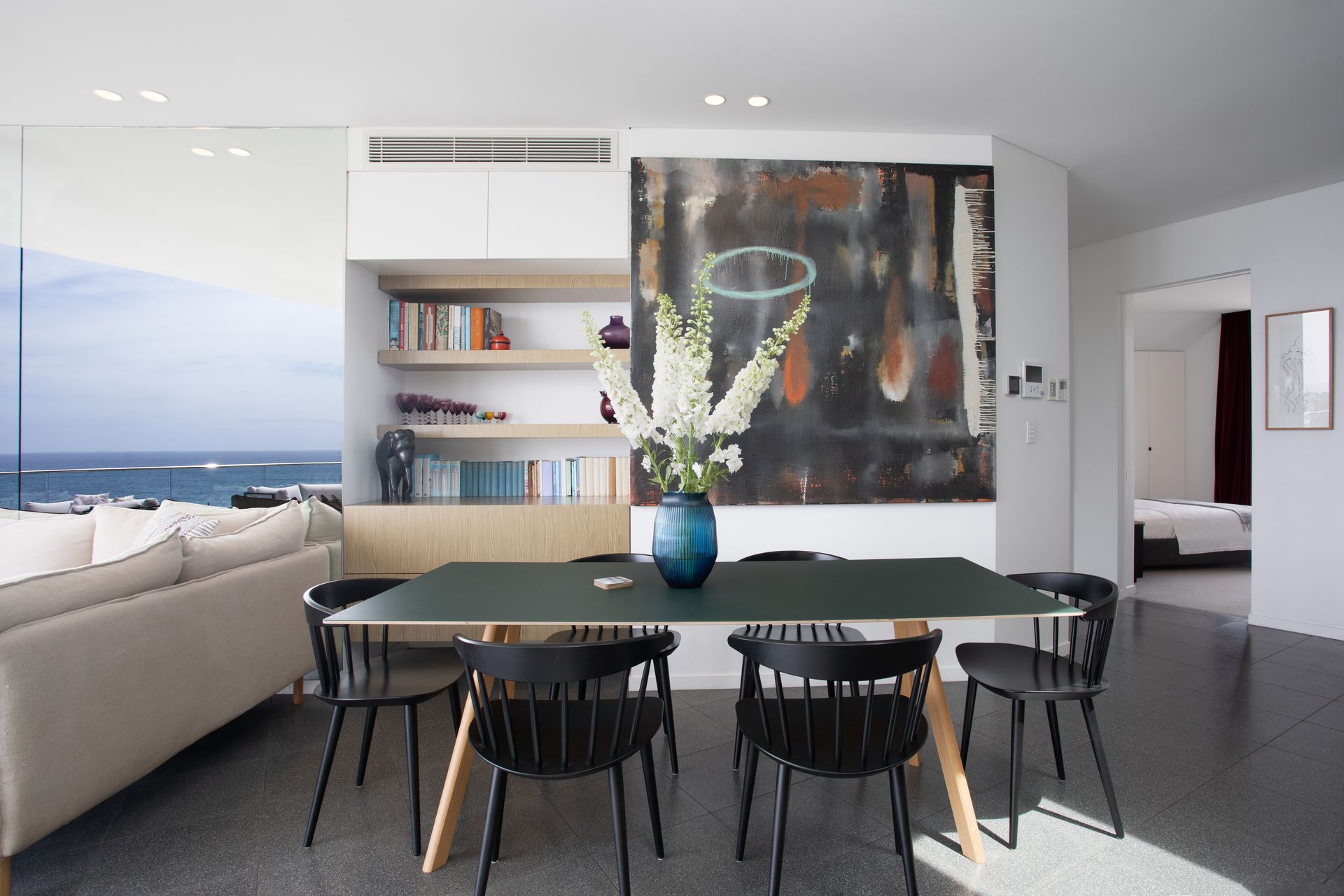 The kitchen centres on clean lines and integrated appliances that handle daily needs. Gas cooktop and dishwasher sit within streamlined cabinetry, keeping surfaces clear and functional. Dining happens against a backdrop of ocean that shifts from dawn pastels to afternoon blue. The open layout connects kitchen, dining and living areas, making every meal an opportunity to absorb the coastal setting.