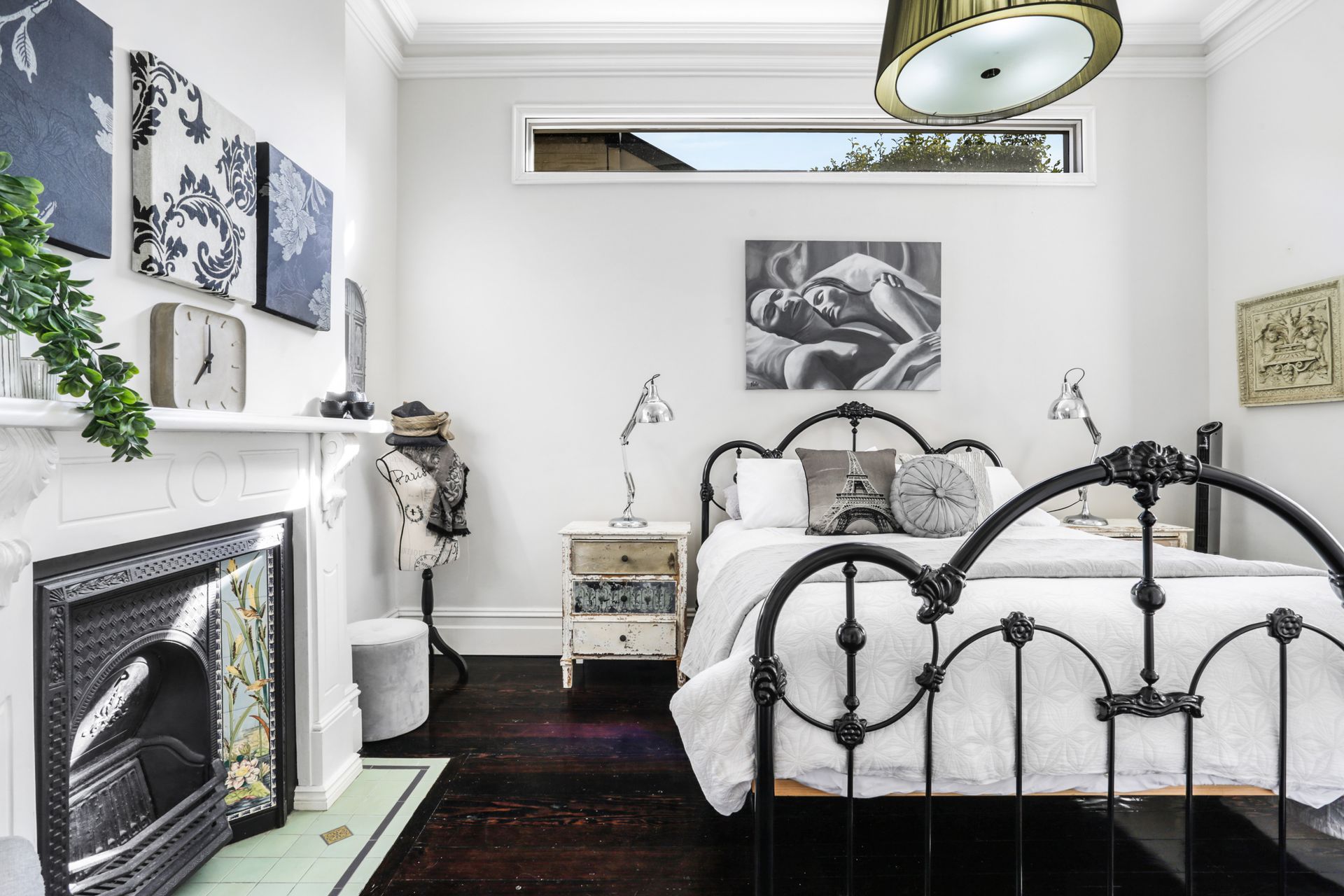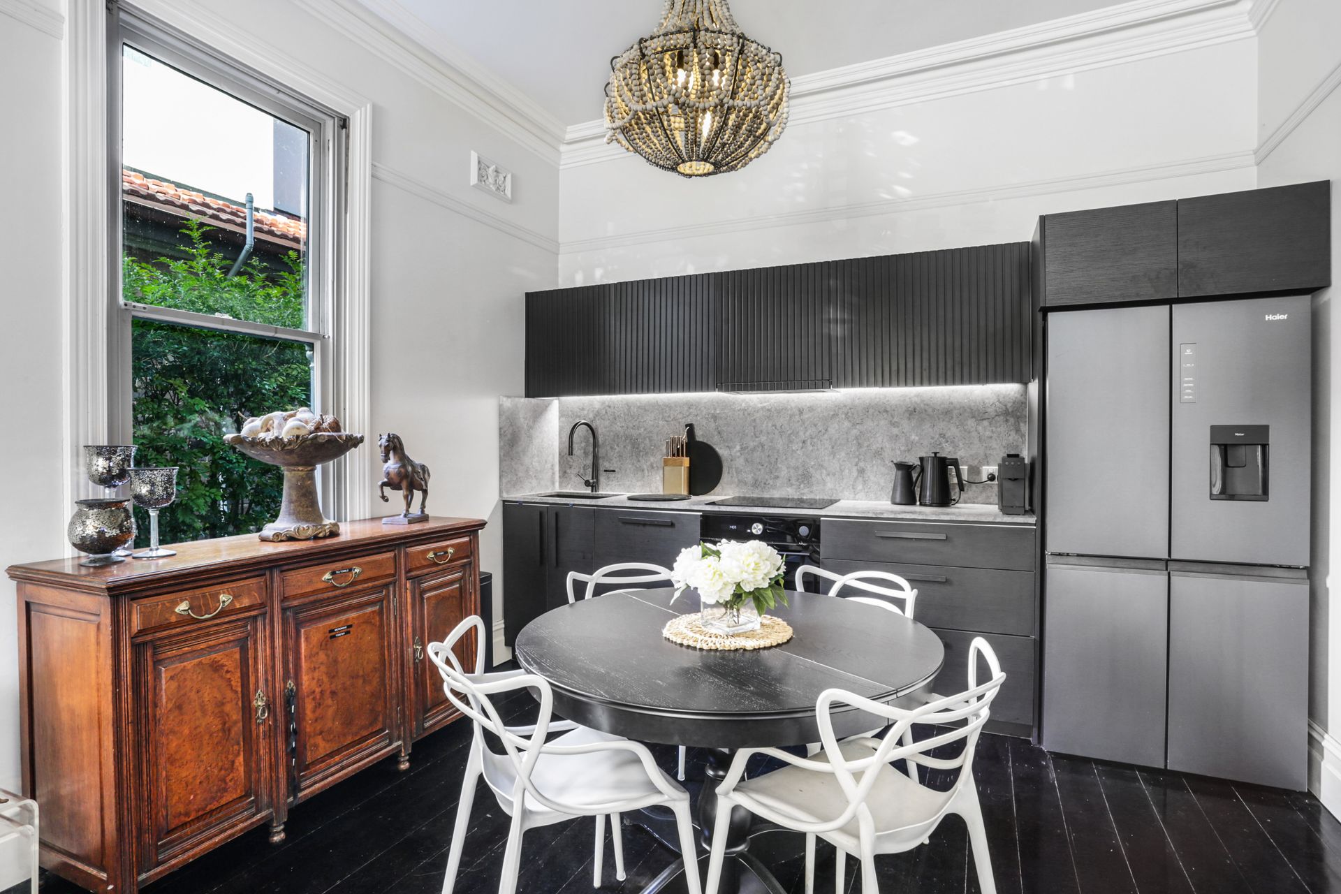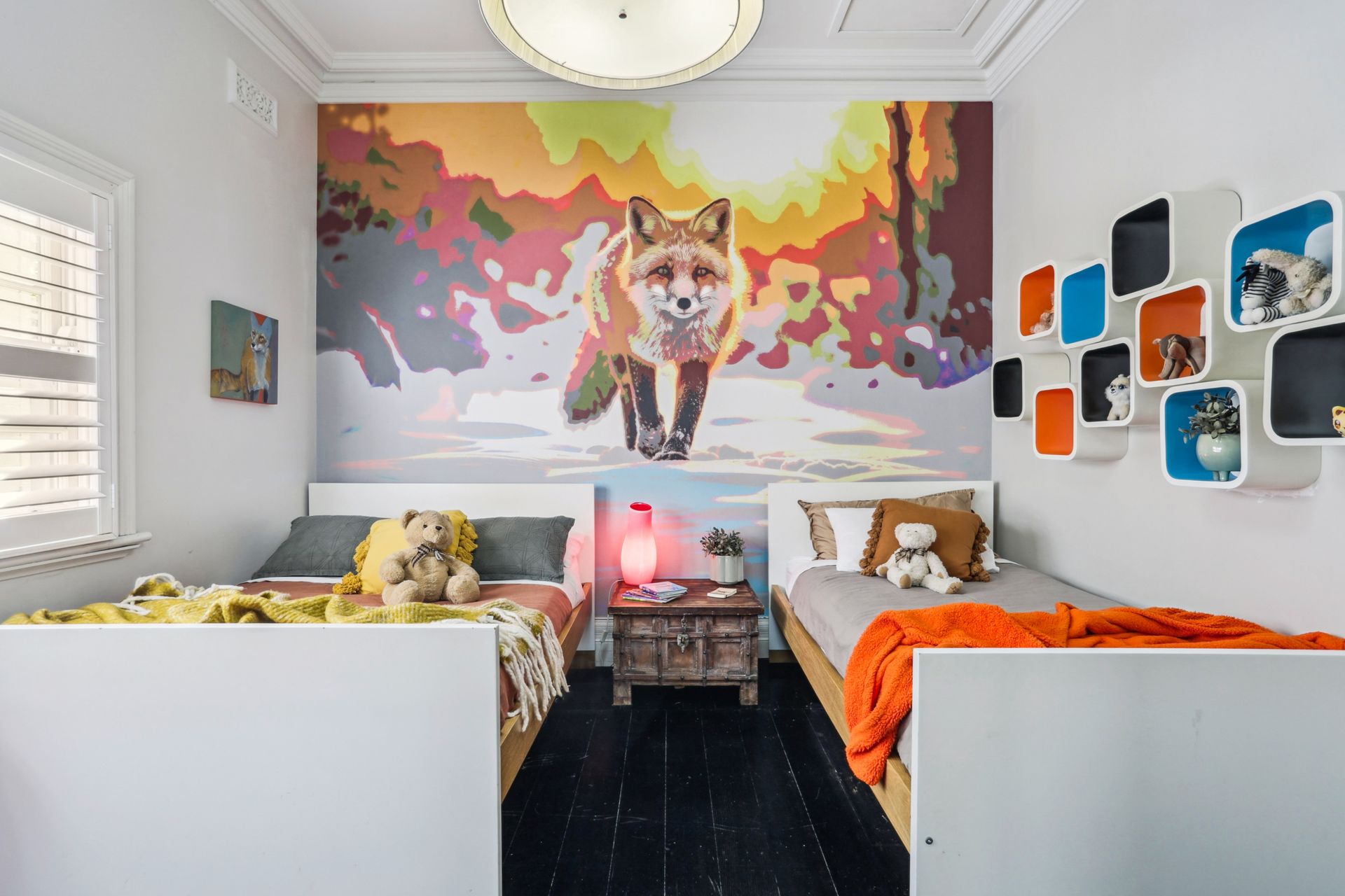 The living area is rich with character, ornate plaster cornices, a decorative fireplace, dark hardwood floors and a striking chandelier overhead anchoring the space with old-world elegance. The kitchen is a sleek modern contrast: dark ribbed cabinetry, a marble-effect splashback, induction cooktop and a French-door fridge bring clean, contemporary energy to a room full of heritage soul. The master bedroom is dressed in crisp white linen with an ornate iron bed frame, plantation shutters and a pendant light, while the second bedroom brings a burst of personality, a vivid fox mural dominates the feature wall, complemented by playful modular shelving and a double and single bed, making it a striking and comfortable space for any guest. The bathroom is a spa-like retreat: double stone basins set beneath a textured feature wall, a freestanding bath and separate shower complete the picture.