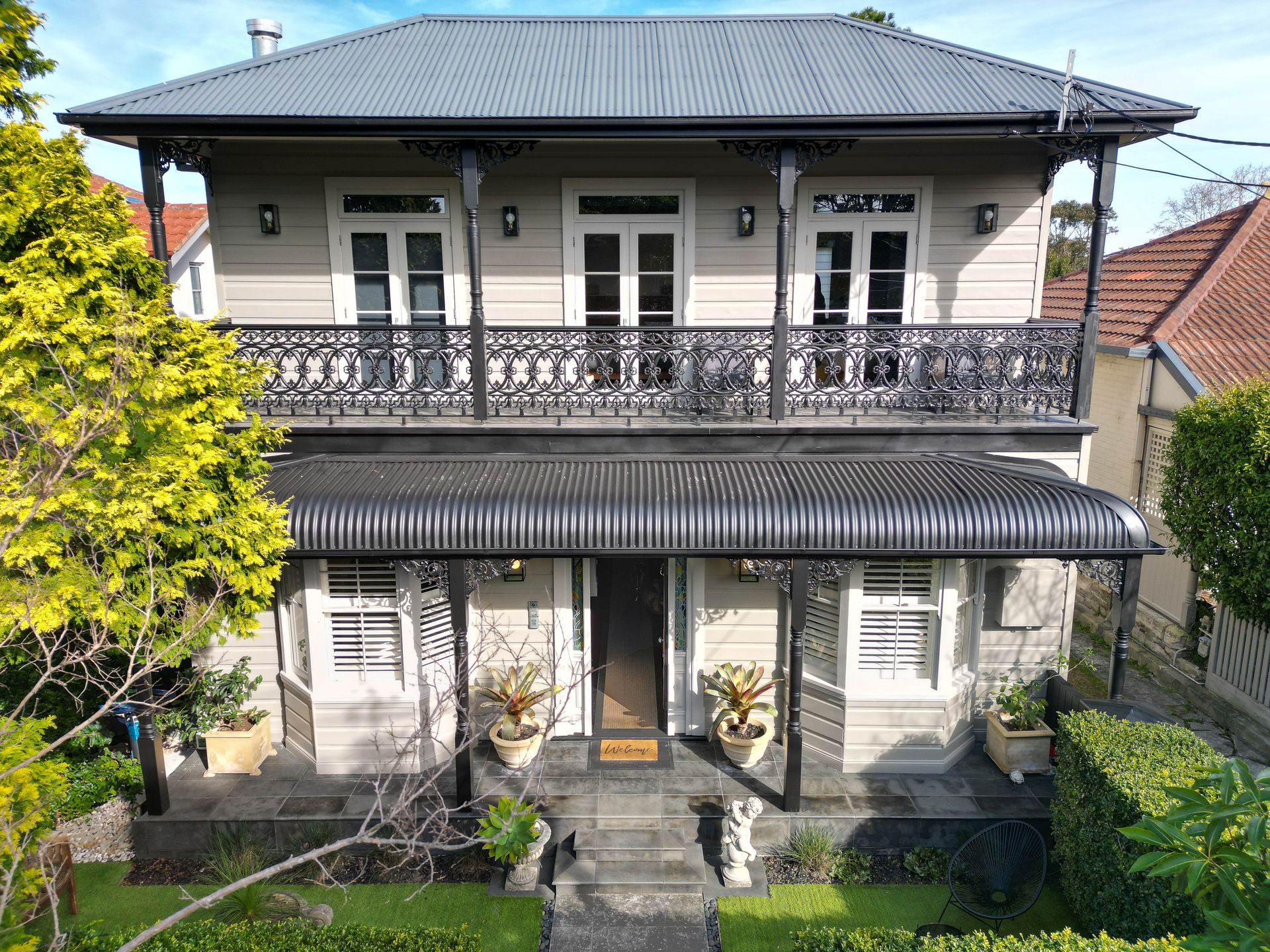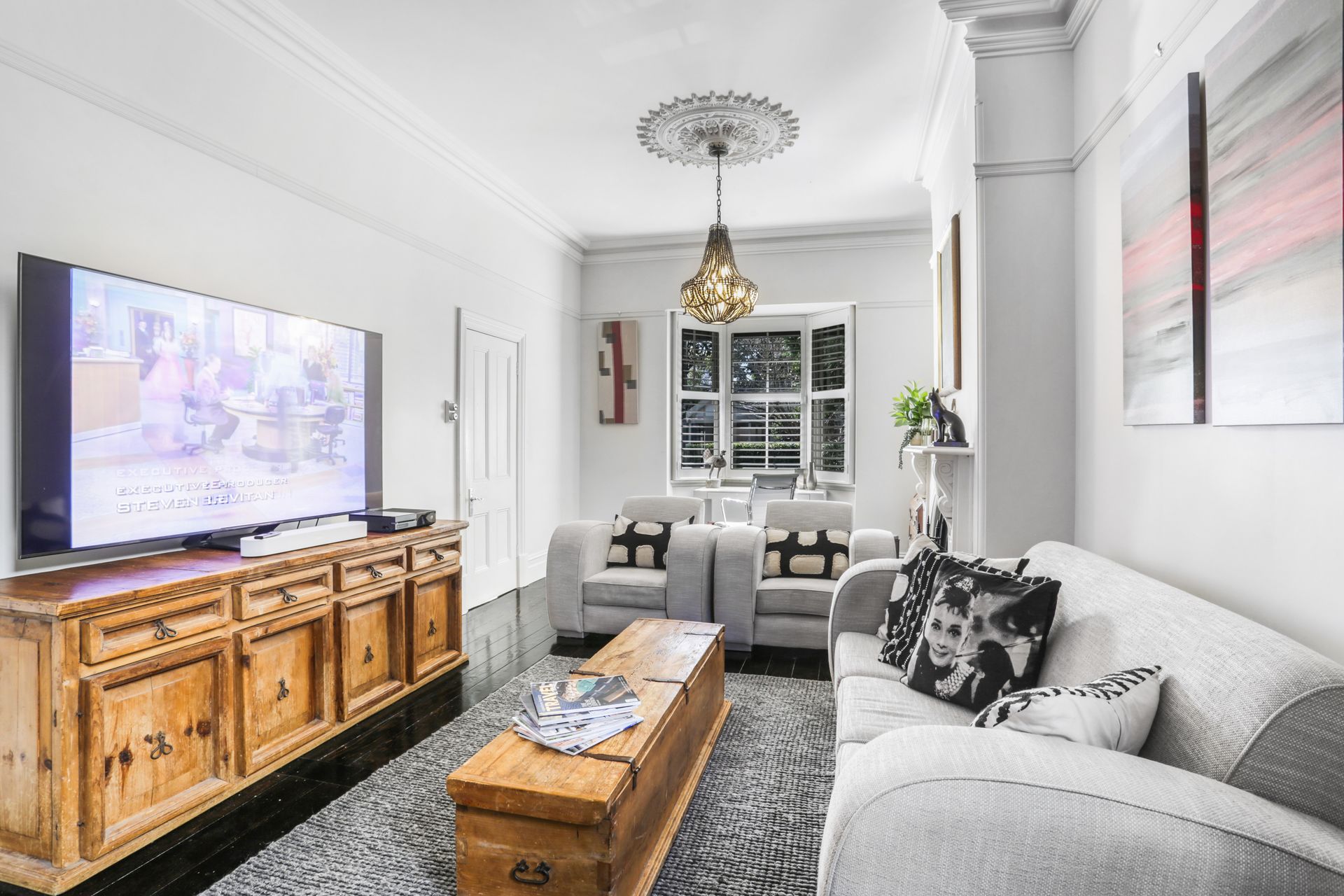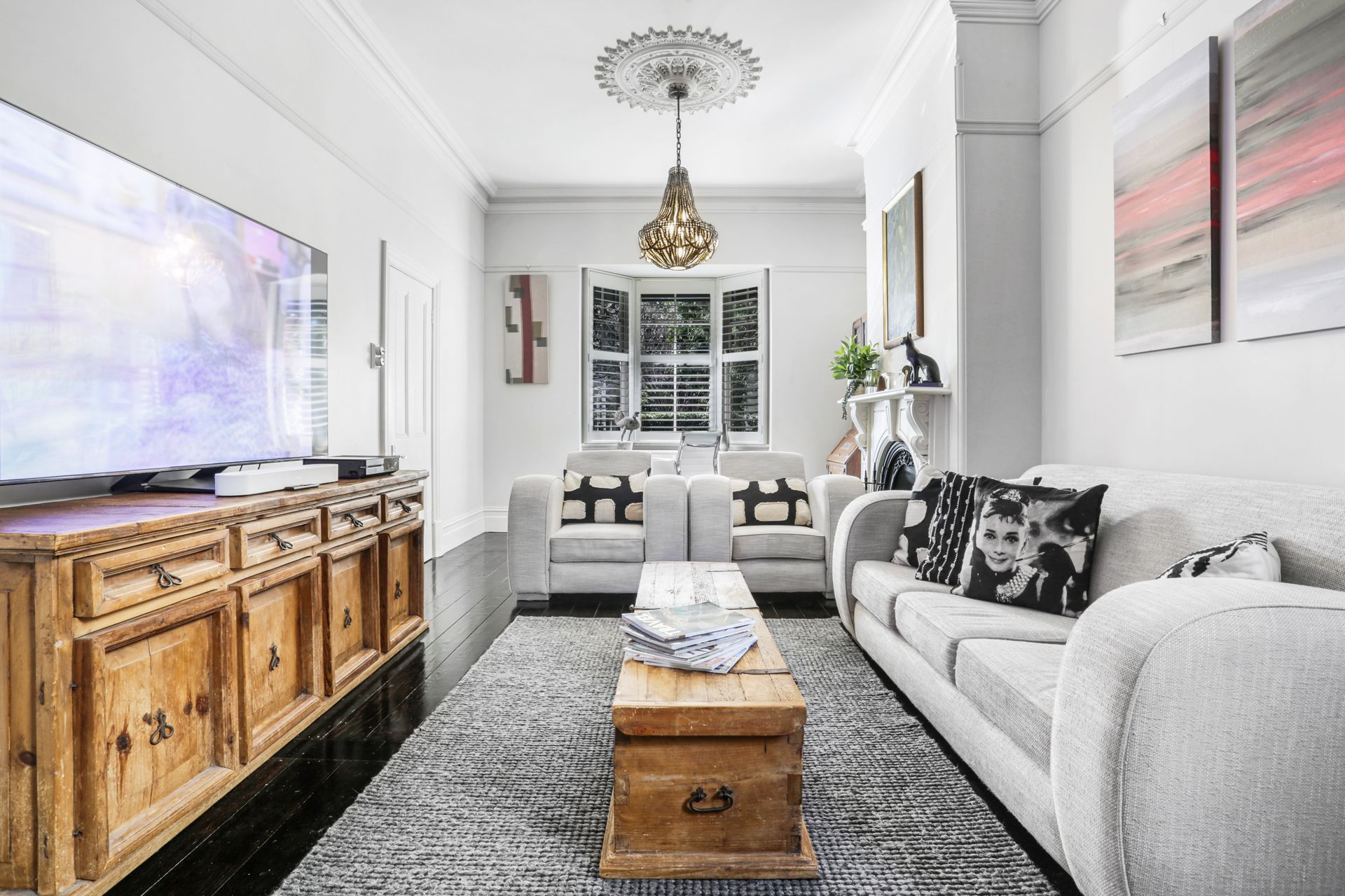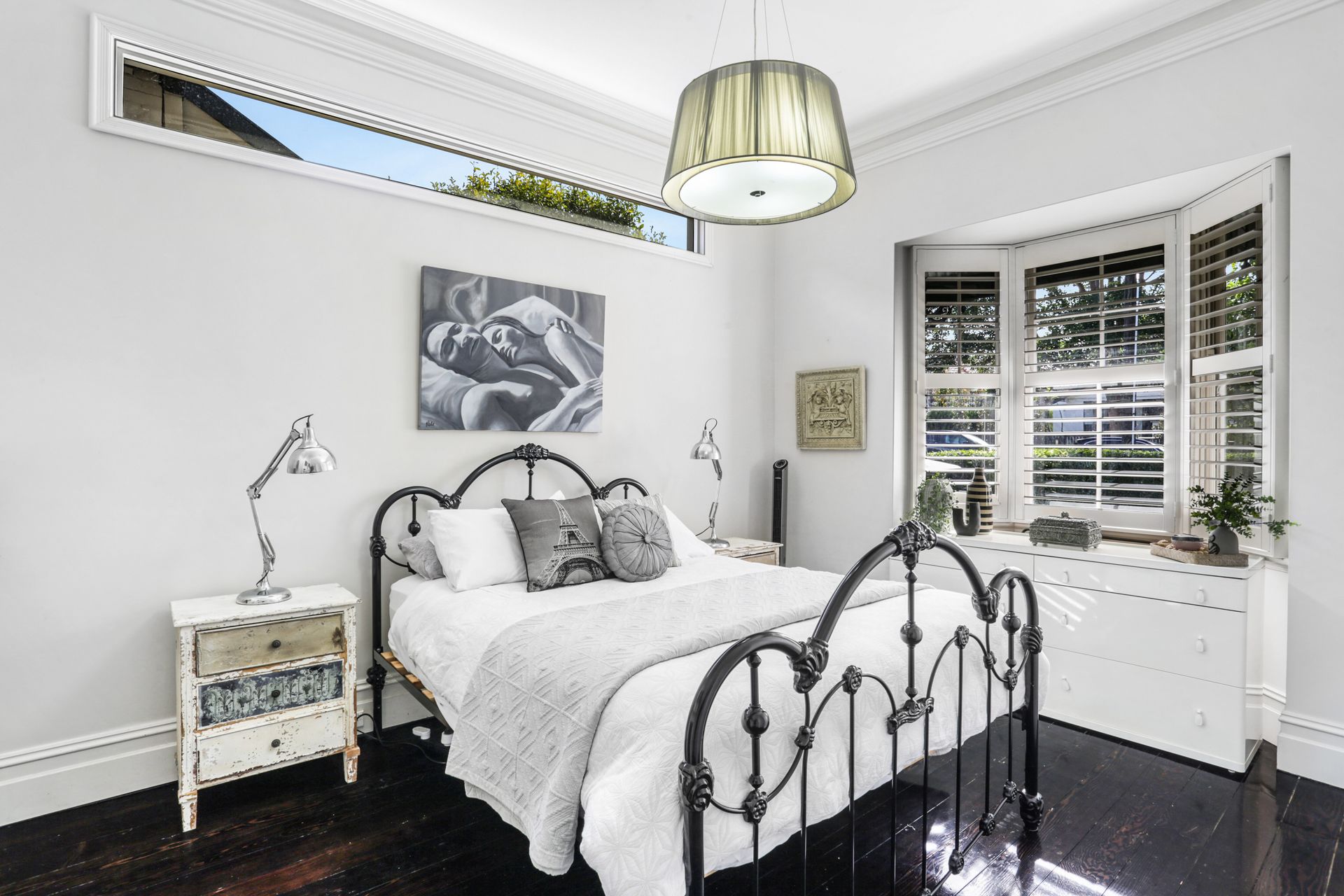 The living area is rich with character, ornate plaster cornices, a decorative fireplace, dark hardwood floors and a striking chandelier overhead anchoring the space with old-world elegance. The kitchen is a sleek modern contrast: dark ribbed cabinetry, a marble-effect splashback, induction cooktop and a French-door fridge bring clean, contemporary energy to a room full of heritage soul. The master bedroom is dressed in crisp white linen with an ornate iron bed frame, plantation shutters and a pendant light, while the second bedroom brings a burst of personality, a vivid fox mural dominates the feature wall, complemented by playful modular shelving and a double and single bed, making it a striking and comfortable space for any guest. The bathroom is a spa-like retreat: double stone basins set beneath a textured feature wall, a freestanding bath and separate shower complete the picture.