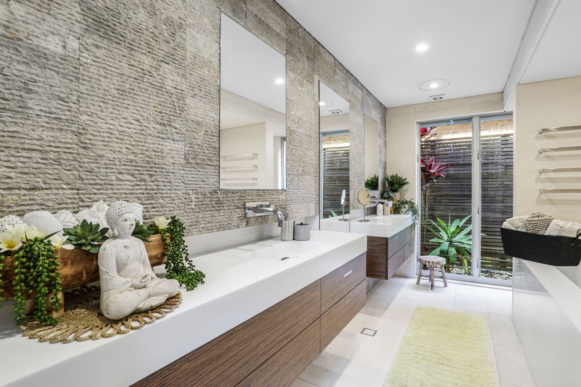 - Bathroom with double stone basins, freestanding bath and separate shower