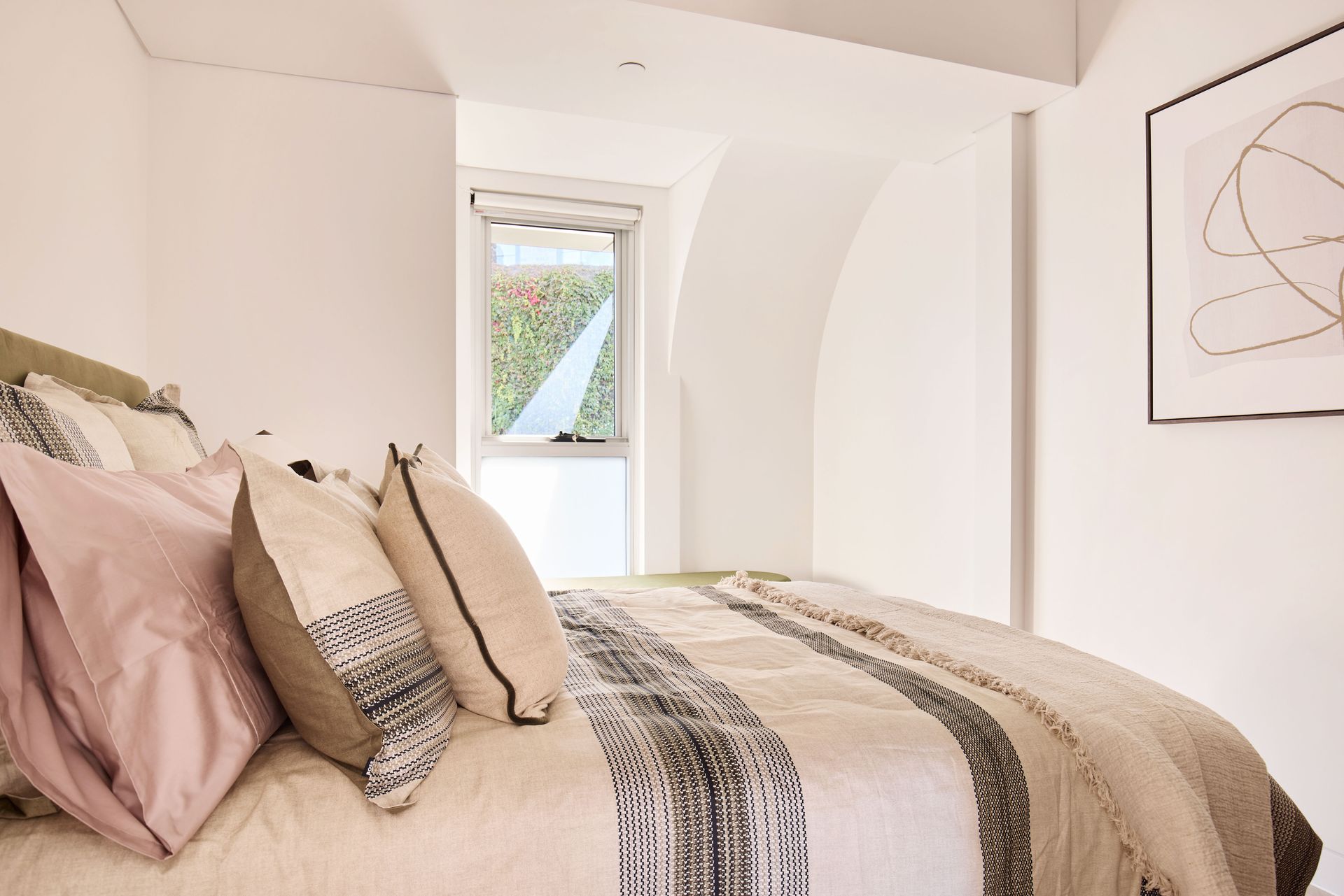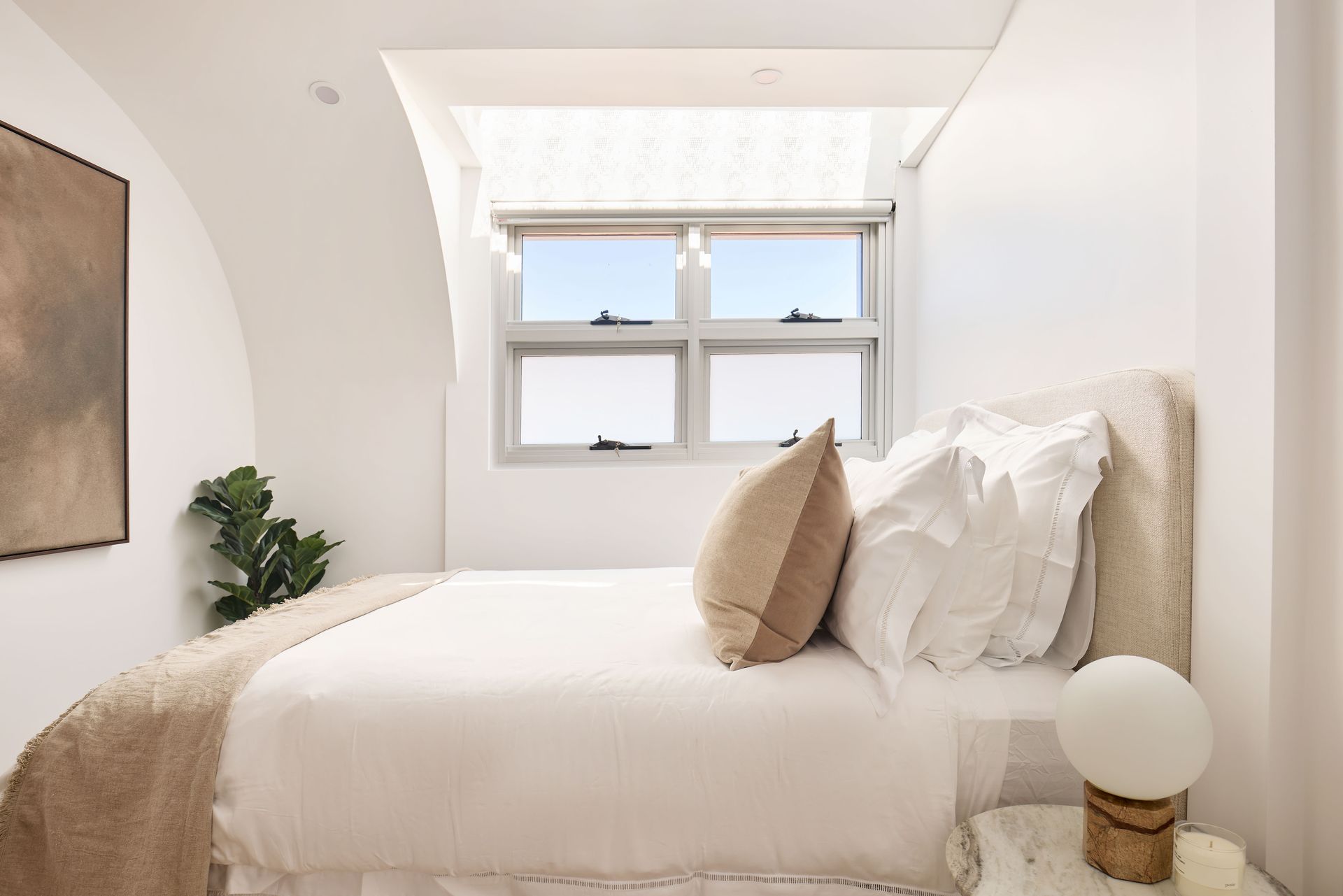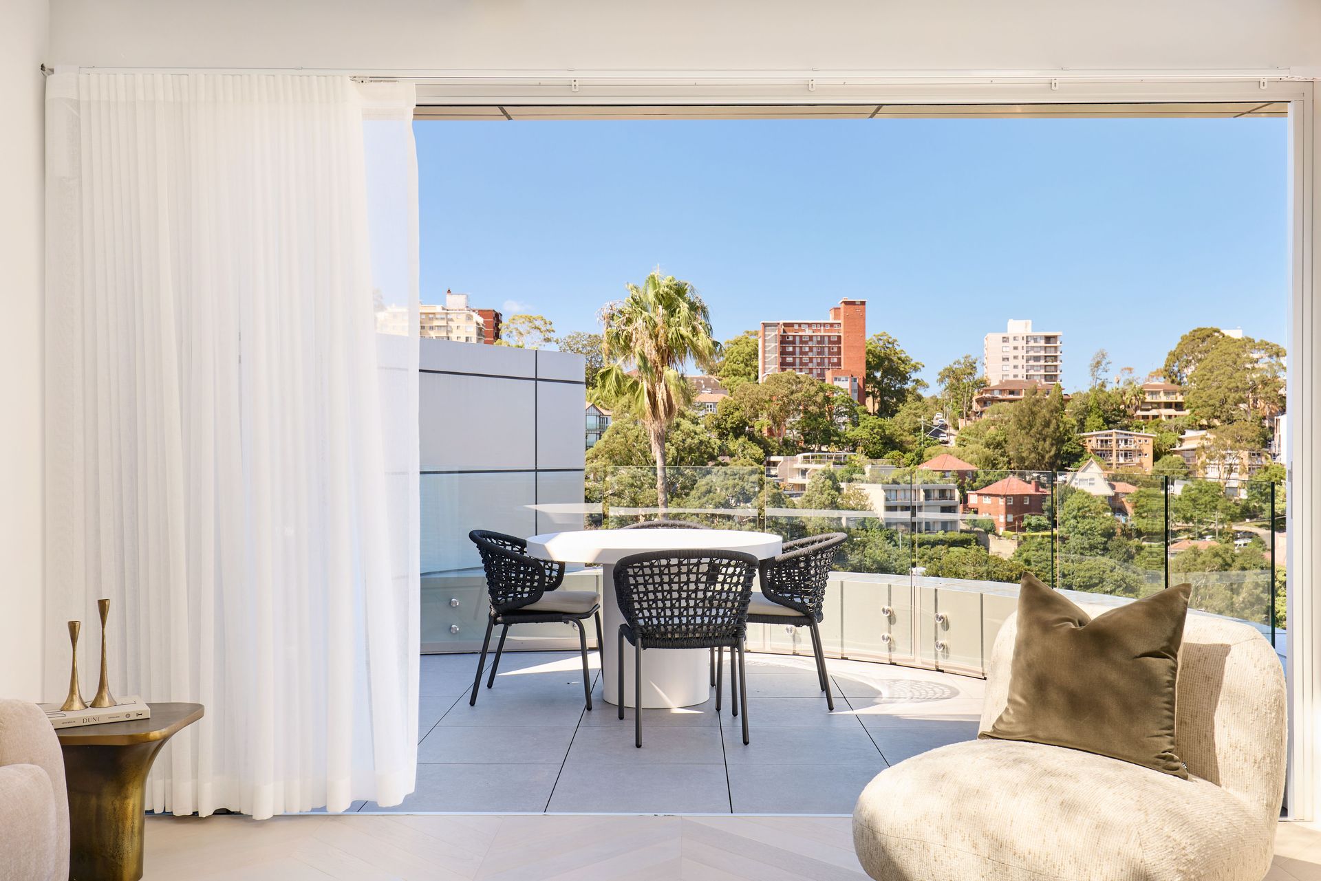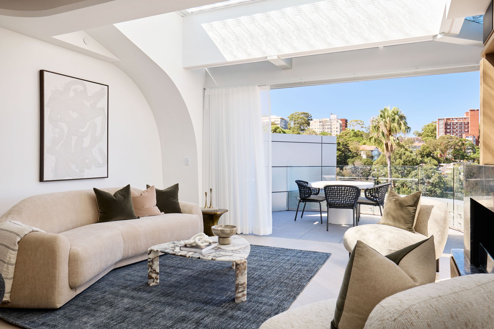 Positioned at the top of Harbourview, Neutral Bay's most considered boutique address, this three-bedroom apartment is a step above in every sense. Sweeping views of the Sydney CBD, the Harbour Bridge, and surrounding treetops stretch from the terrace, while the interiors, defined by curved archways, skylights, and warm natural materials, exude a rare and distinctive character.