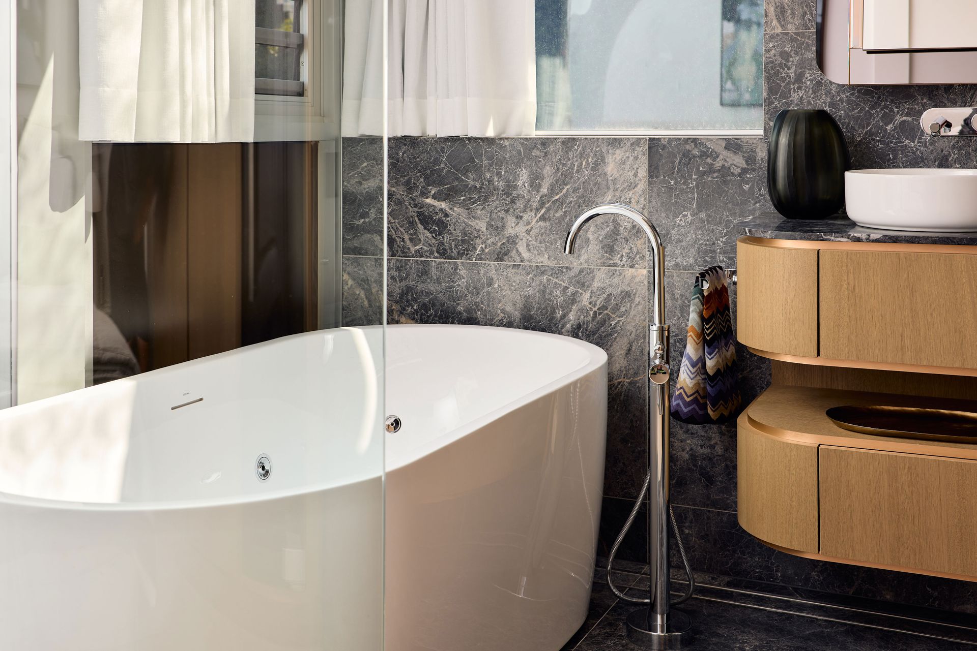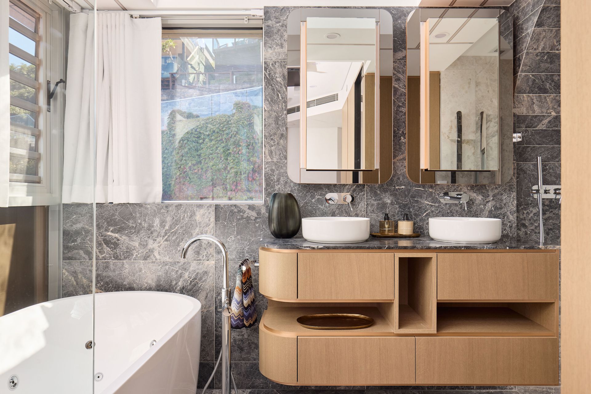 Back inside, the master bedroom is framed by the same coved ceiling detail, with a king bed, garden aspect, and a curved glass partition leading to the ensuite, featuring dark marble floor-to-ceiling, a freestanding bath, double vessel basins on a floating timber vanity, heated floors, and heated towel rails. Two further bedrooms, one queen and one double, are well-proportioned and bright, sharing a second full marble bathroom with heated flooring and heated towel rails. Smoked glass wardrobes with integrated LED lighting and Havwoods veneer joinery run across all three rooms. A dedicated laundry with an LG combined washer and dryer is neatly tucked away.