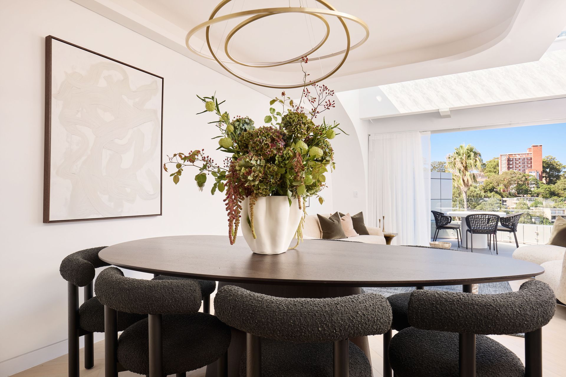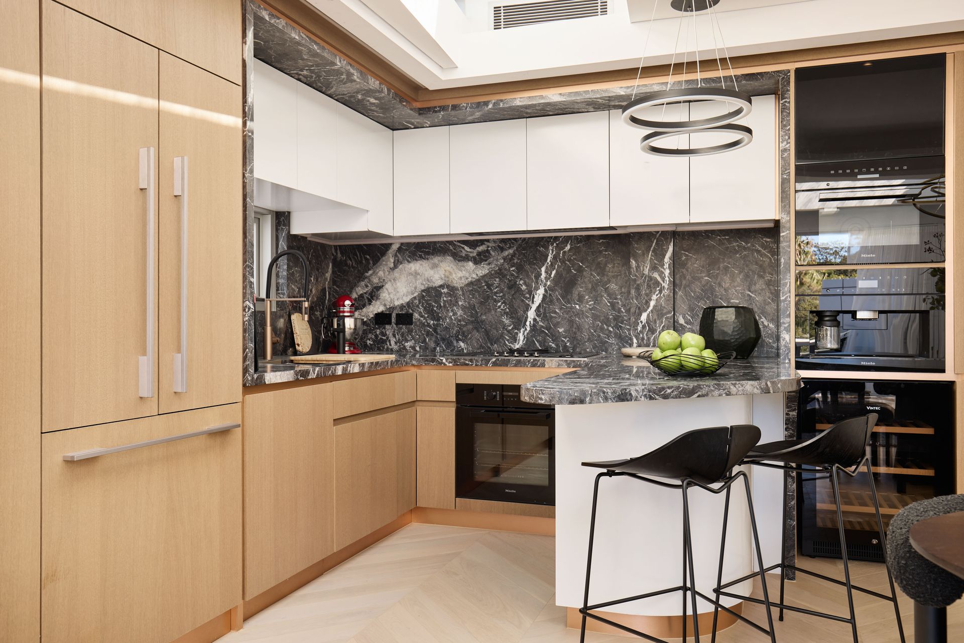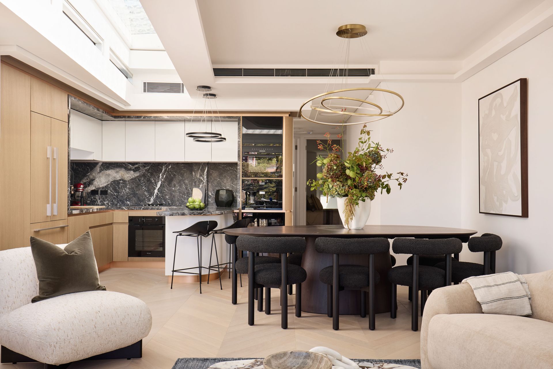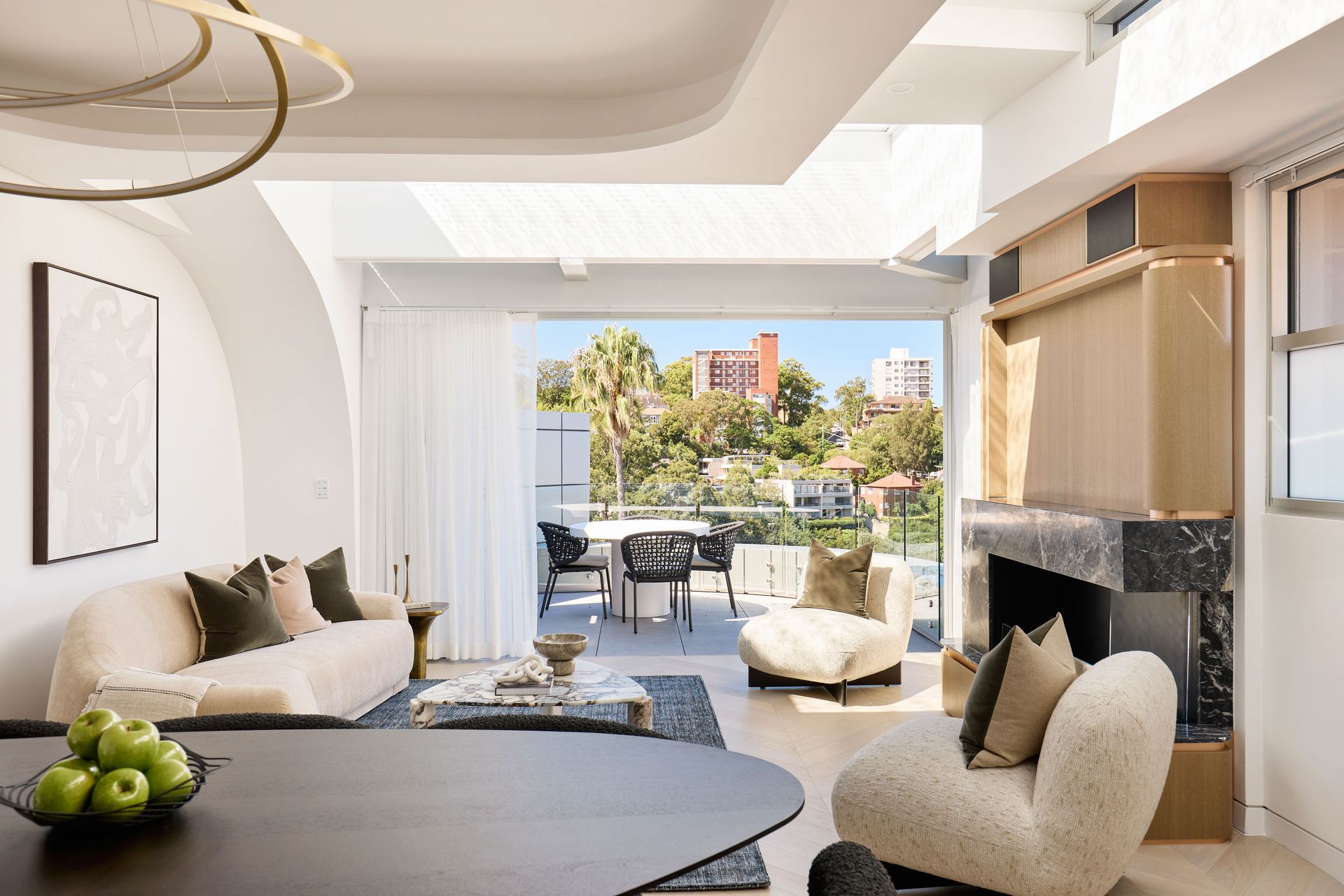Step inside and the open-plan living, dining, and kitchen area is illuminated by a dramatic skylight that floods the space with natural light throughout the day. Coved ceiling details frame the living zone, where a linen sofa, marble coffee table, and armchairs cluster around a built-in gas fireplace clad in Grigio Carnico marble. An orbital brass pendant anchors the dining area, set beside a dark oval table and bouclé dining chairs. A Triad speaker system and Control4 home automation manage sound, lighting, and motorized blinds throughout. The kitchen sits alongside, finished in Grigio Carnico marble across benchtops and splashback with Havwoods veneer joinery and the full Miele suite: oven, microwave, coffee machine, dishwasher, and induction cooktop, alongside a Fisher & Paykel integrated fridge, Vintec wine fridge, and Zip filtered water tap. Step out through the sliding glass doors, and the balcony opens to an unobstructed panorama of the city skyline and harbour, with outdoor dining furniture already in place.