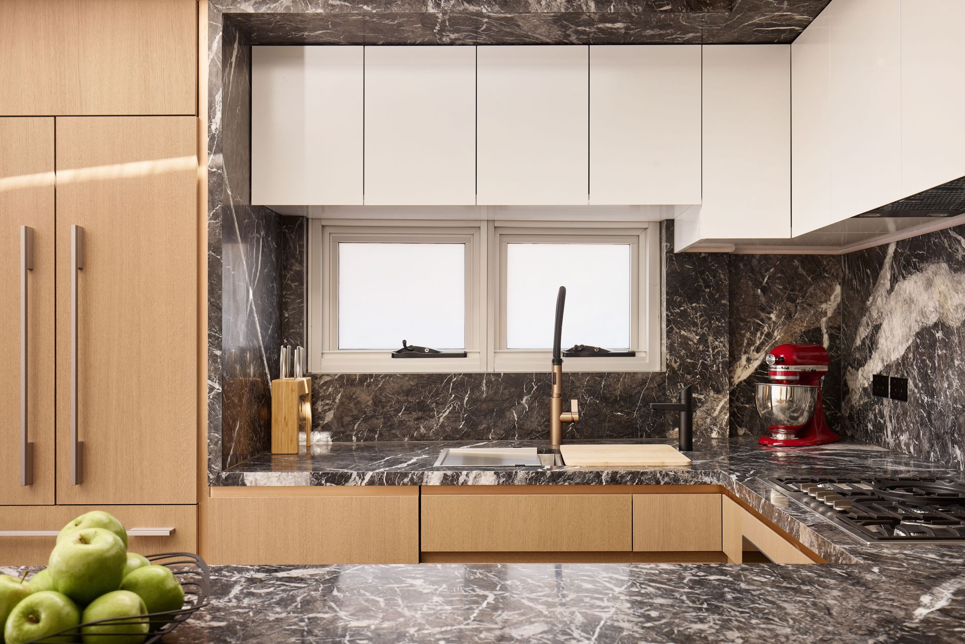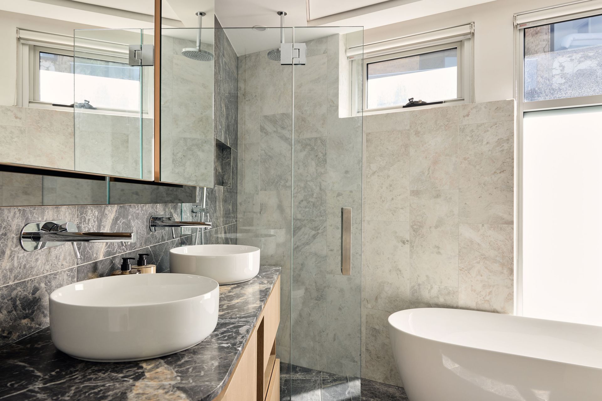 - Grigio Carnico (Brazil), Baltic White and Ash Black marble throughout bathrooms and kitchen