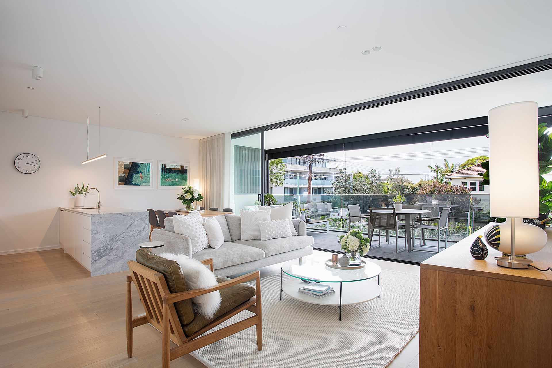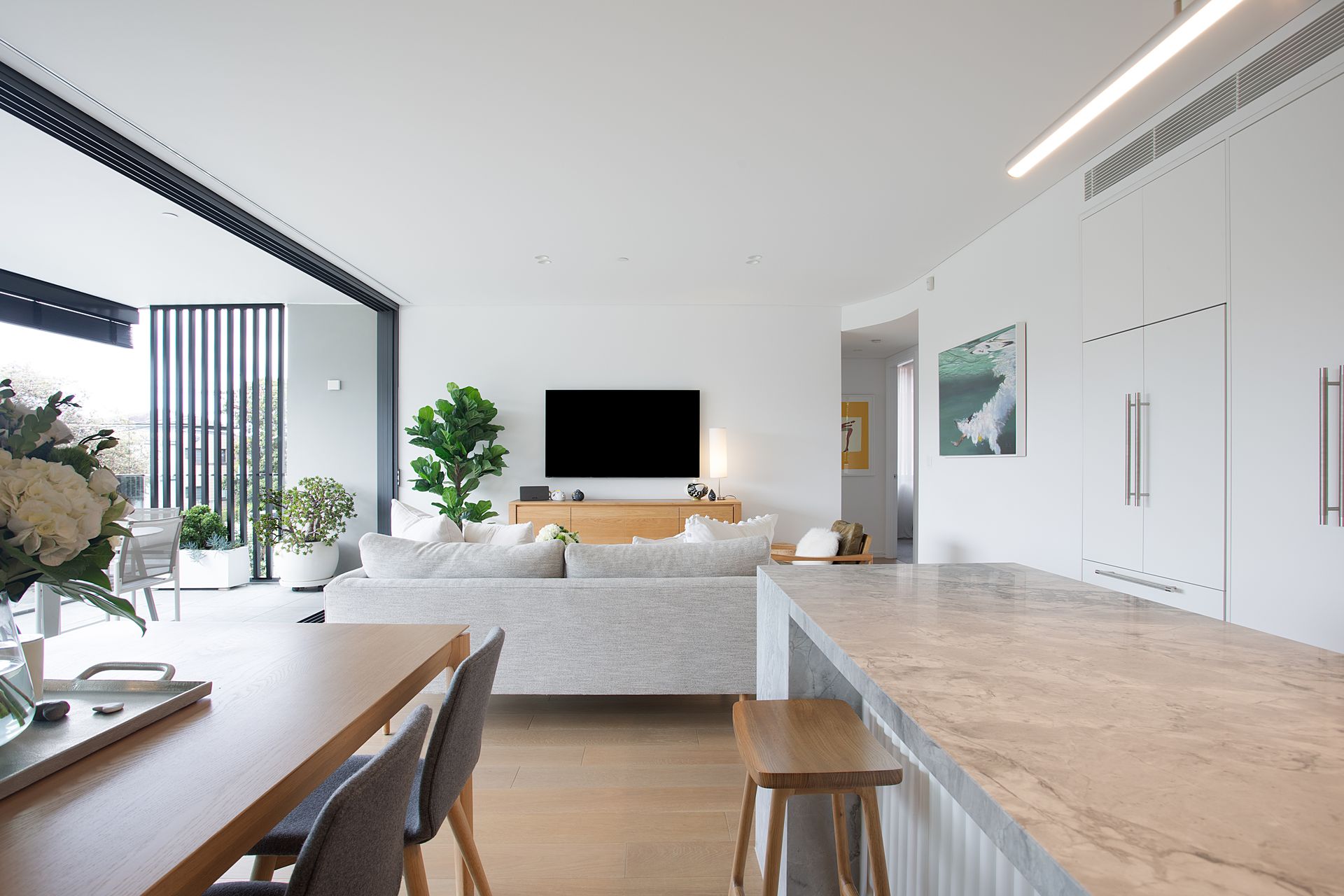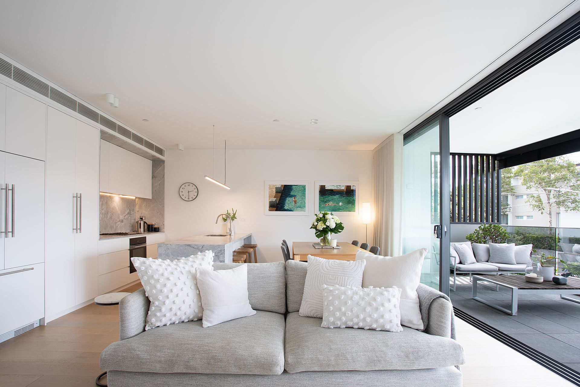 The kitchen centres around a striking marble island, with its stone surface extending from benchtop to splashback in one continuous sweep. Premium appliances and abundant storage sit behind sleek cabinetry, creating clean lines that maintain visual calm. The dining area seats six with views straight through to the balcony, where glass doors dissolve boundaries between inside and out.