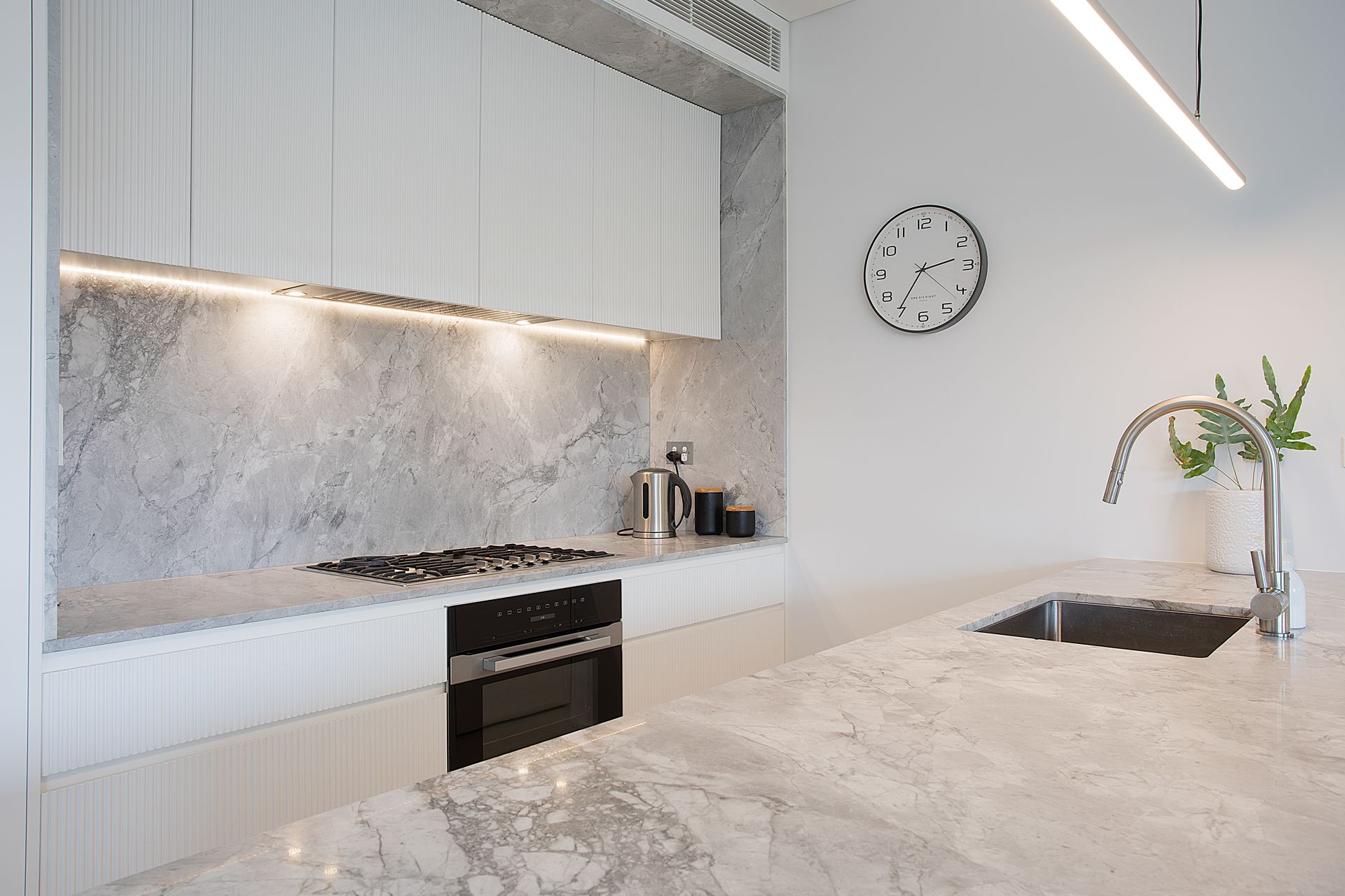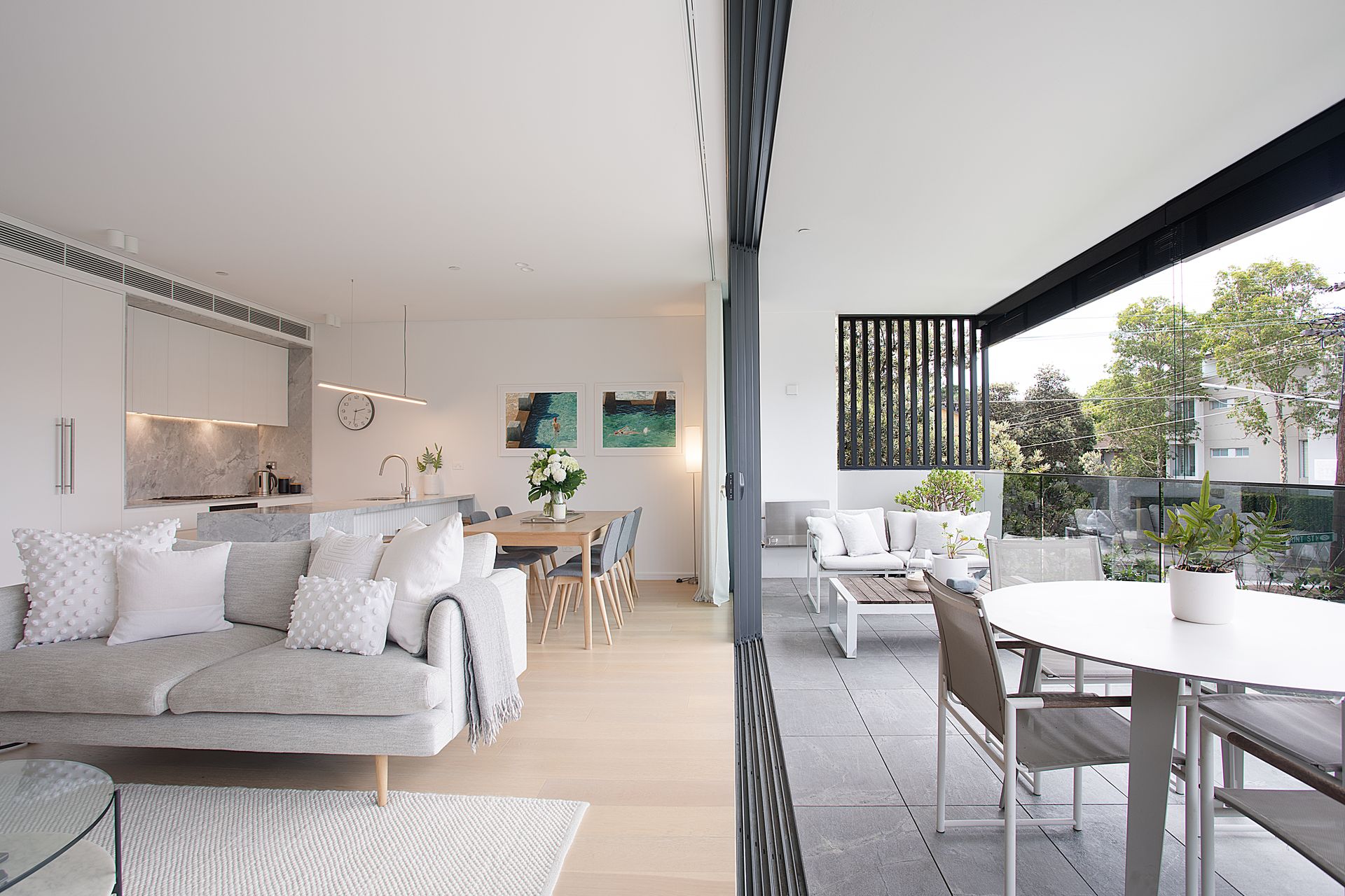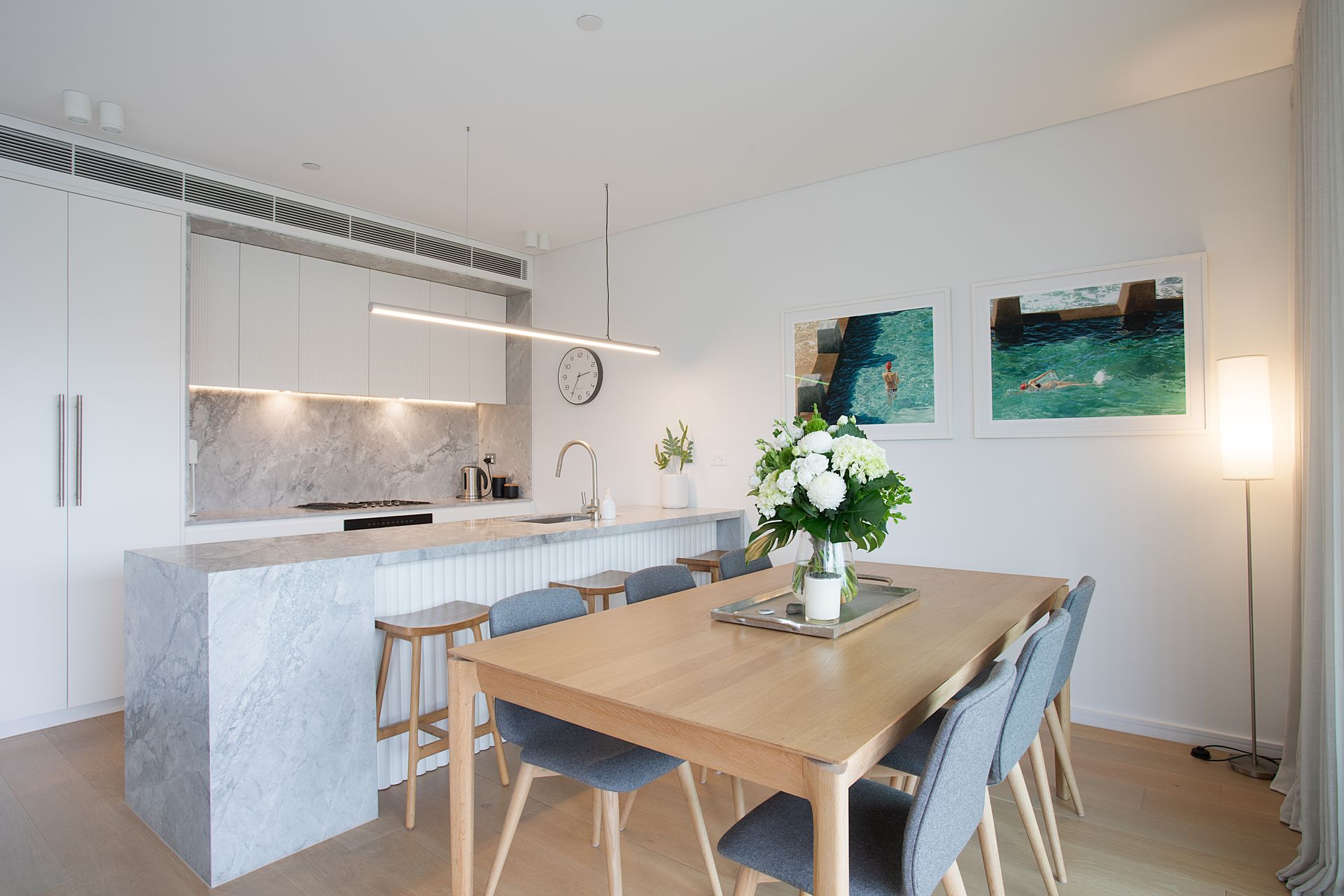 The kitchen centres around a striking marble island, with its stone surface extending from benchtop to splashback in one continuous sweep. Premium appliances and abundant storage sit behind sleek cabinetry, creating clean lines that maintain visual calm. The dining area seats six with views straight through to the balcony, where glass doors dissolve boundaries between inside and out.