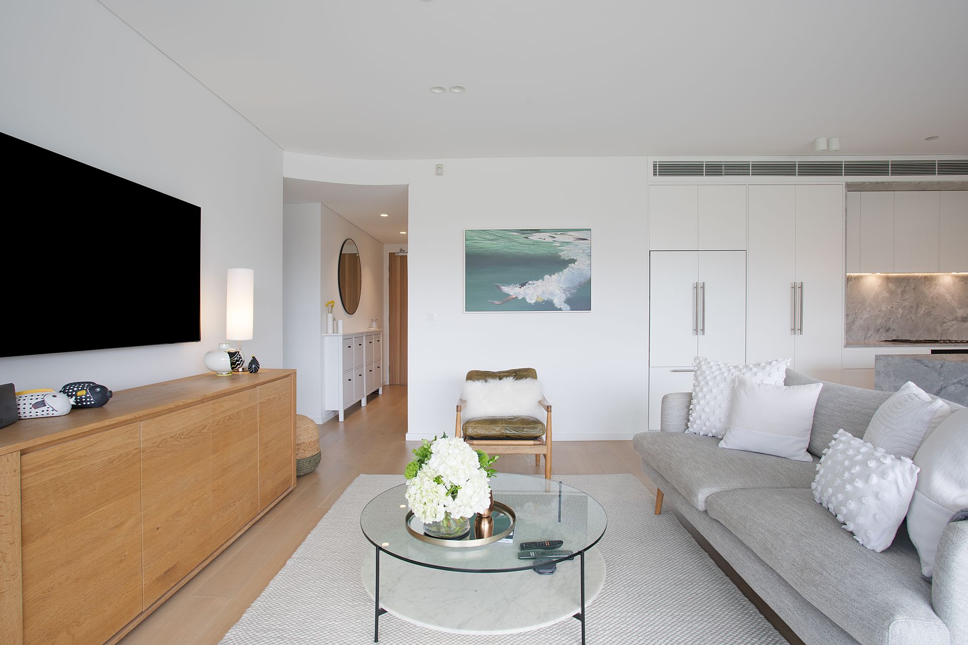 The open plan layout unites kitchen, dining and lounge in seamless flow. Natural light floods through expansive windows while the private balcony extends your living space outdoors. A gas BBQ stands ready for weekend lunches that stretch into the afternoon. This becomes your post beach gathering spot, your quiet evening retreat, your weekend hosting zone where indoor comfort meets outdoor air.