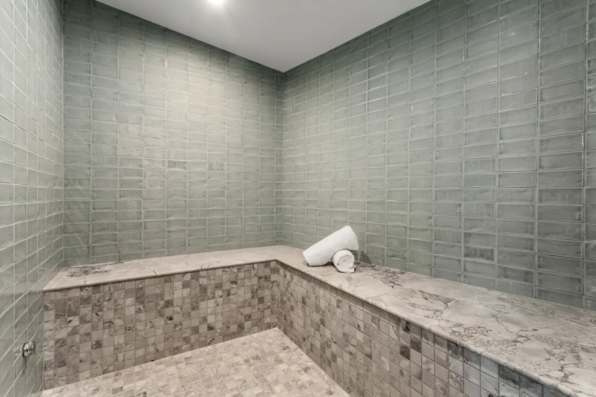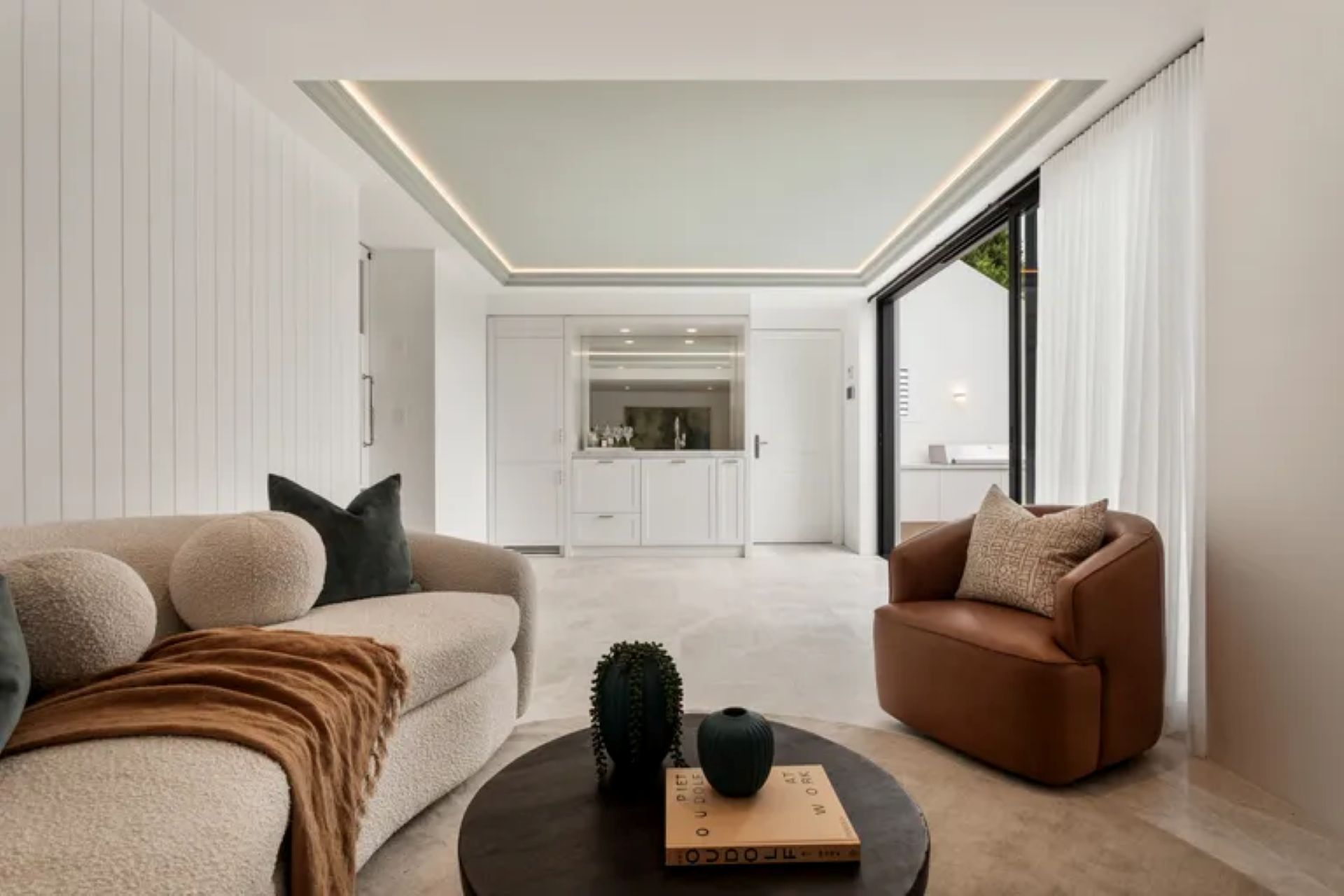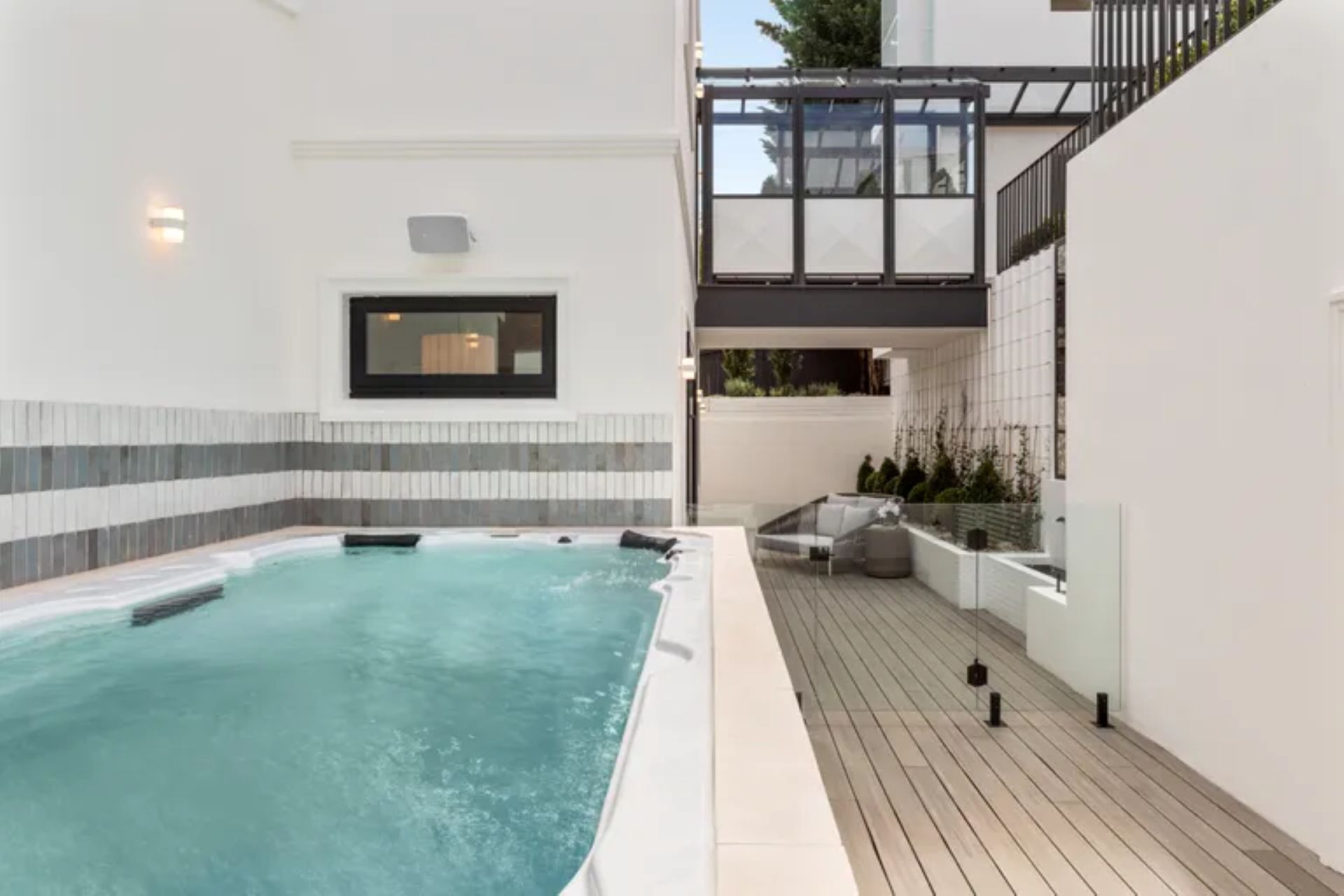 Five luxurious bedrooms are spread across all levels with lift access throughout. A studio bedroom on the entry level includes a queen bed, lounge, office nook, steam bathroom, and powder room and access to a second butler's kitchen. The lower-ground level hosts the master suite, a private sanctuary in itself, complete with a comfortable lounge area, a lavish king-size bed which opens seamlessly onto a sun-drenched terrace, where a spa and outdoor lounges offer the perfect spot for unwinding. The suite also includes an expansive walk-in robe and a lavish bathroom featuring both a deep soaking bath and a separate shower. Three refined queen bedrooms complete this level, each with walk-in robes, ensuites, office nooks, and balcony access. A fifth bedroom on the first floor features a queen bed, built-ins, ensuite, and a Juliet style balcony. Eight luxurious bathrooms, including the indulgent steam room, ensure absolute comfort for all guests. Additional amenities include a laundry with washer and dryer and a four-car garage, including two at entry level and two at the pool house.