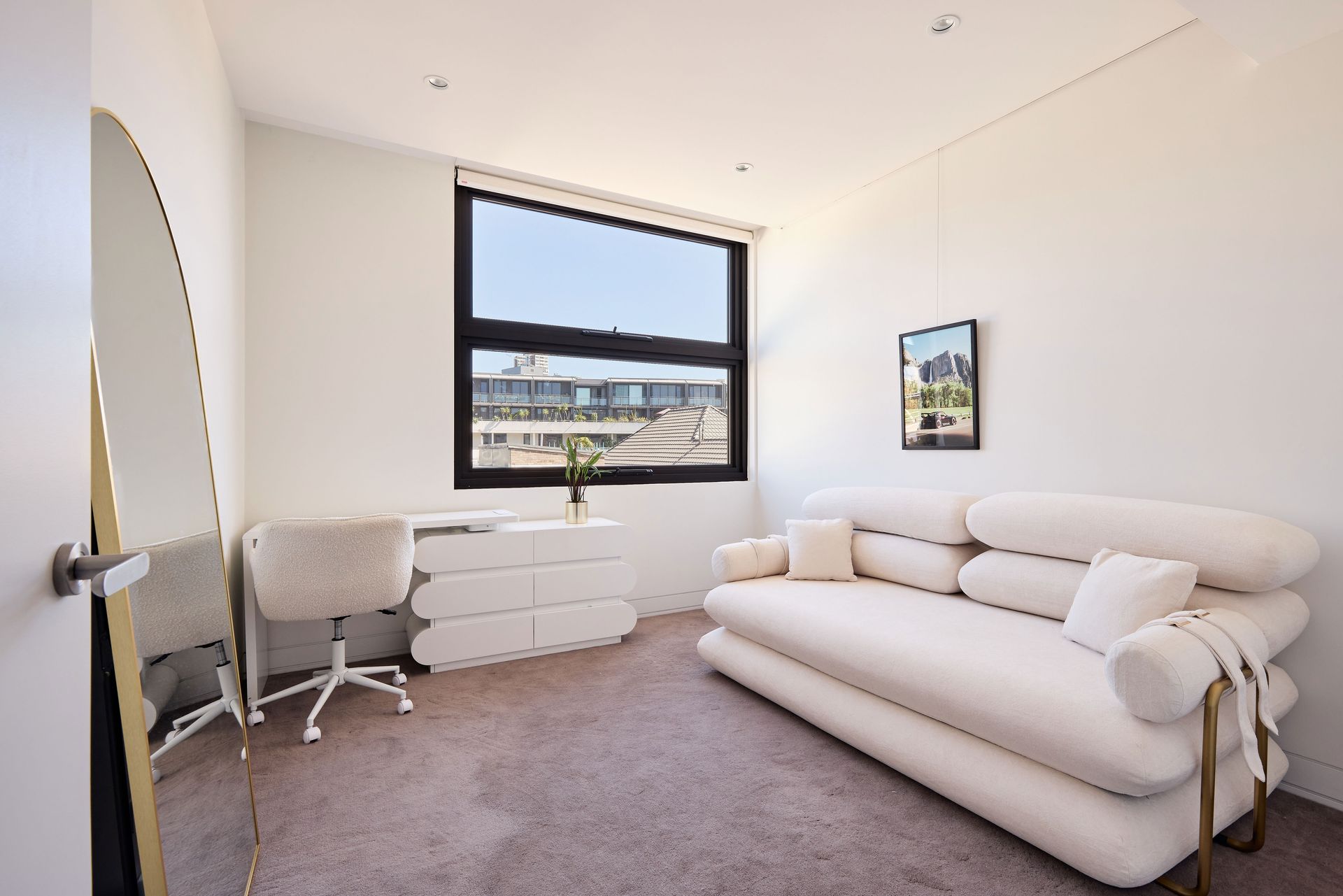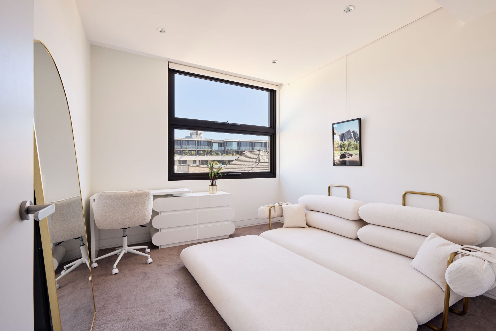 The master bedroom offers a serene, white-toned sanctuary, featuring wall-to-wall built-in robes and a dedicated dressing area. The king bed anchors the room, leading through to a luxurious ensuite finished in Arabescato marble, with a freestanding soaking tub, frameless glass shower, twin vessel basins, and a dark-stained vanity. The second bedroom, with a king bed, opens directly to a private terrace and includes ample built-in storage. The third bedroom serves a dual purpose as both a home office and guest accommodation, furnished with a sofa bed, a full-length gold-frame mirror, and a large casement window that frames the sky above.