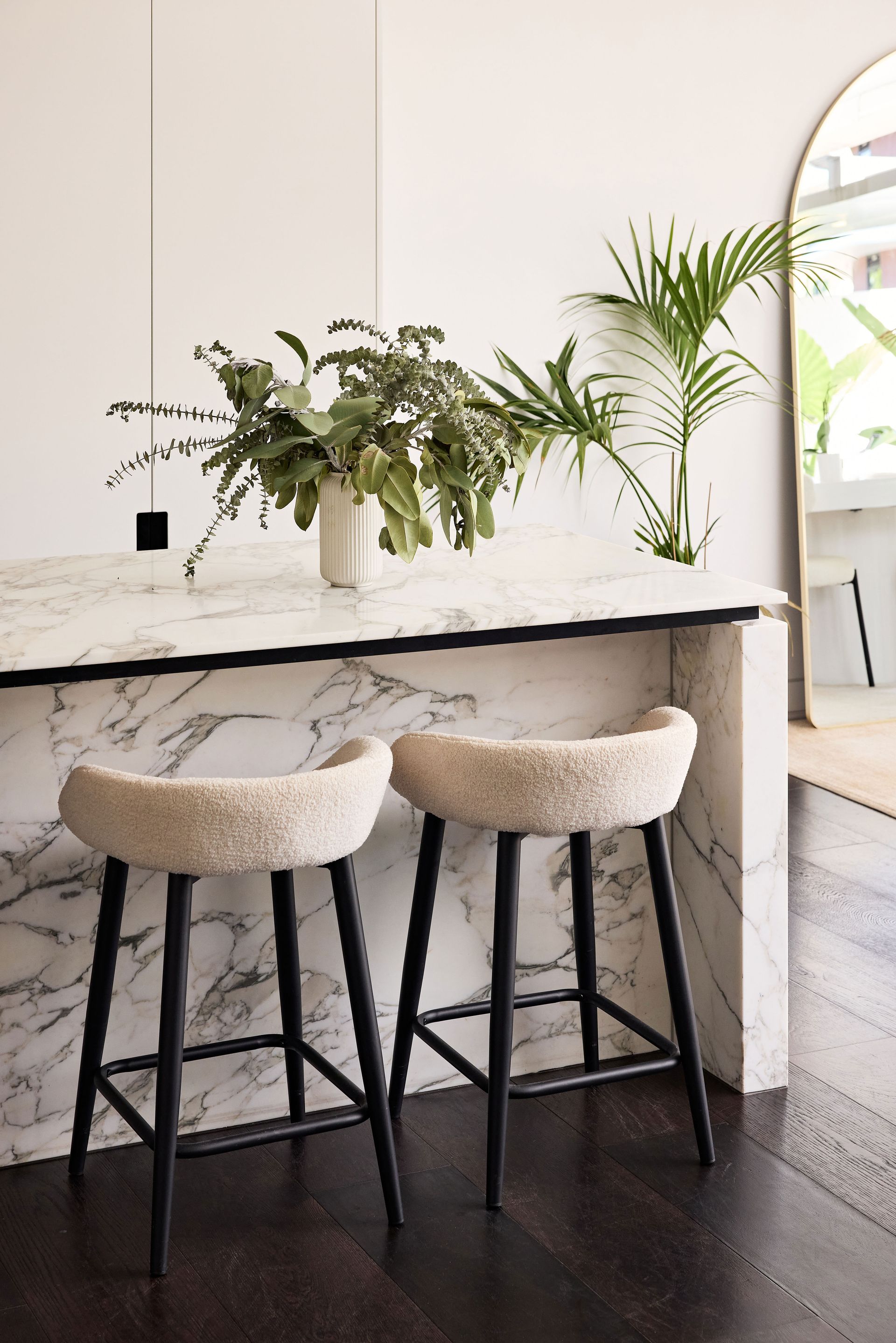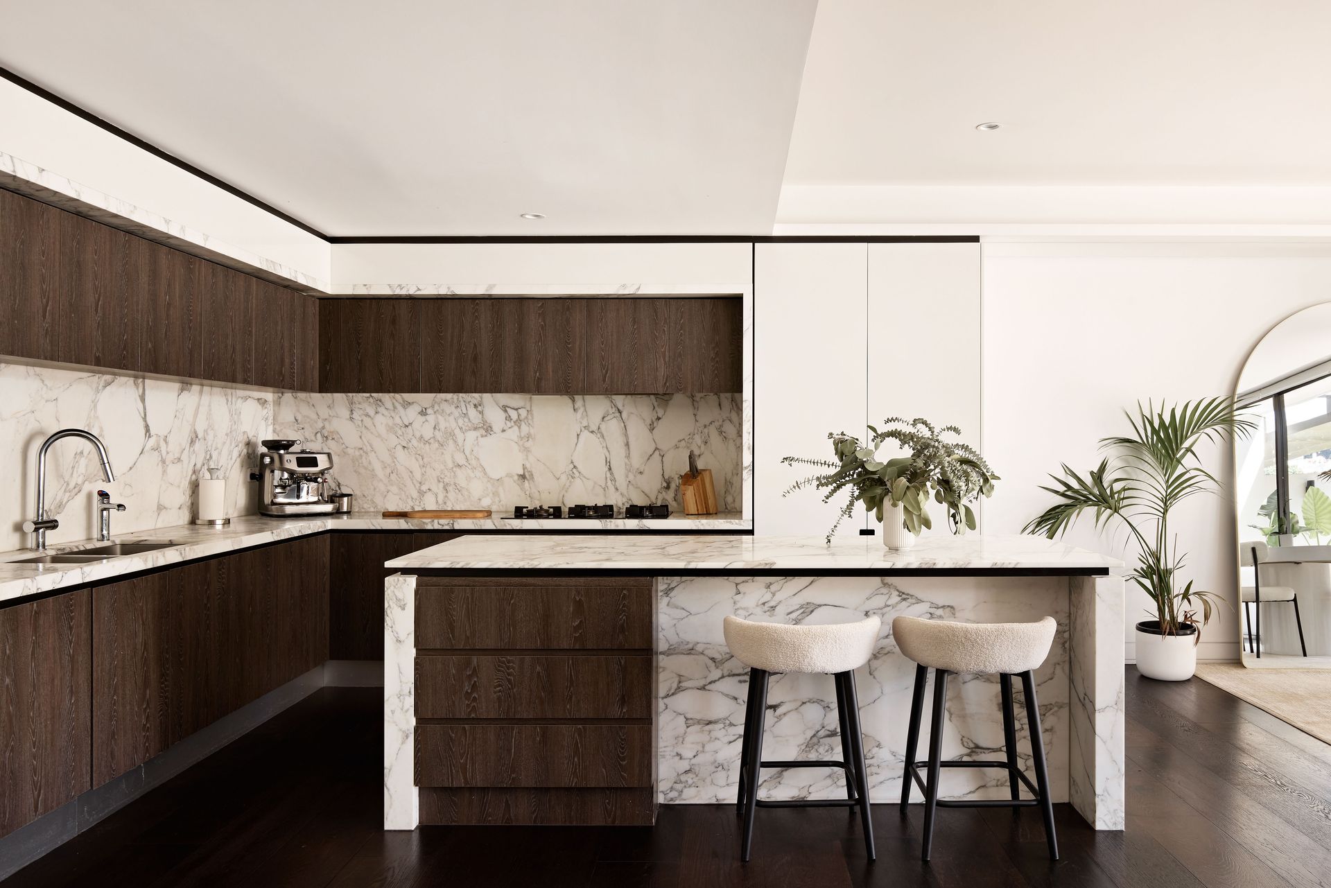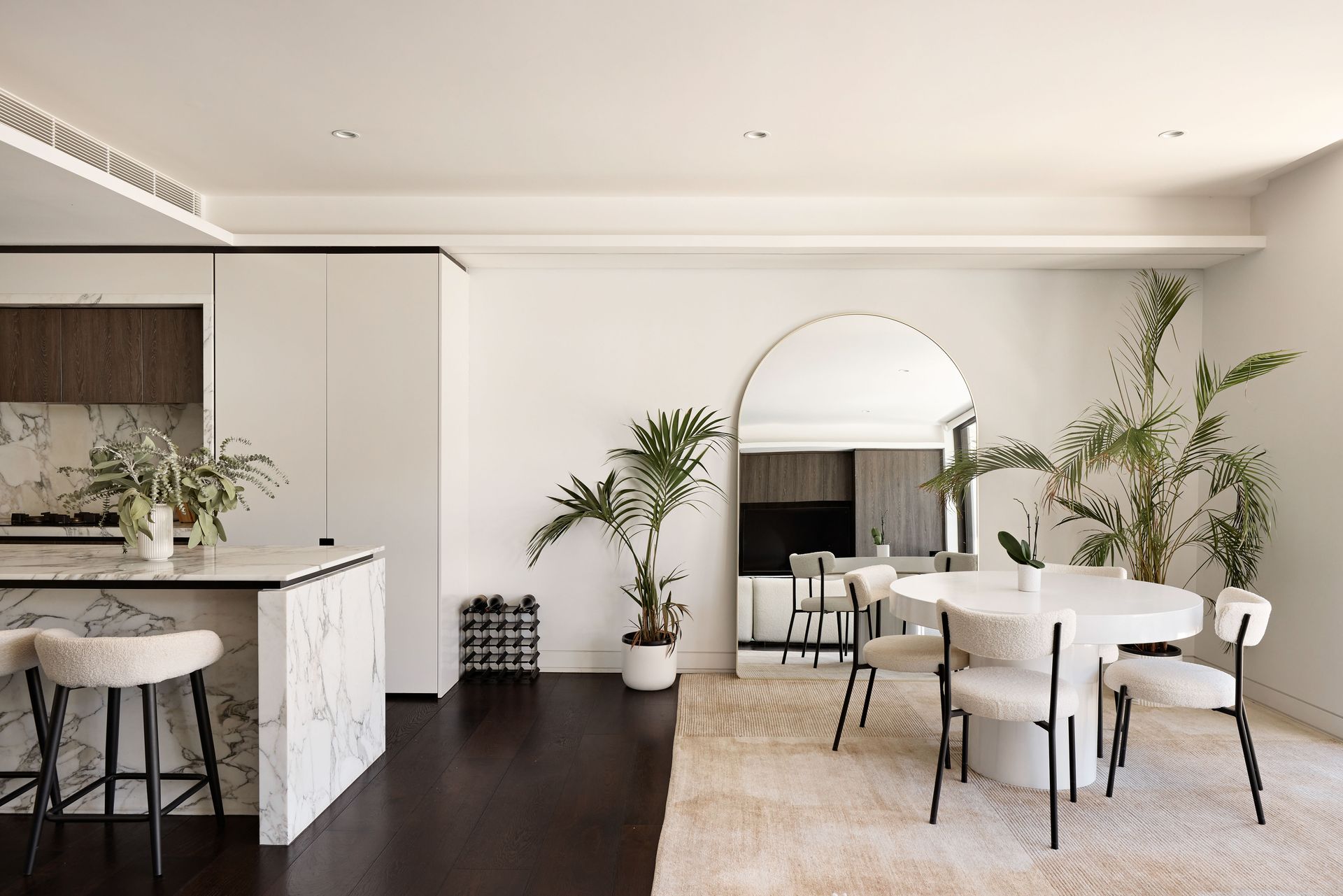The kitchen is a stunning showcase of materials, with Arabescato marble running from the benchtop up to the full-height splashback, seamlessly complementing the dark-stained oak cabinetry. Fully equipped with premium Liebherr refrigeration and V-ZUG appliances, the kitchen is as functional as it is beautiful. The marble island bench, paired with two boucle bar stools, becomes the heart of the home, ideal for weekend breakfasts, lingering conversations, or the overflow from a dinner party. Adjacent to the kitchen, the dining area features a round white table, with a full-arch mirror that visually expands the space.
