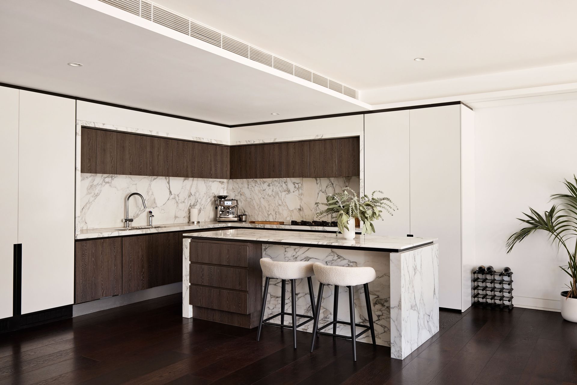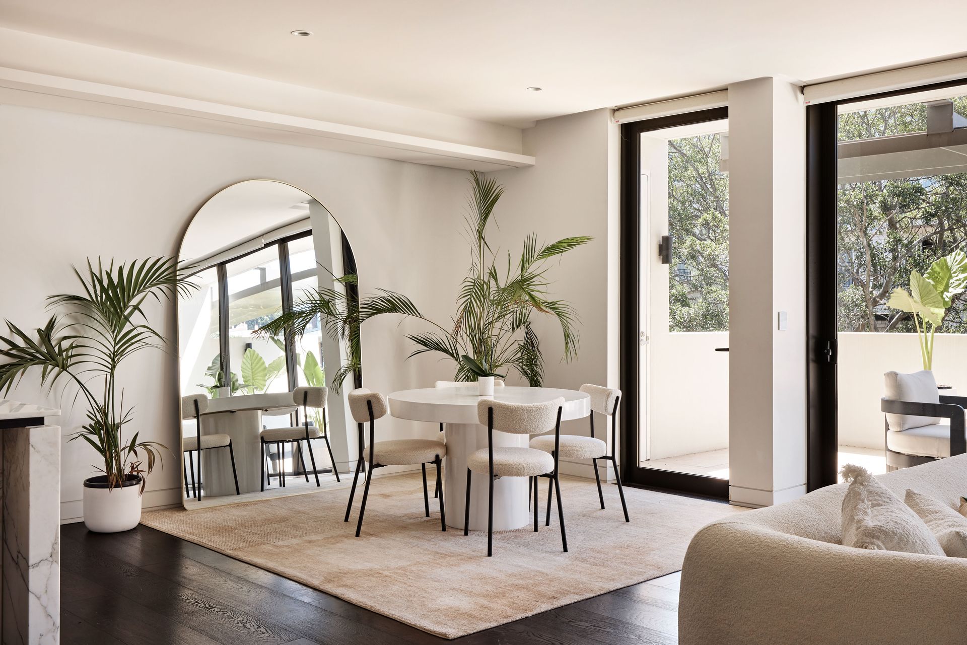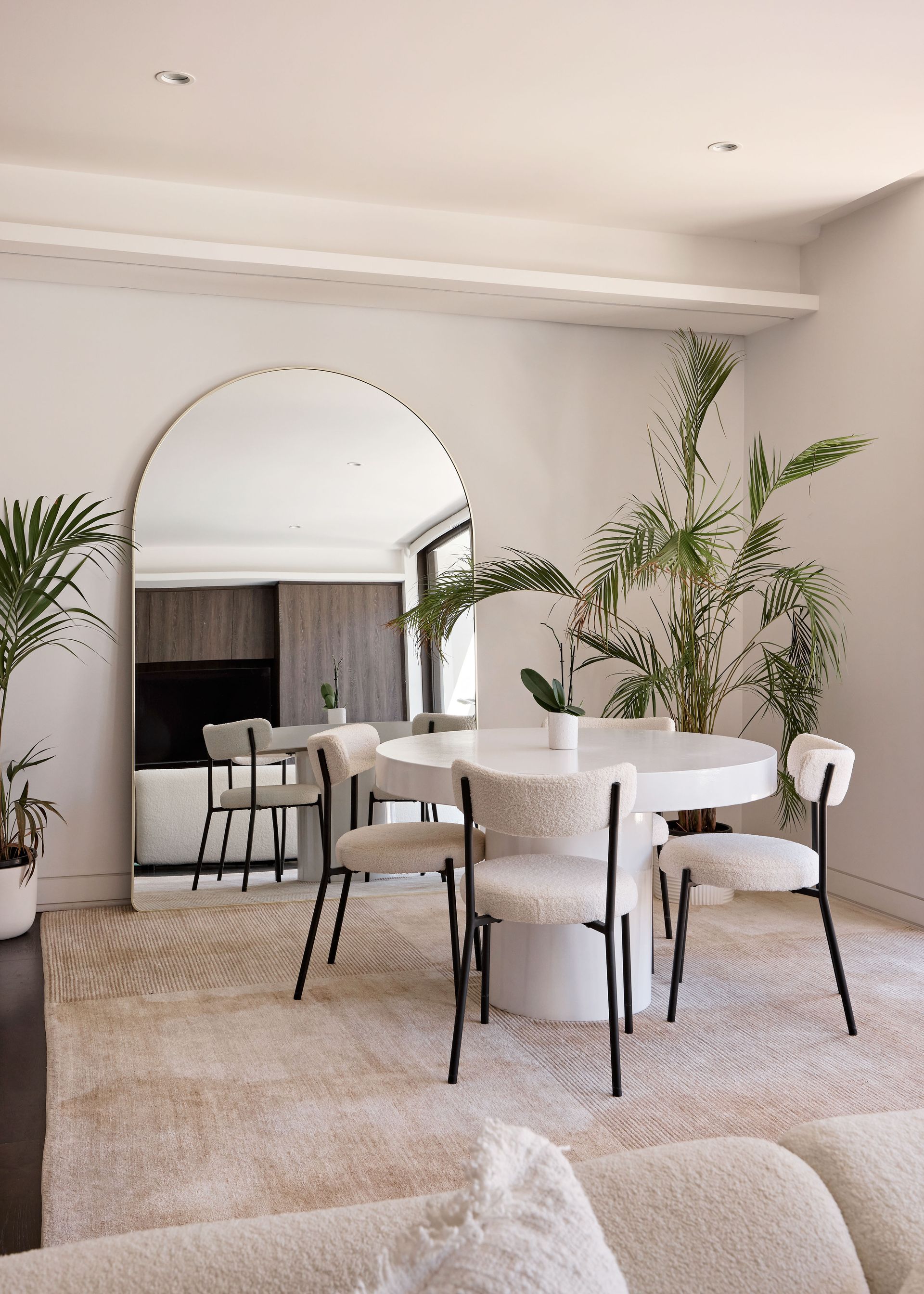 The kitchen is a stunning showcase of materials, with Arabescato marble running from the benchtop up to the full-height splashback, seamlessly complementing the dark-stained oak cabinetry. Fully equipped with premium Liebherr refrigeration and V-ZUG appliances, the kitchen is as functional as it is beautiful. The marble island bench, paired with two boucle bar stools, becomes the heart of the home, ideal for weekend breakfasts, lingering conversations, or the overflow from a dinner party. Adjacent to the kitchen, the dining area features a round white table, with a full-arch mirror that visually expands the space.