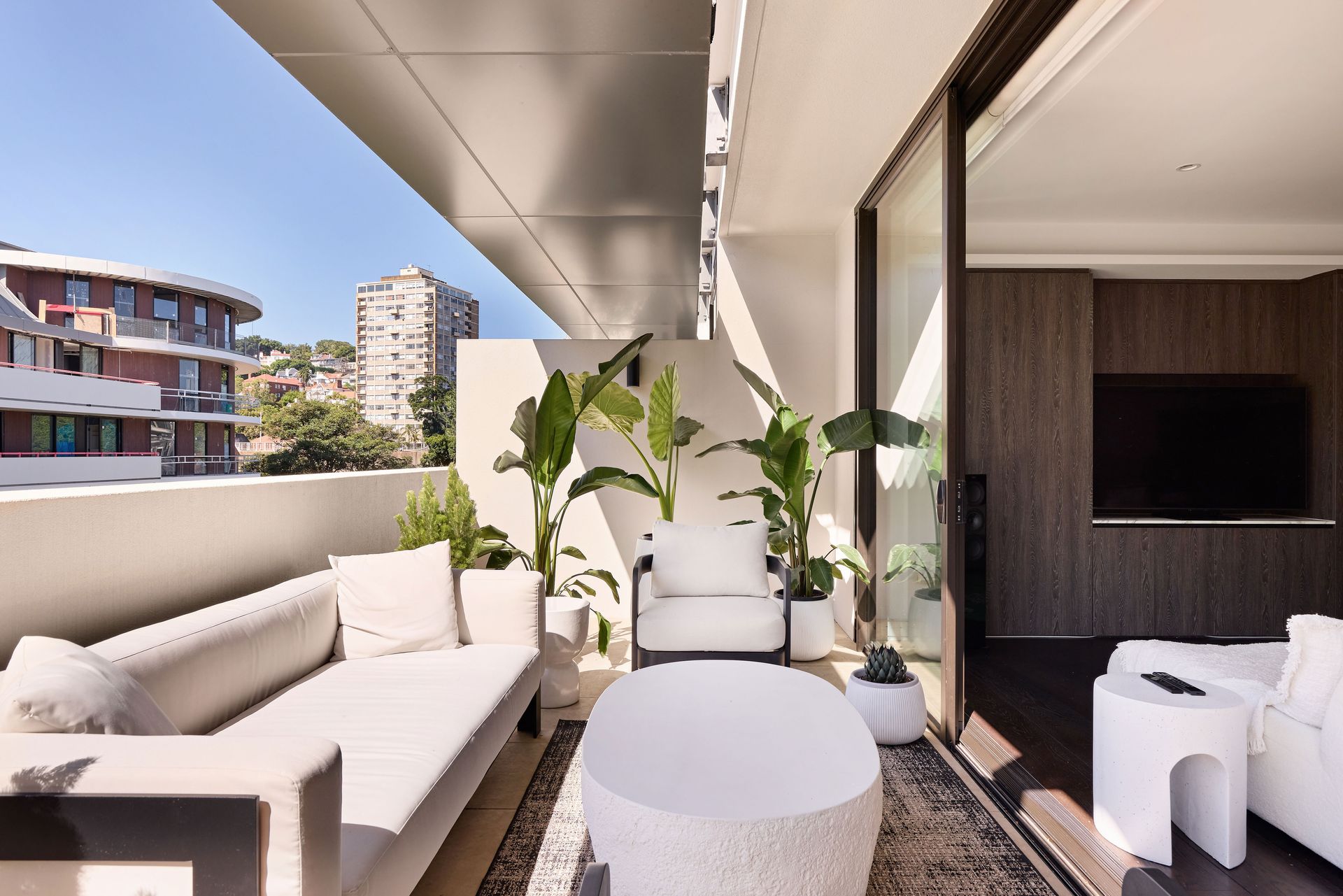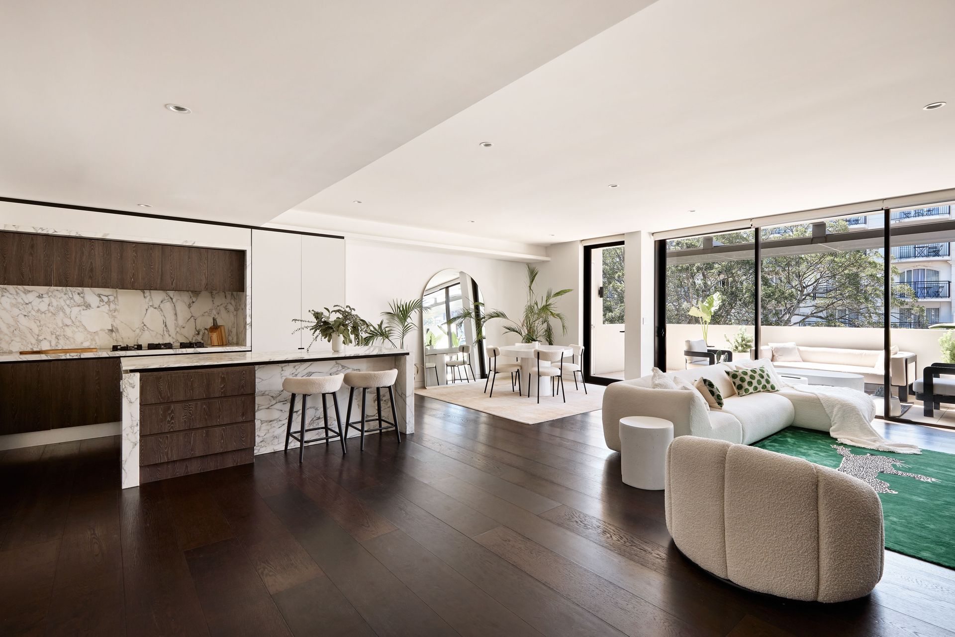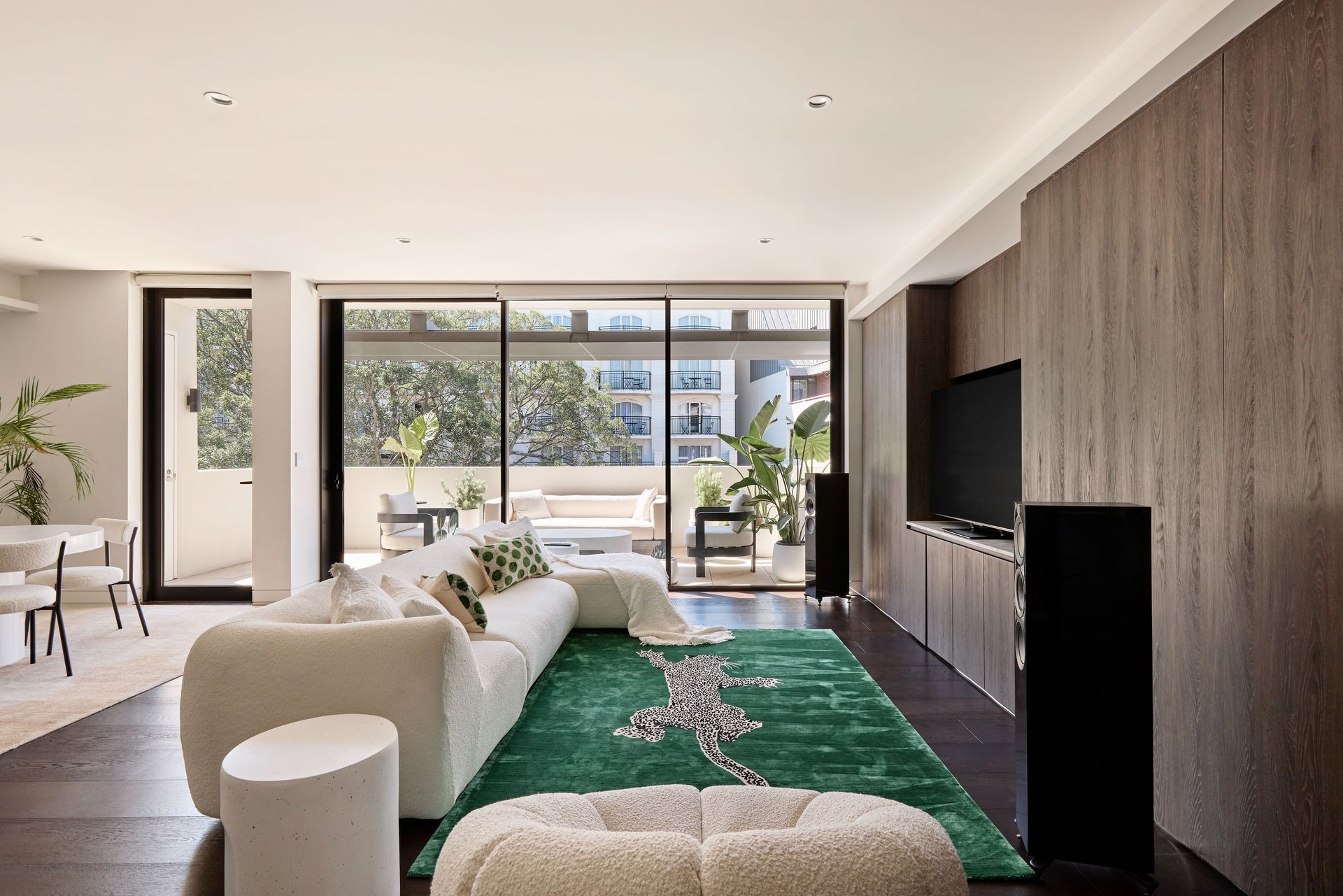 The open-plan living and dining area welcomes you with floor-to-ceiling sliding glass doors that frame the view of the private, covered terrace. The apartment’s generous northerly aspect floods each room with natural light, creating a warm and inviting atmosphere throughout the day. The living space is designed with both comfort and style in mind, featuring low-slung boucle sofas, a statement green rug, and dark-grain timber cabinetry. These elements, combined with sculptural furniture, offer a stylish yet inviting place to relax and entertain. The terrace extends the living area outdoors, furnished with a plush outdoor sofa, armchairs, a sculptural coffee table, and generous greenery, making it the perfect spot for a morning coffee or an evening glass of wine under the open sky.