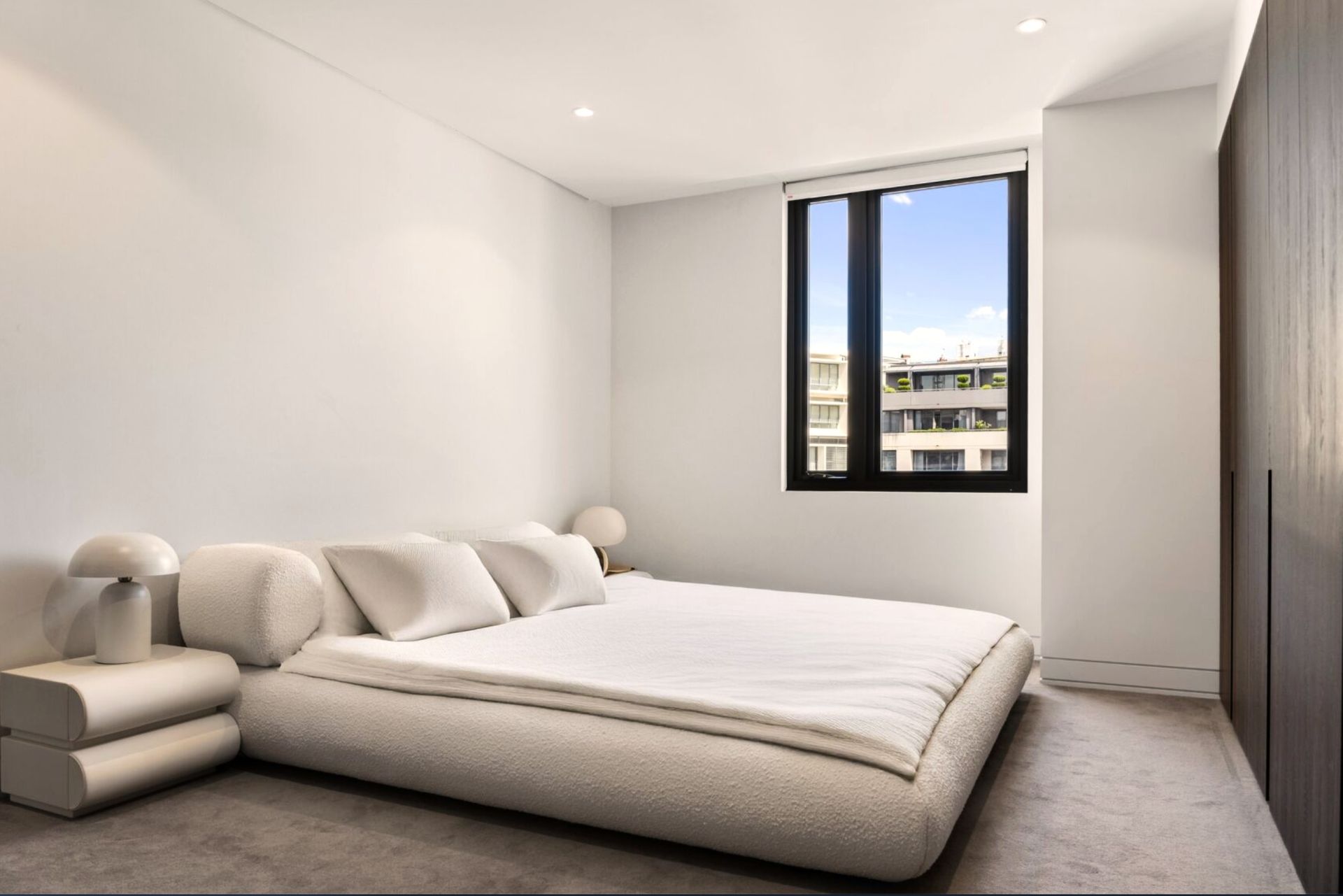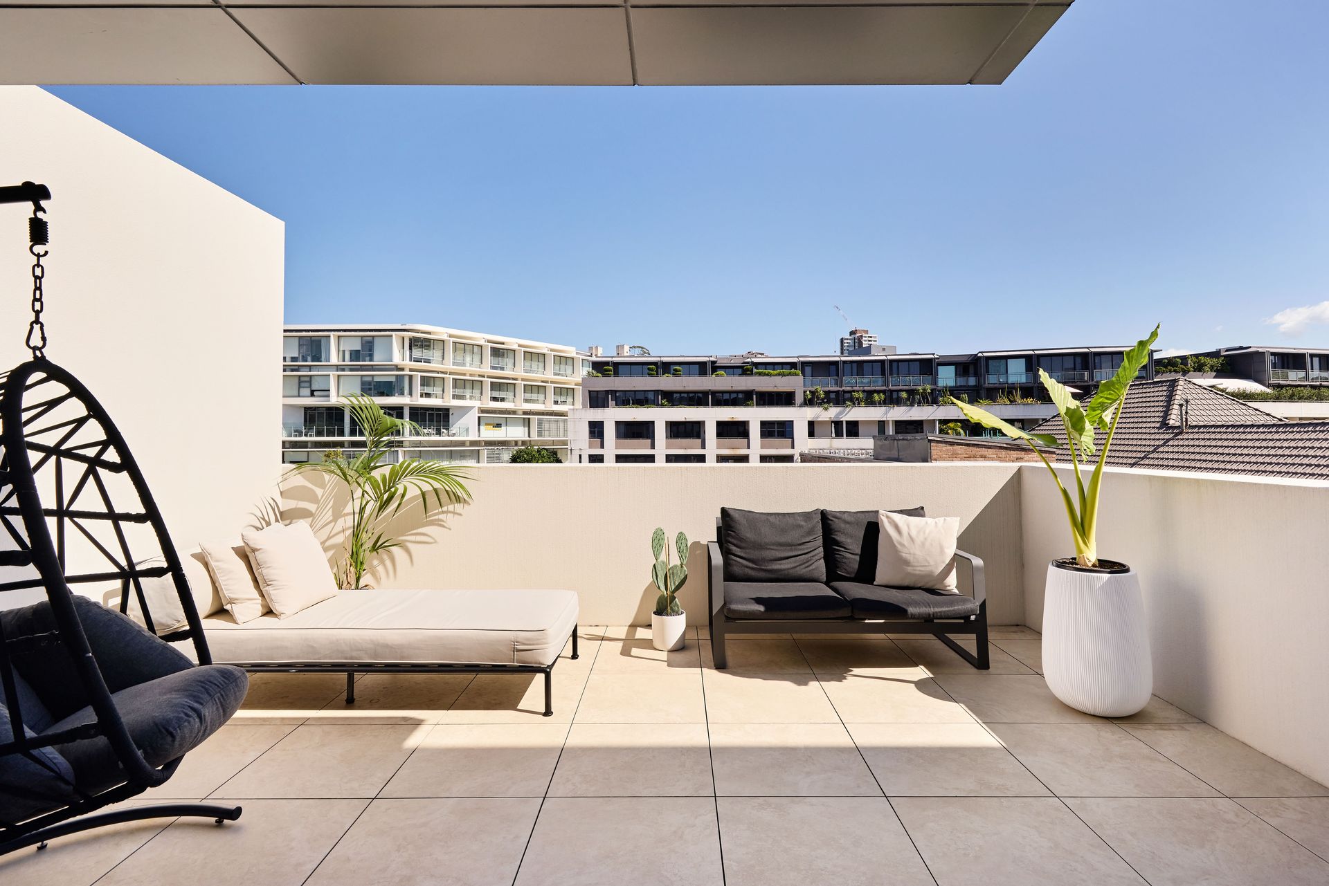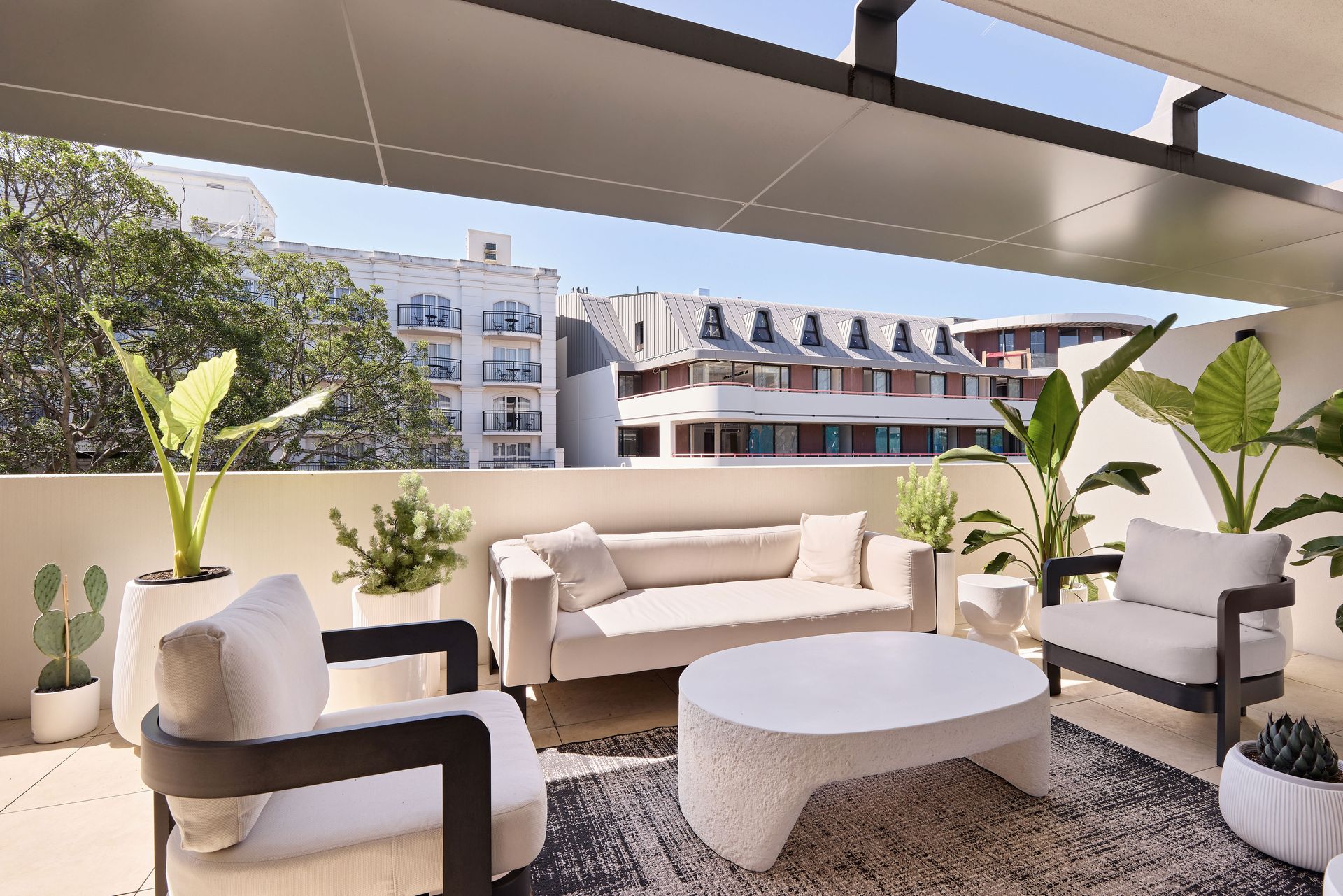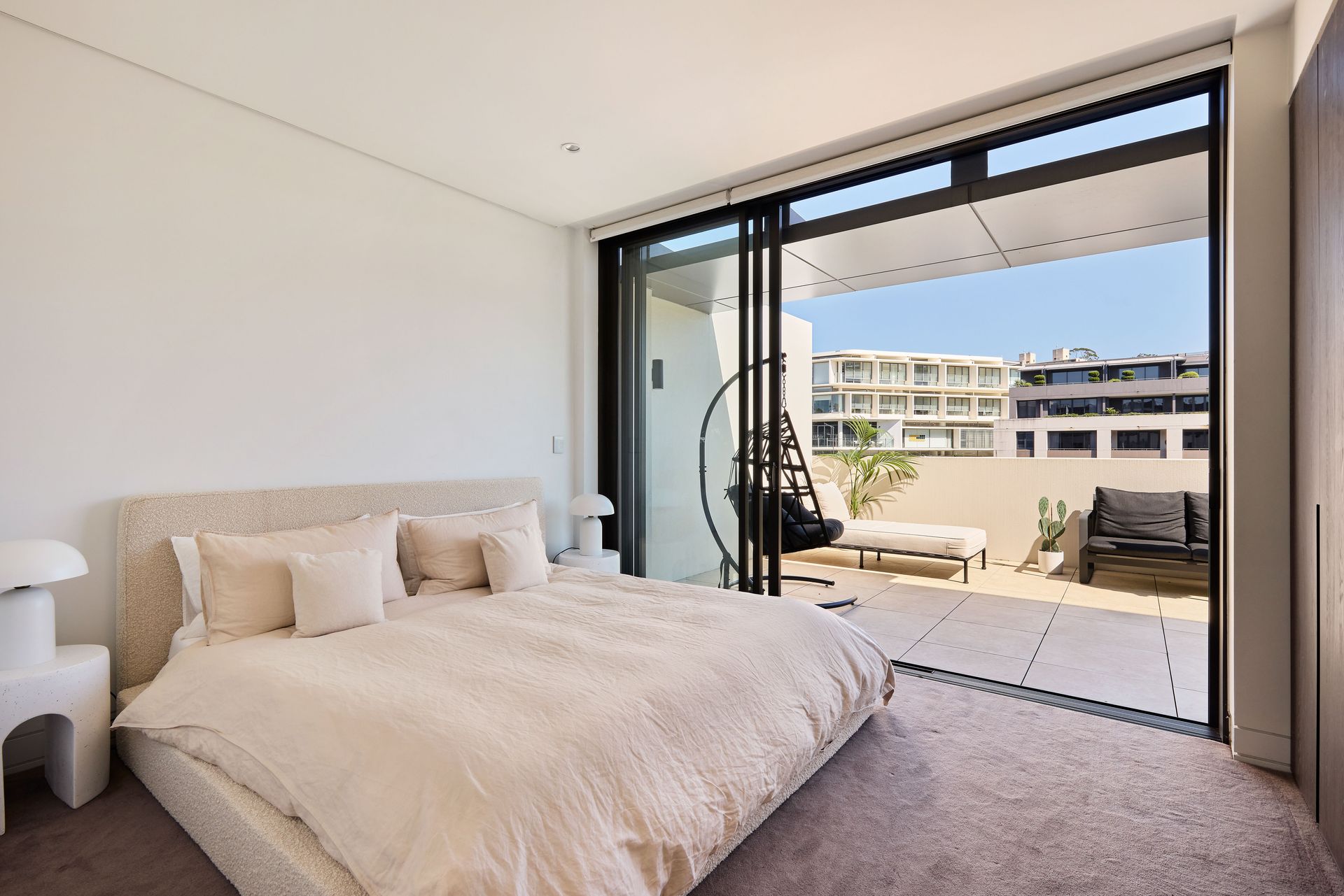 The open-plan living and dining area welcomes you with floor-to-ceiling sliding glass doors that frame the view of the private, covered terrace. The apartment’s generous northerly aspect floods each room with natural light, creating a warm and inviting atmosphere throughout the day. The living space is designed with both comfort and style in mind, featuring low-slung boucle sofas, a statement green rug, and dark-grain timber cabinetry. These elements, combined with sculptural furniture, offer a stylish yet inviting place to relax and entertain. The terrace extends the living area outdoors, furnished with a plush outdoor sofa, armchairs, a sculptural coffee table, and generous greenery, making it the perfect spot for a morning coffee or an evening glass of wine under the open sky.