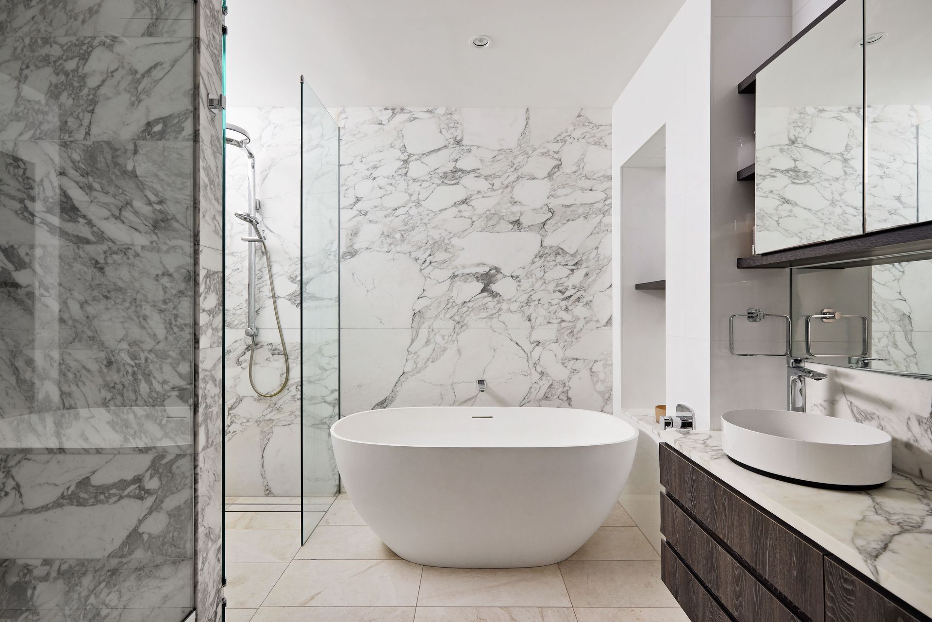 - Full marble ensuite with freestanding soaking tub, twin basins and frameless glass shower