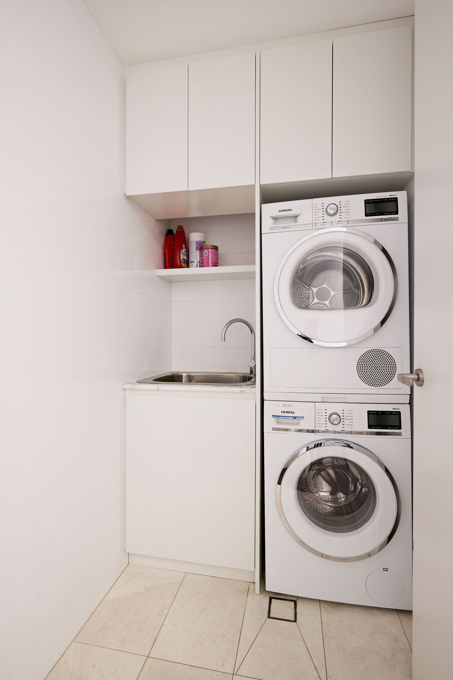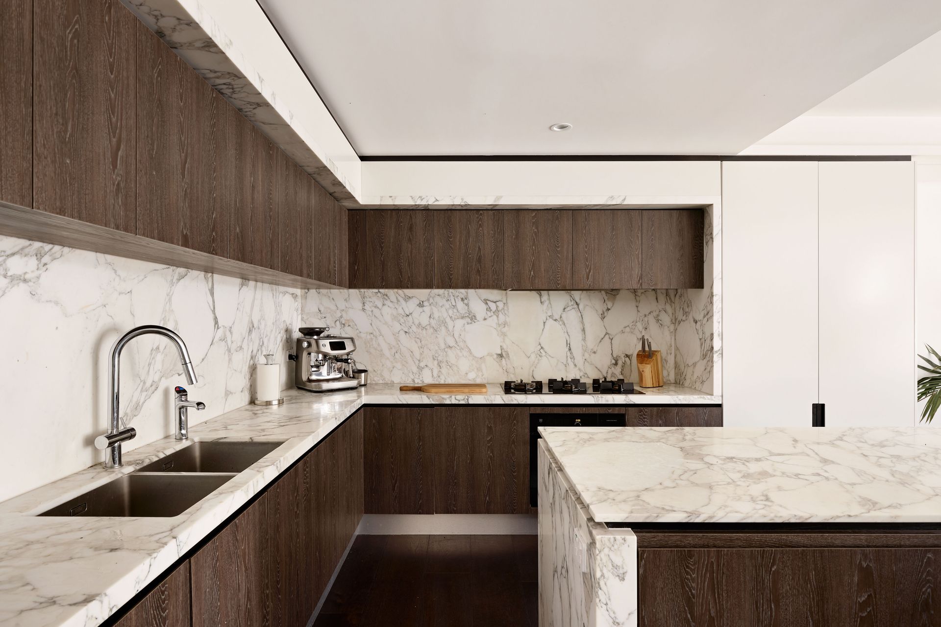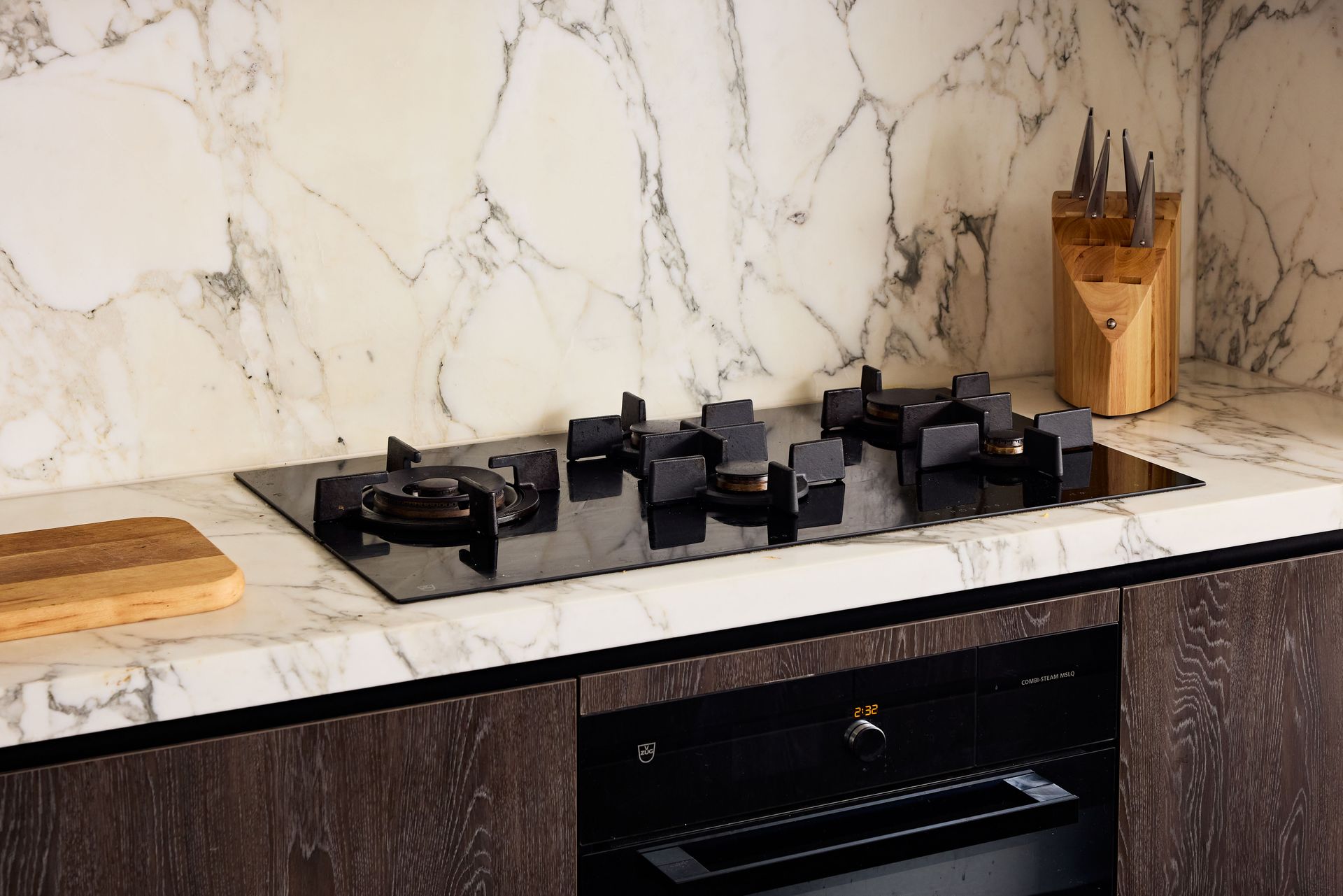 - Gas cooking with full-height marble splashback and benchtop