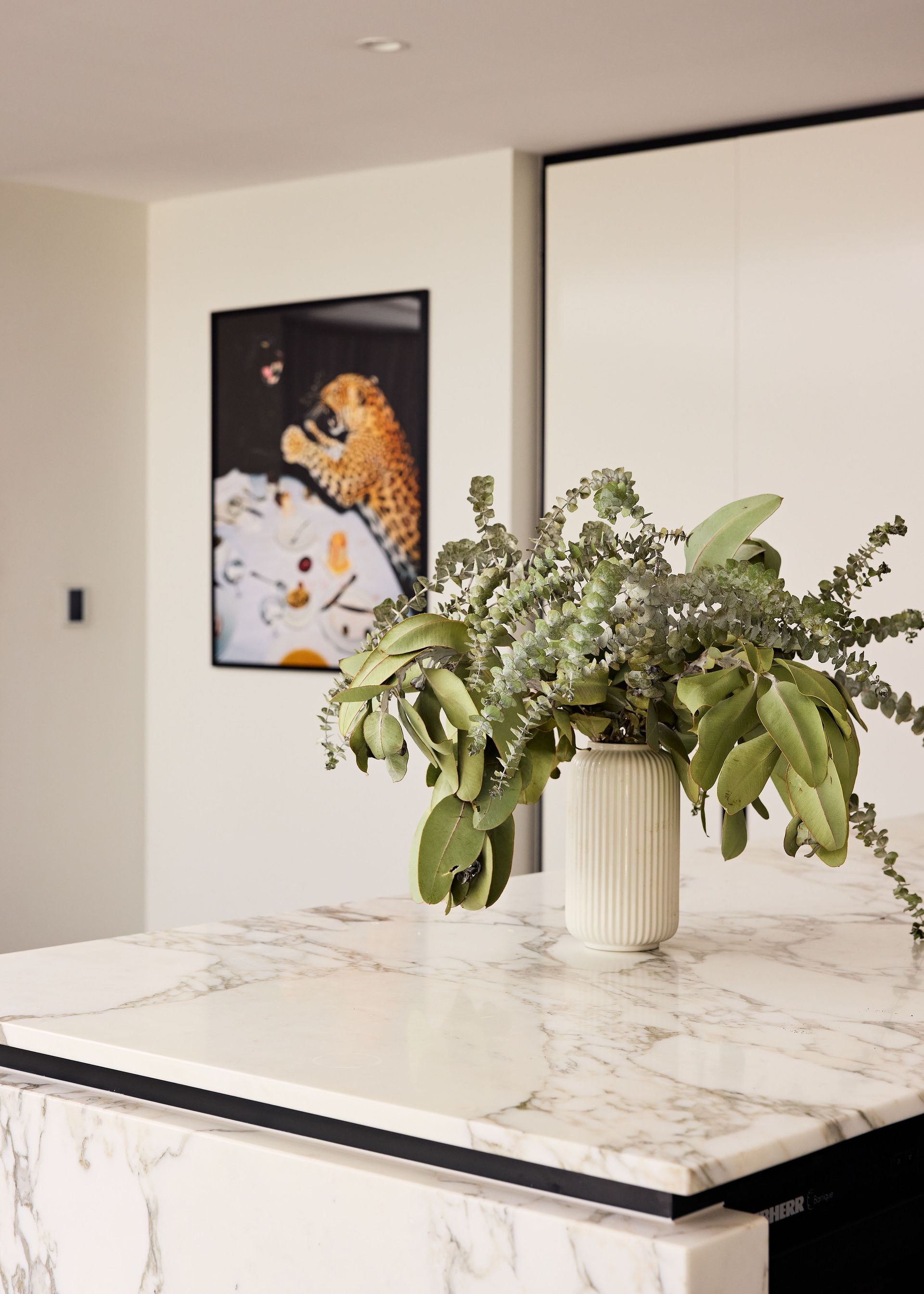 - Arabescato marble island kitchen with integrated Liebherr refrigerator and V-ZUG appliances
