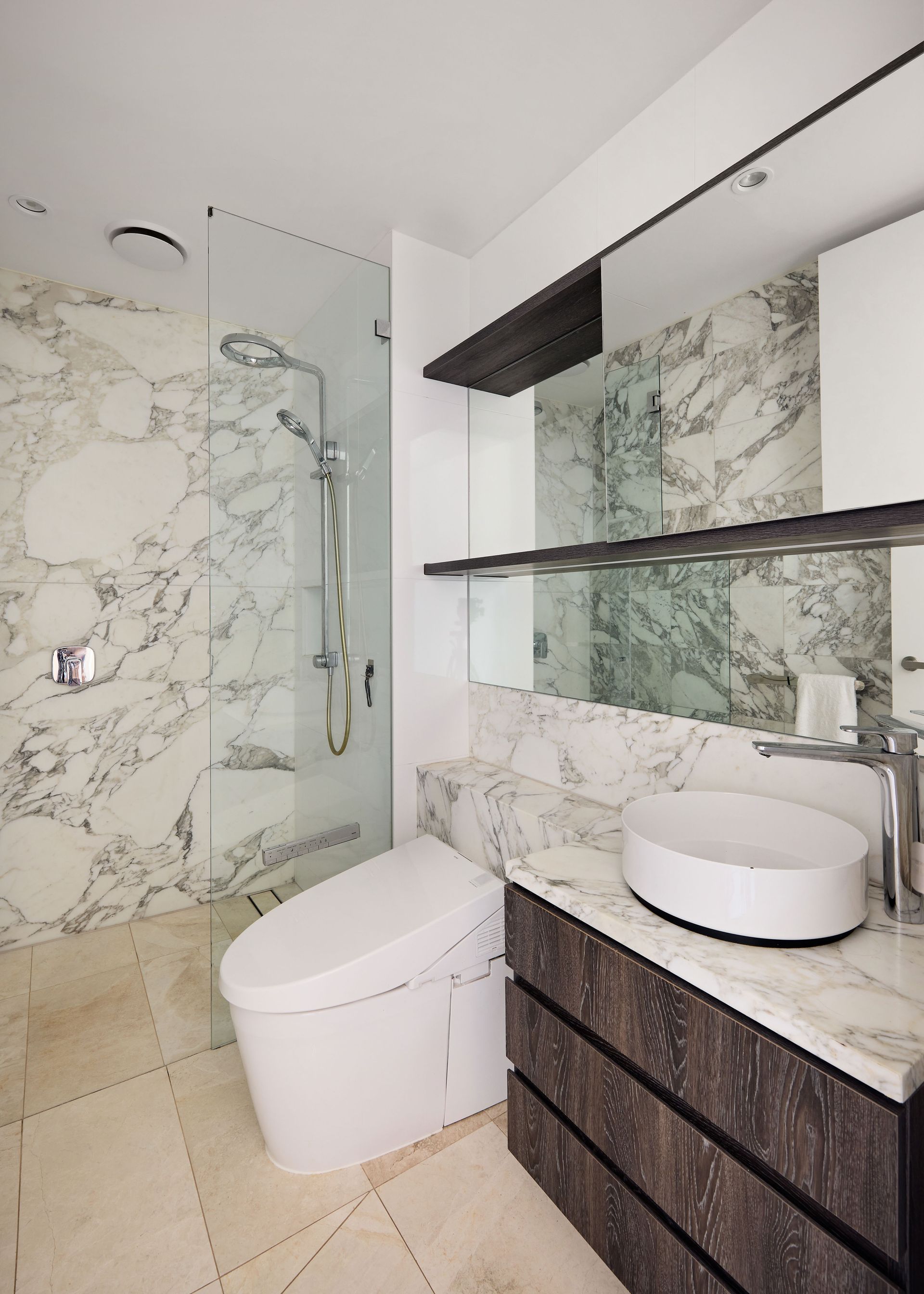 Both bathrooms are completed with the same Arabescato stone, featuring bidet toilets and polished chrome fittings throughout, while a convenient guest powder room completes the floor plan. The apartment is fully equipped with ducted air conditioning and one secure underground parking space - a rarity in one of Sydney’s most sought-after locations.