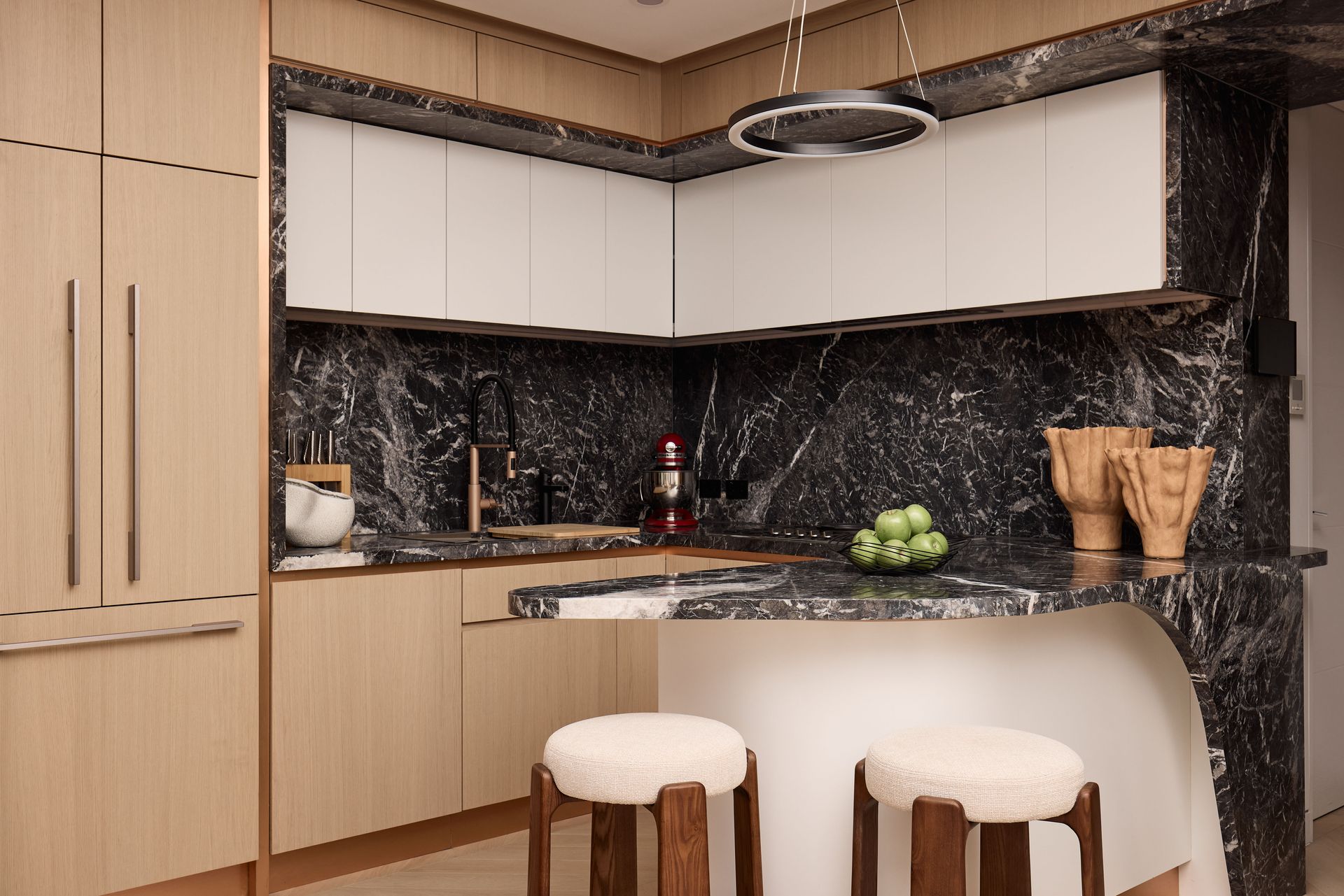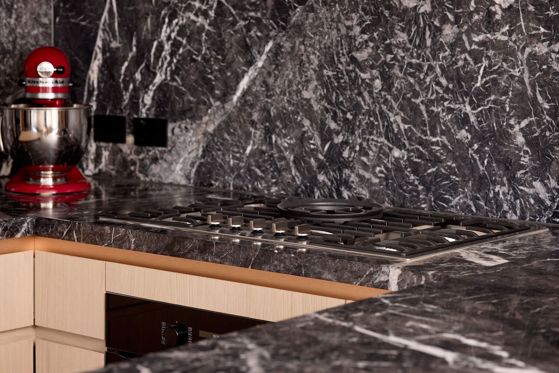 - Grigio Carnico (Brazil), Baltic White and Ash Black marble throughout bathrooms and kitchen
