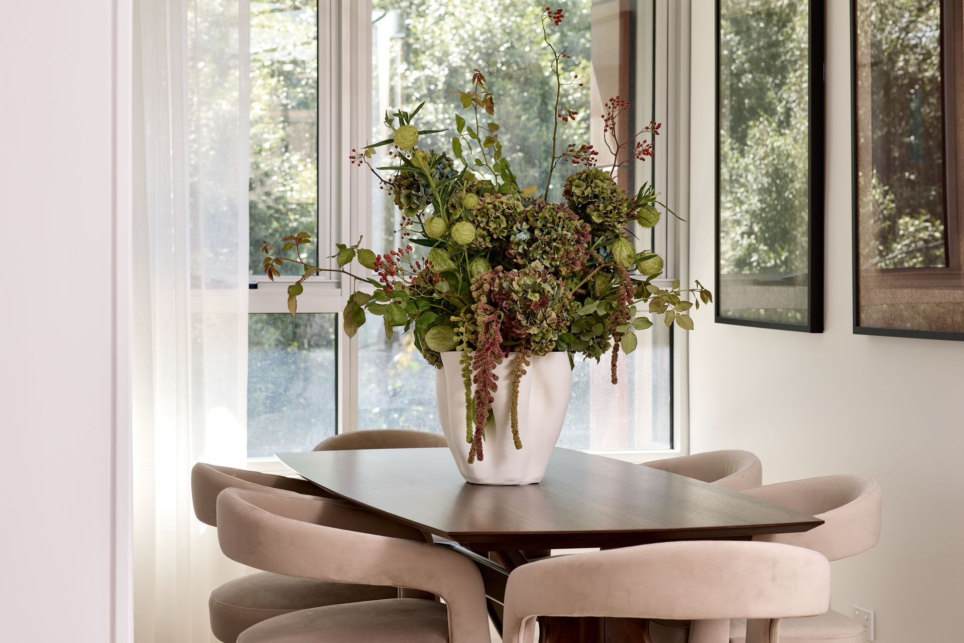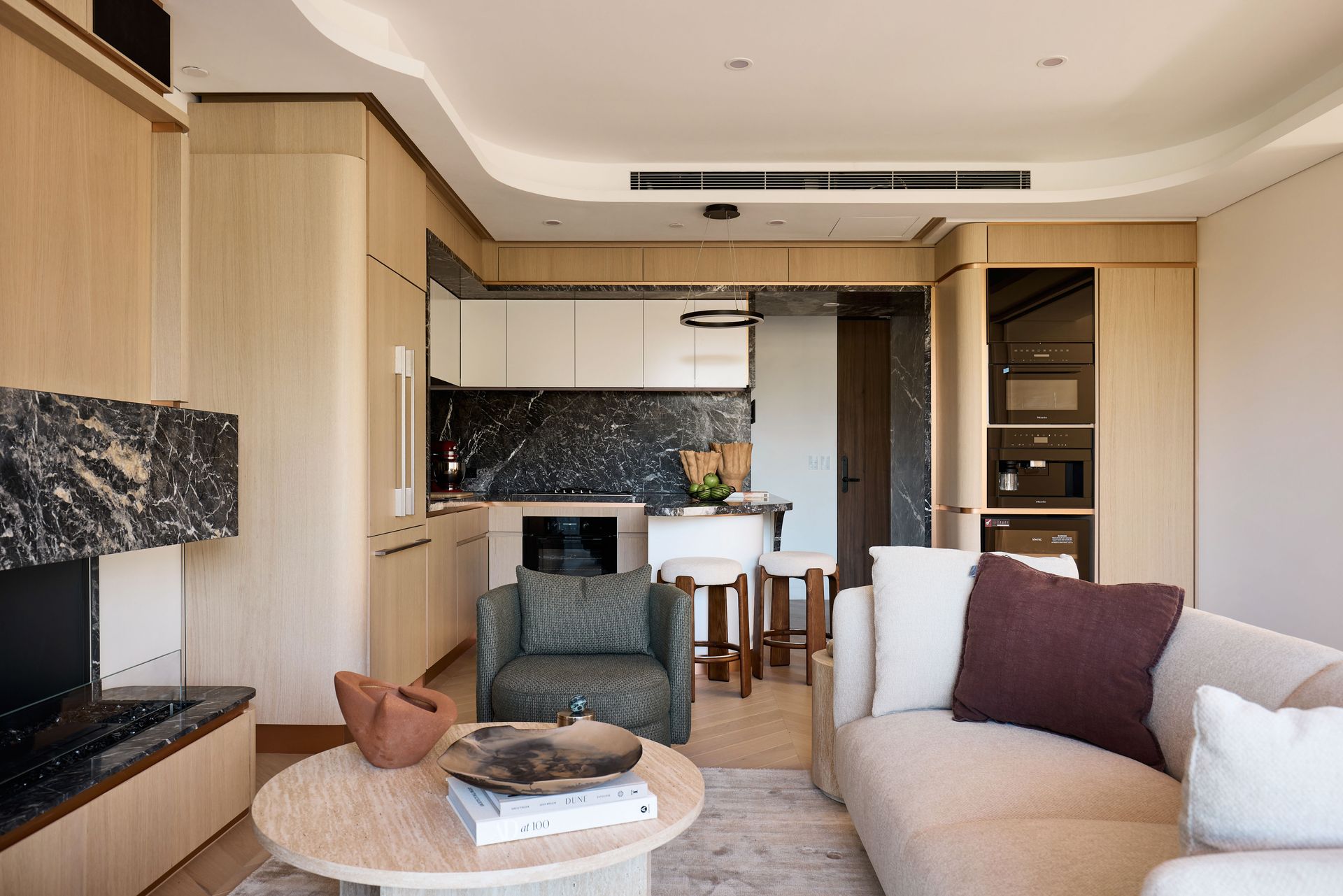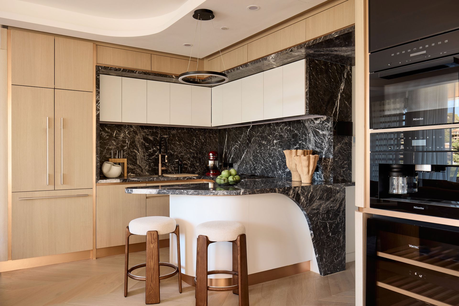 Step inside and the open-plan living, dining and kitchen area sets the tone immediately. European oak chevron flooring, floor-to-ceiling glazing and a built-in linear gas fireplace clad in Grigio Carnico marble anchor the space, while the classic seating and a round travertine coffee table keep the feel warm and grounded. The dining area is light-filled with sheer curtains softening the treetop light throughout the day. Control4 home automation manages lighting and motorised blinds, with a Triad speaker system integrated throughout. The kitchen sits just off the living area, finished in the same dark Grigio Carnico marble across benchtops and splashback, with Havwoods veneer joinery and the full Miele suite, oven, microwave, coffee machine, dishwasher and induction cooktop, alongside a Fisher & Paykel integrated fridge, Vintec wine fridge and Zip filtered water tap. Step out to the private terrace and the city views open up, with outdoor seating already in place. The master bedroom is a genuine retreat, a king bed sits beneath a sculptural pendant light, with floor-to-ceiling glazing framing the surrounding canopy. The open ensuite behind a curved glass partition features dark marble floor to ceiling, a freestanding bath positioned to catch the garden outlook, double vessel basins on a floating timber vanity, heated floors and heated towel rails. The second bedroom is bright and well proportioned with a double bed and smoked glass wardrobe. Both bedrooms carry the same Havwoods veneer joinery and smoked glass wardrobe detailing throughout. There is a second full marble bathroom with heated floors and heated towel rails, and a dedicated laundry with LG combined washer and dryer is tucked away neatly. Building amenities include a private, car-lift parking, CCTV and swipe card access throughout. This is complemented by full access to the building’s wellness suite, complete with a shared lap-capable swim spa and infrared sauna.
