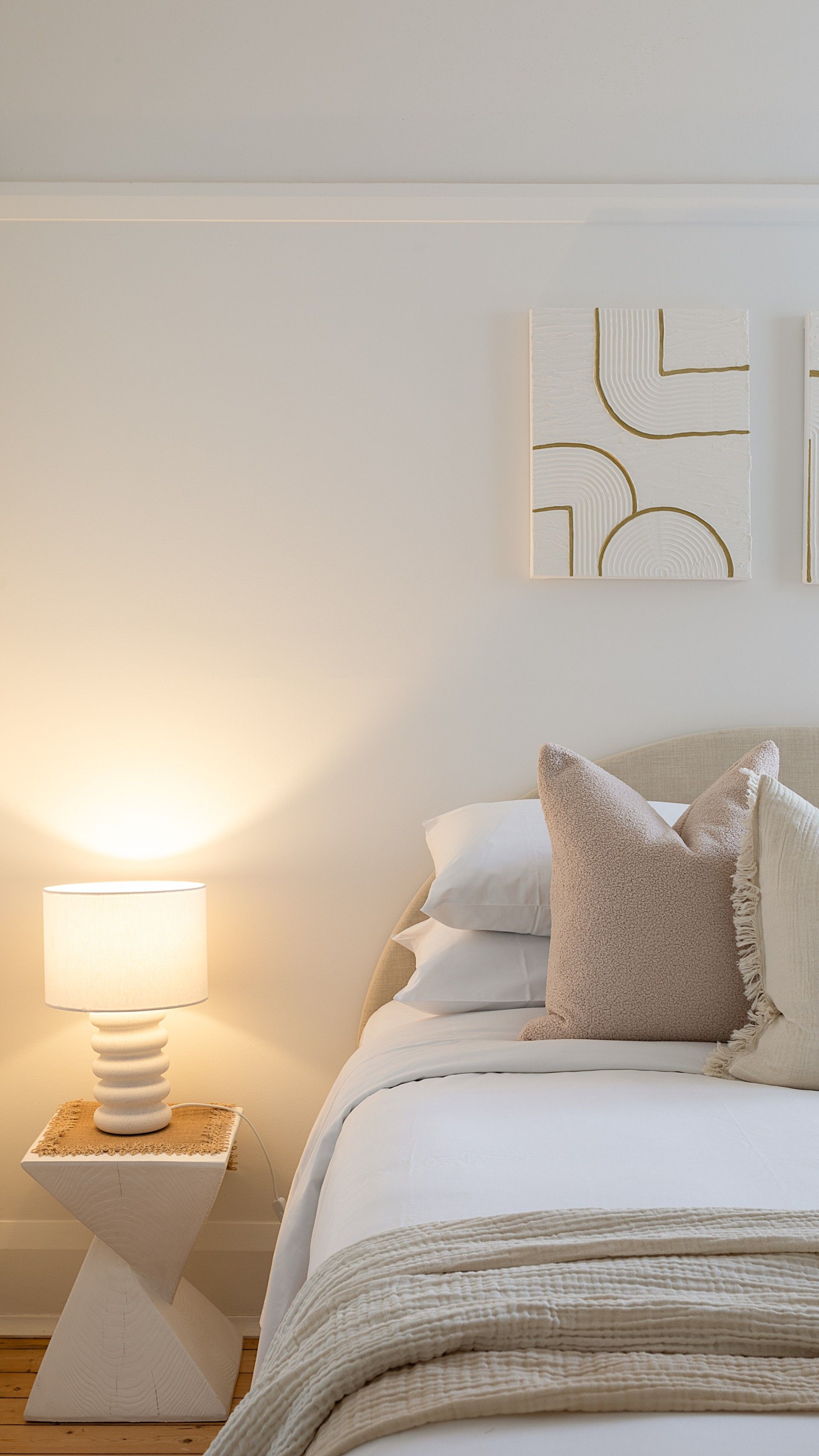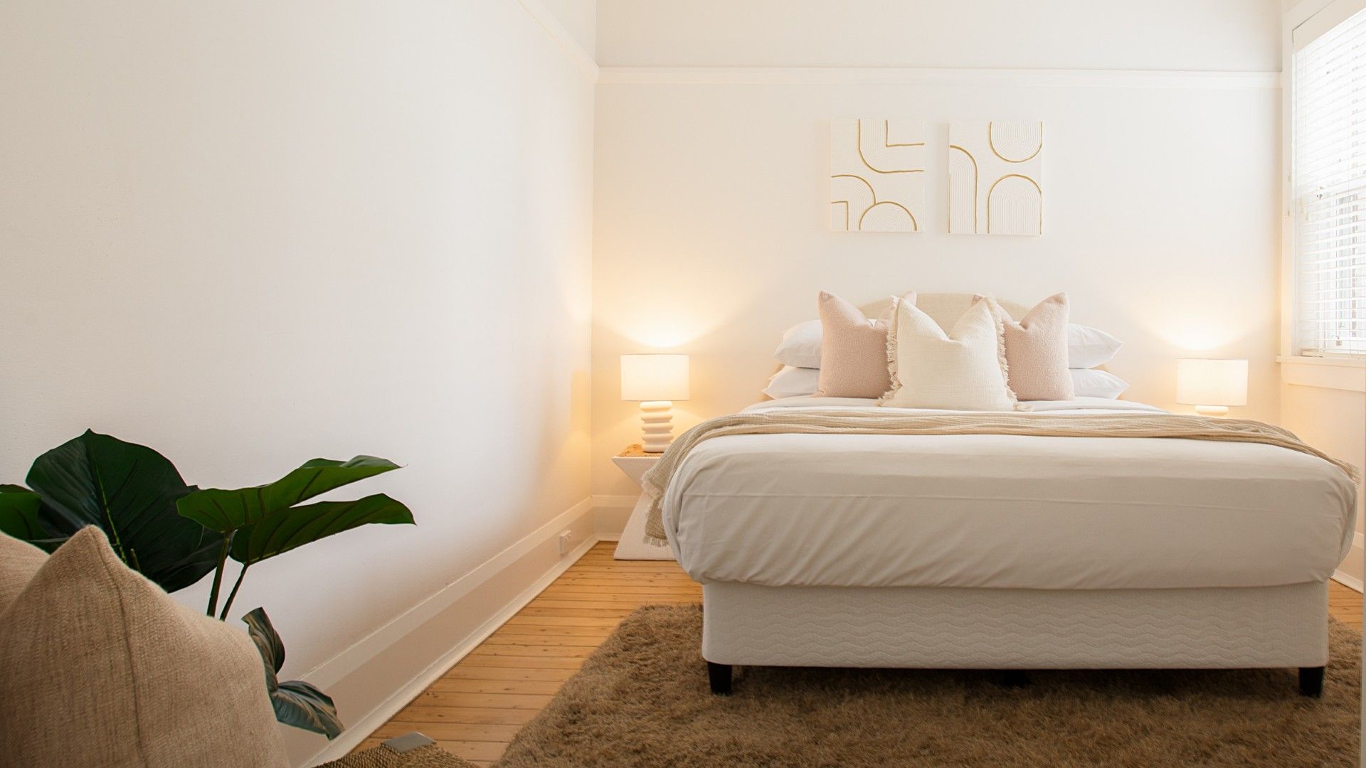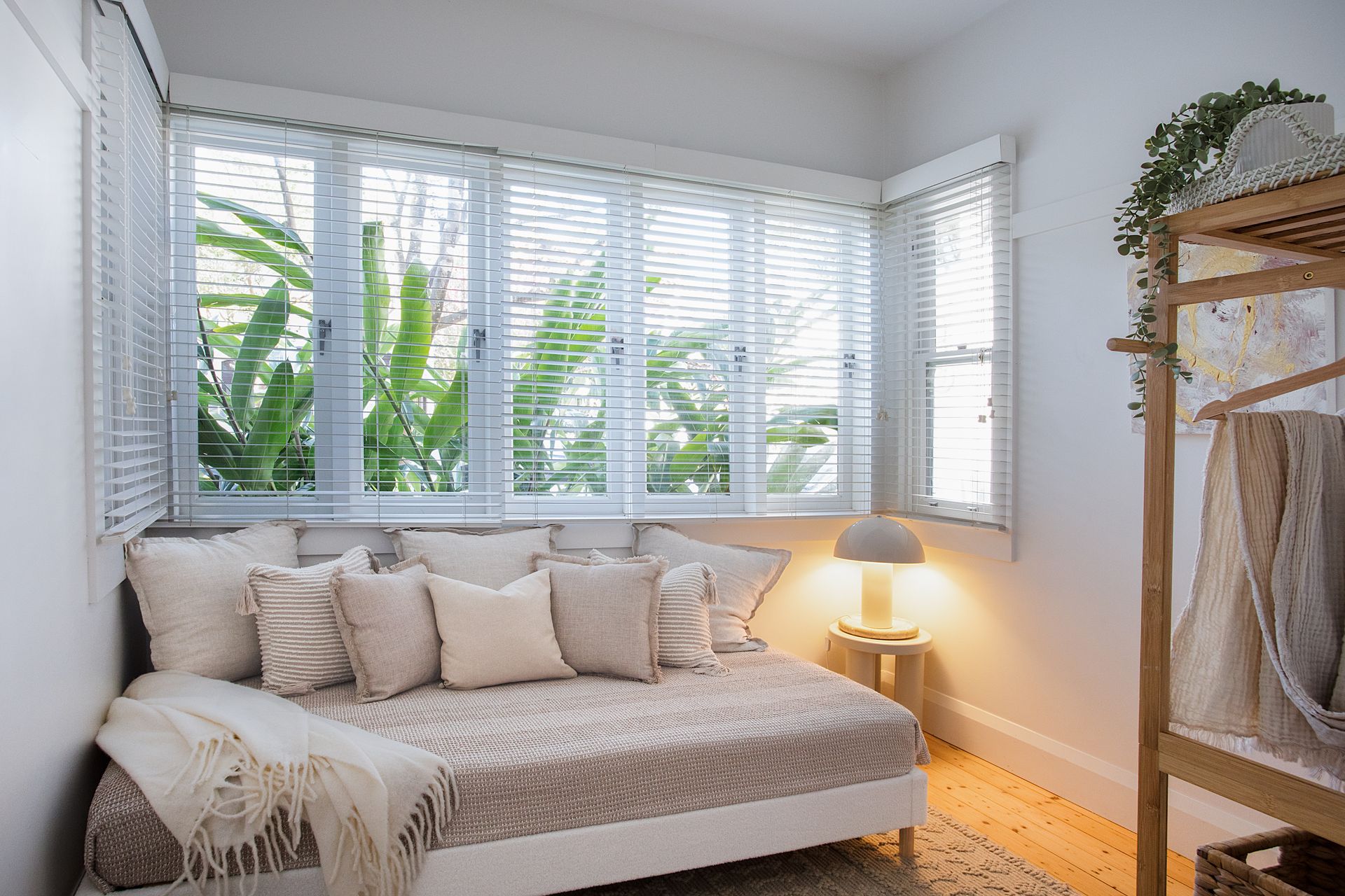 The main bedroom is a quietly beautiful room with white walls, warm lamplight from bedside tables on either side, a plush king bed dressed in linen and abstract art hung above the headboard. The second bedroom features a comfortable queen bed, while the third room works beautifully as a sleep out or reading nook with a full-sized single daybed surrounded by wide plantation shuttered windows looking into the garden greenery. The bathroom is clean and compact with a bath, overhead rain shower, glass screen and chrome tapware, with the European laundry tucked neatly behind a closed door alongside it.