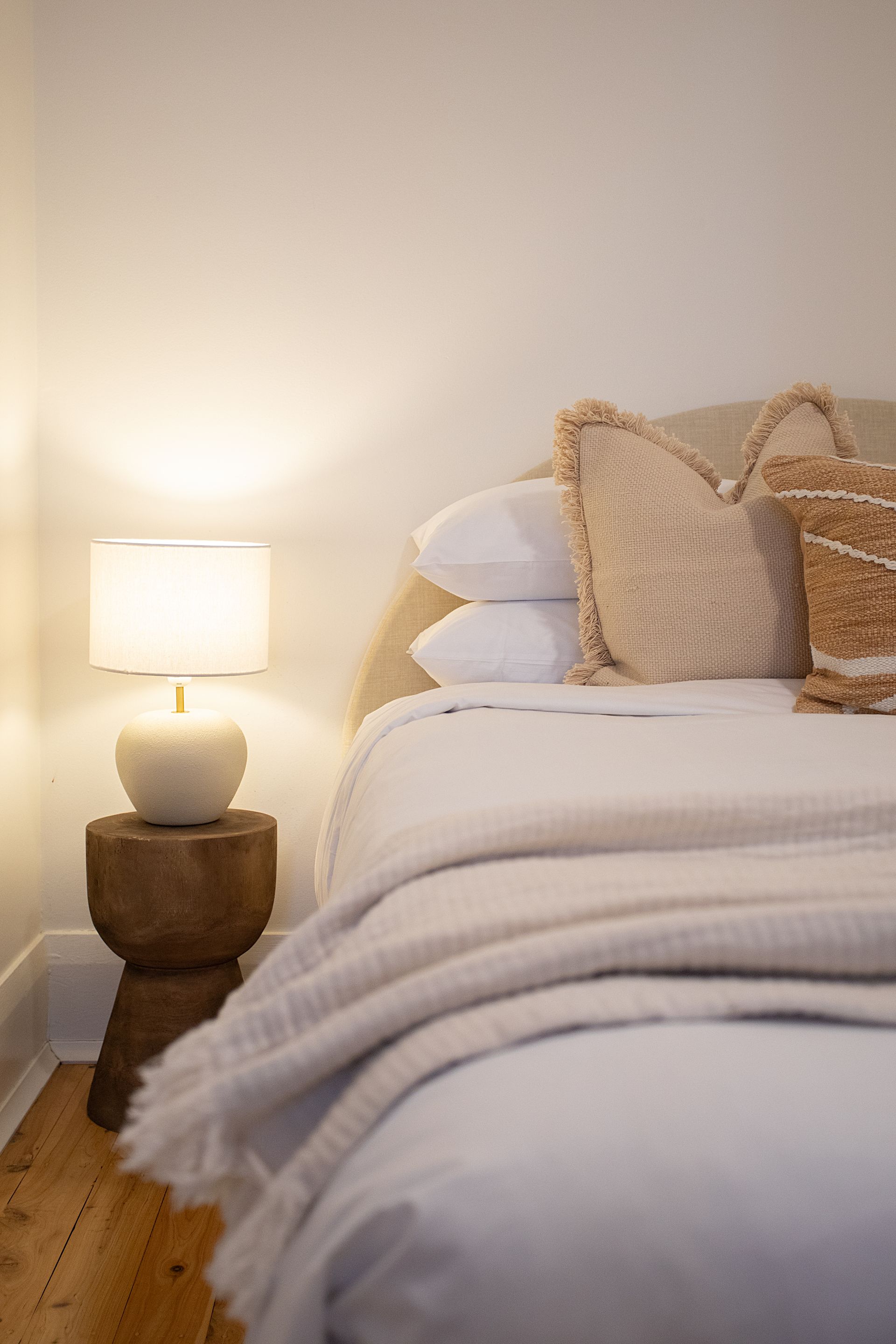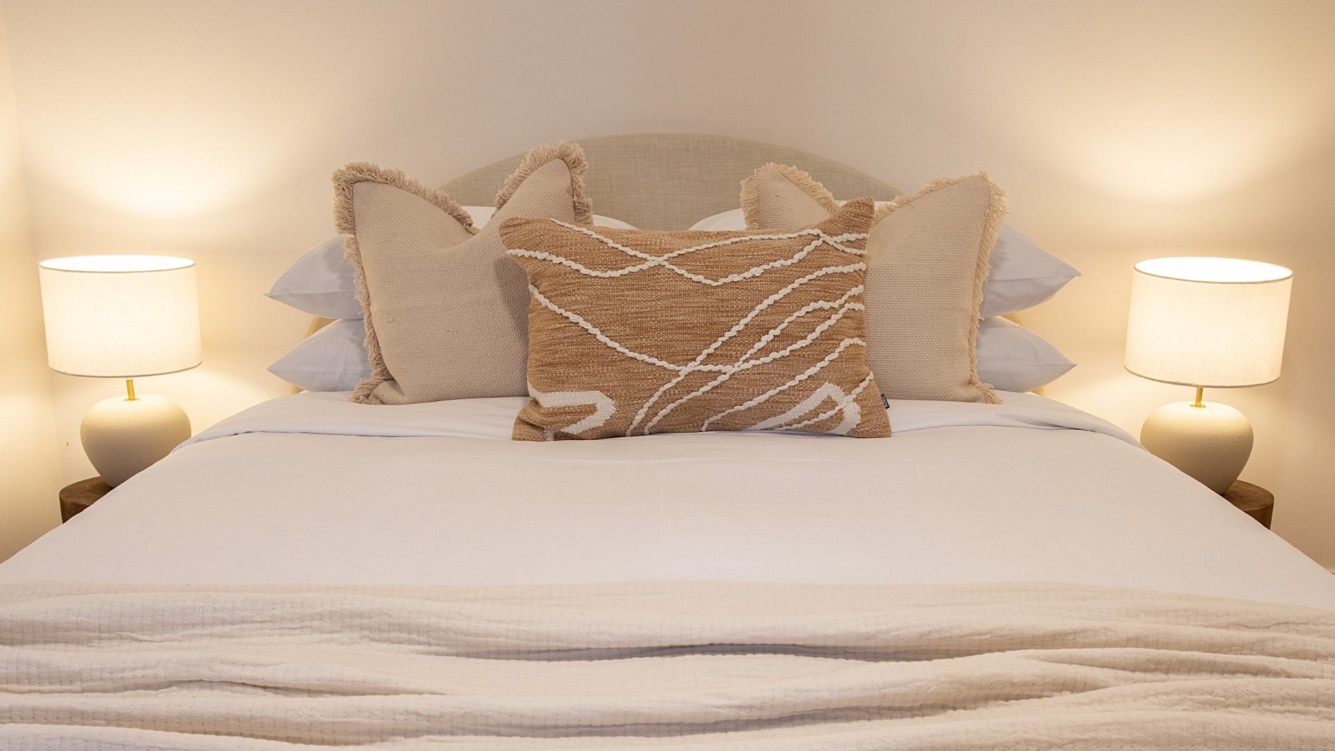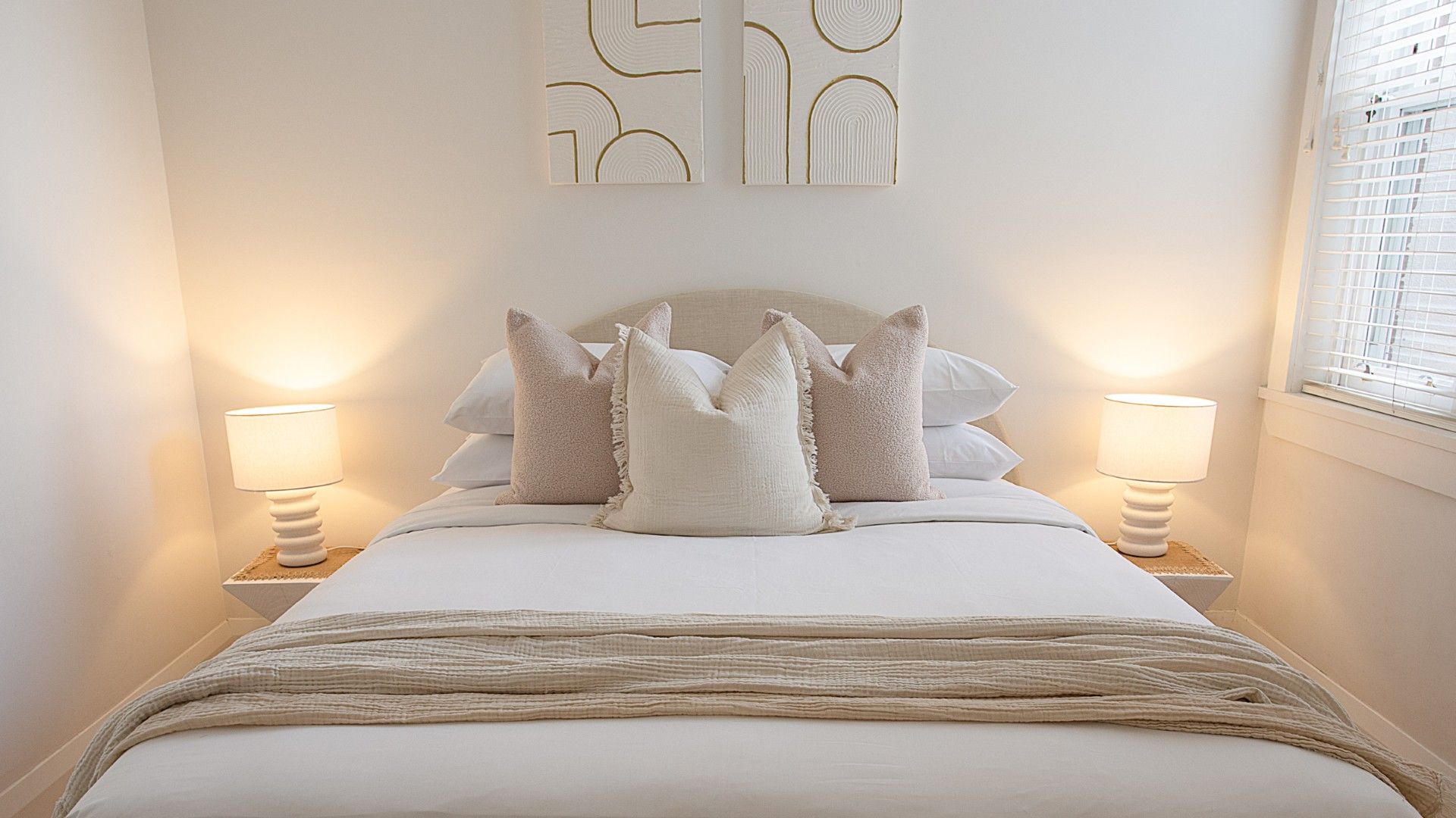The main bedroom is a quietly beautiful room with white walls, warm lamplight from bedside tables on either side, a plush king bed dressed in linen and abstract art hung above the headboard. The second bedroom features a comfortable queen bed, while the third room works beautifully as a sleep out or reading nook with a full-sized single daybed surrounded by wide plantation shuttered windows looking into the garden greenery. The bathroom is clean and compact with a bath, overhead rain shower, glass screen and chrome tapware, with the European laundry tucked neatly behind a closed door alongside it.