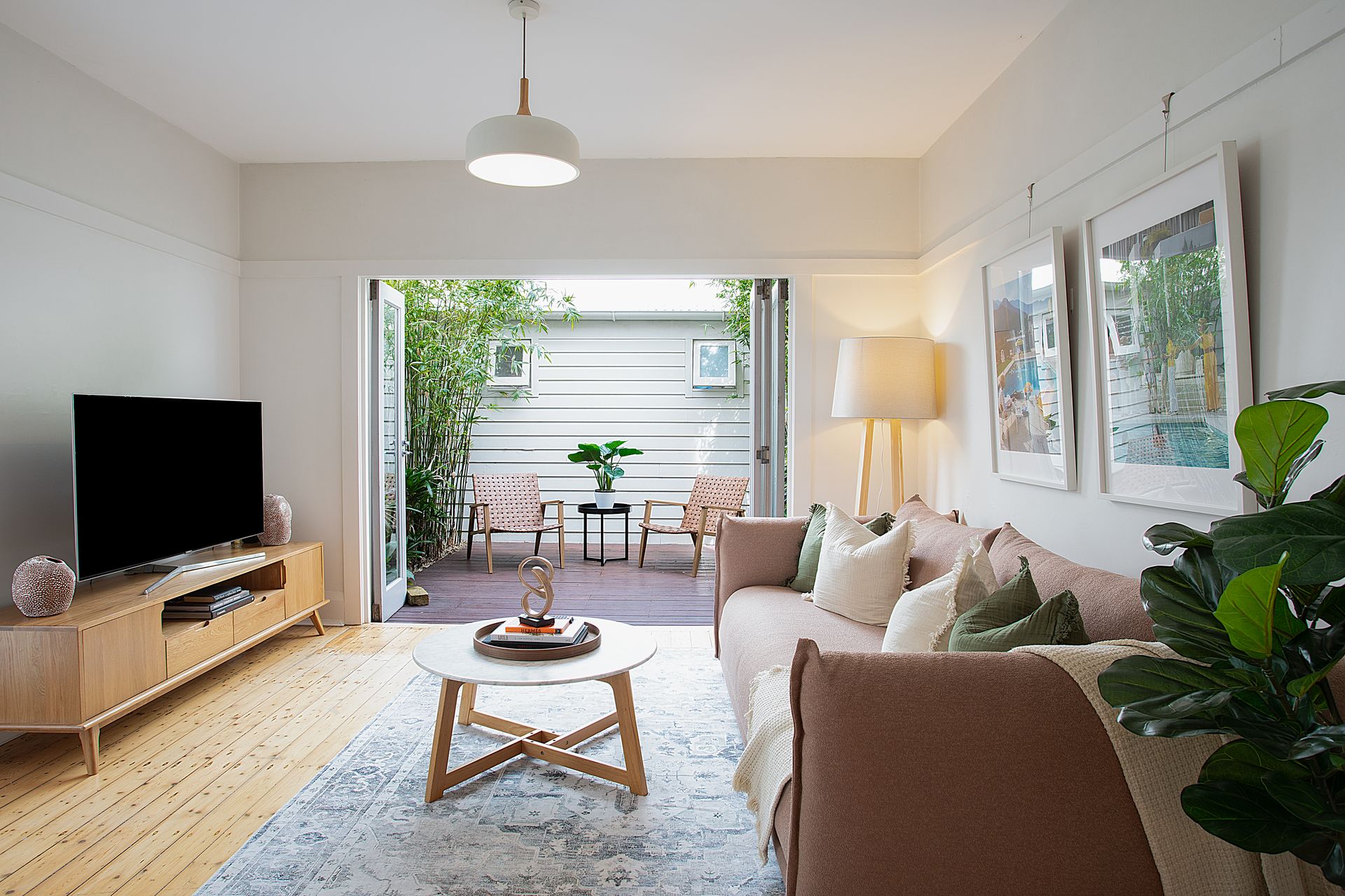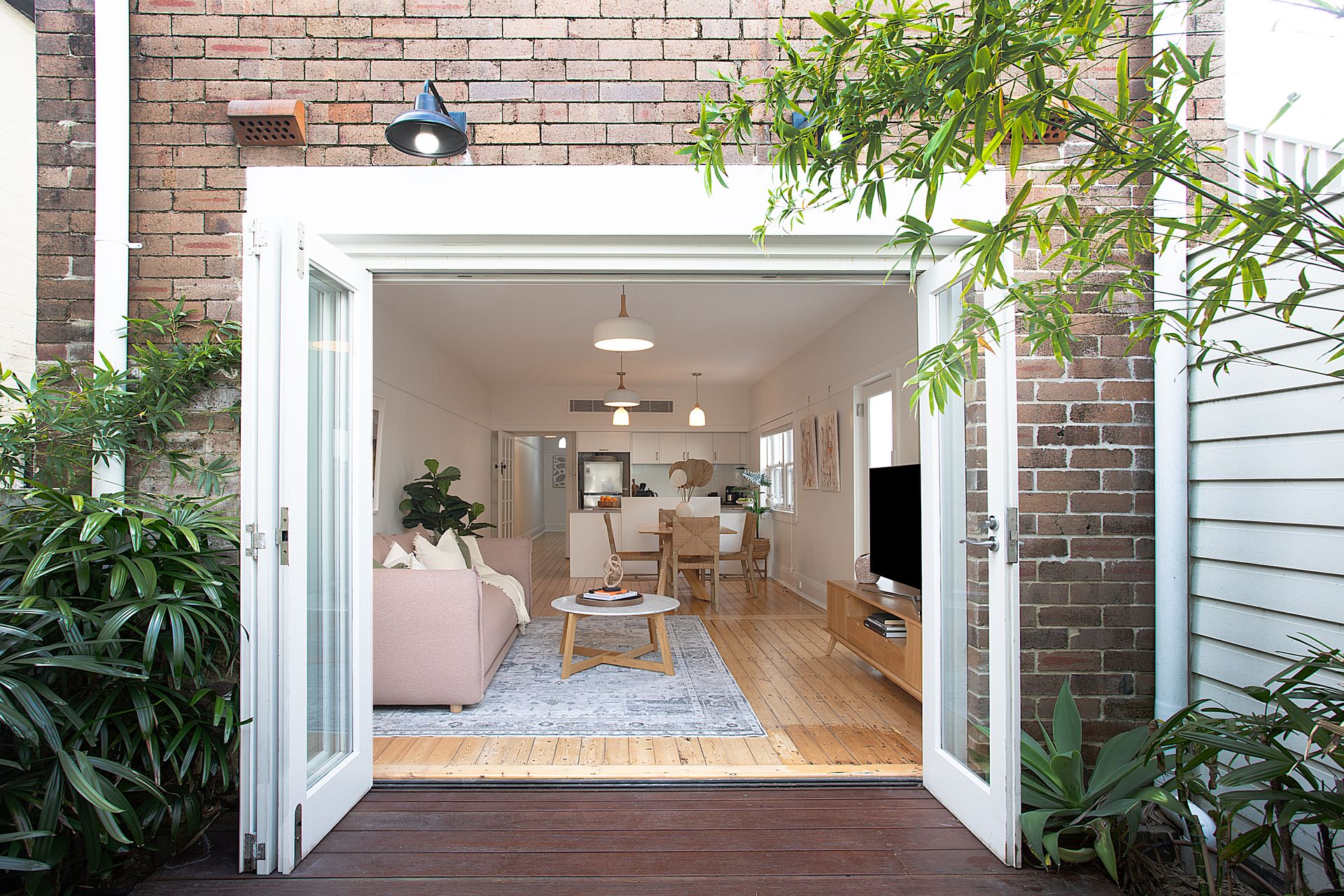 Step inside and the apartment opens immediately into a sun-filled living and dining area where original hardwood floors run the full length of the home. White shaker kitchen cabinetry lines the interior wall, paired with stone benchtops, a stainless steel oven and cooktop, integrated dishwasher and a Nespresso machine ready to go. A dining table for four sits comfortably between the kitchen and the living zone, while a pale timber entertainment unit with cane panel doors anchors the lounge. The whole back wall disappears entirely when you slide open the bifold doors, extending the living space out onto a private courtyard with timber decking, afternoon sun and a canopy of bamboo softening the boundary walls.